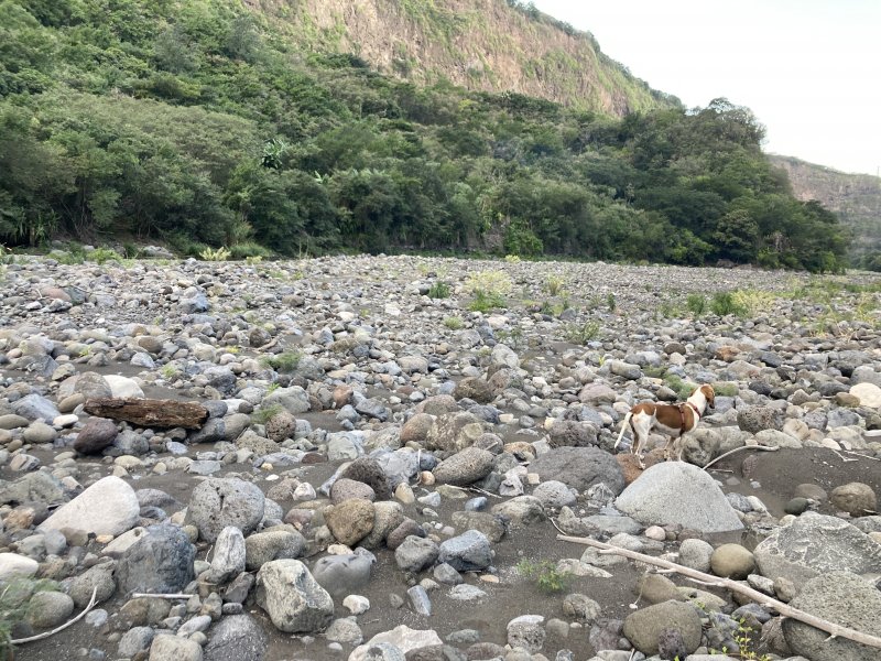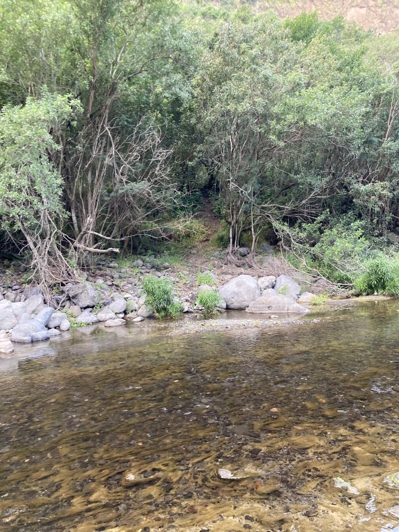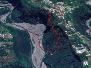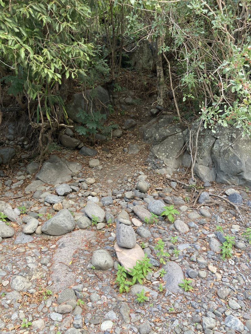 Intriguée par l’écart entre la trace et le chemin que j’ai parcouru la semaine dernière (commentaire du 02/06/2023), j’y suis retourné hier. J’ai encore commencé par l’Entre-Deux, plus pratique pour moi. Je suis descendue par le seul sentier bien marqué puis la piste forestière. Arrivée à la RN5 (voir commentaire et photos précédentes), j’ai marché sur la RN 5 jusqu’au point de départ de la fiche. C’est un petit parking jonché de détritus; on passe à droite d’une butte en terre (photo 1). Je suis descendue jusqu’au Bras de Cilaos par un sentier souillé par quantité de PQ usagé. Beurk. La trace m’a fait passer par le lit de la rivière, remanié par les crues. Rien de plaisant : on est très près de la RN 5 et les bruits des nombreuses voitures, on marche sur des gros galets ou on chemine dans la végétation qui a pris pied à nouveau -photo 4. Les photos 2 et 3 montrent l’endroit où j’ai déchaussé pour traverser la Bras de Cilaos en suivant la trace puis remonté pour retrouver la piste. J'ai croisé le propriétaire des lieux, un fan de chiens sympas. Il m’a appris que l’îlet à Rolland, une bande au dessus, cette piste et tout ce qui va jusqu’au Bras de Cilaos sont propriété privée. Il est très gracieux, tolère les passages des randonneurs et traileurs, mais se plaint des vols de fruits et des personnes qui font leurs besoins n’importe où. Il pense même clôturer à force d’incivilités. (A la décharge de ceux qui se servent en fruits: comment savoir que c'est privé?) Le propriétaire confirme qu'il n'y a plus qu'un sentier dans la forêt. Je lui ai demandé si la grotte emménagée du commentaire de JP Tang-Taye était toujours active, et il m’a fait visiter. Génialissime ! Donc pour ceux que ça intéresse: la grotte peut coucher jusqu’à 25 personnes, l’eau de la douche est chauffée au bois, on peut soit cuisiner soi même au feu de bois ou lui commander les repas. Je ne sais rien du prix, mais voici les coordonnées si ça vous intéresse: Espace Privé Îlet à Rolland, 0692845383.