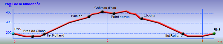 Le minuscule Îlet Rolland, situé à deux pas du Bras de Cilaos, a toujours été un lieu de passage pour les marcheurs venant de la route de Cilaos et voulant monter à l'Entre-Deux sans avoir à effectuer un long détour. Le sentier, autrefois large et bien entretenu, est devenu une misérable sente envahie de toutes sortes de plantes. Fort heureusement, le propriétaire du lieu passe régulièrement mais n'a pas le temps de les couper toutes. La trace se suit donc sans trop de problème mais le plaisir a disparu. Inutile de venir spécialement pour le parcourir. En revanche, il est toujours utile de l'emprunter pour d'autres circuits comme le tour de l'Entre-Deux ou, plus difficile, la montée par le sentier Bayonne à partir du Bras de Cilaos. Quelques éboulis sans danger et des arbres en travers ne seront vraisemblablement jamais nettoyés. Une fois parvenu au château d'eau, il est conseillé de marcher jusqu'à la route principale pour admirer le Dimitile, difficile à deviner dans la montée trop touffue. Comme la boucle présentée sur l'ancienne fiche n'est plus possible, le retour s'effectue par le même itinéraire.