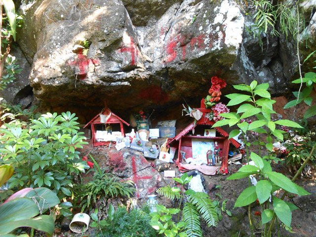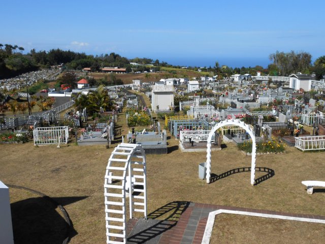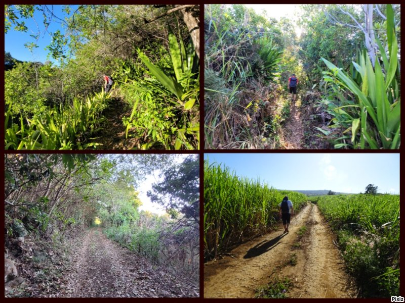 La randonnée débute au désormais classique radier utilisé pour les randonnées vers le Nord en longeant au plus près la Rivière d'Abord. Après s'être garé (de préférence au début de la Rue Azéma), repérer en rive gauche le sentier qui part sous la grosse touffe de bambous jaunes, longe le grillage de la déchèterie et redescend vers le lit de la rivière, très rocheuse à cet endroit. La boucle étant courte, on a largement le temps de rejoindre le fond de la rivière et admirer les arches naturelles (Photo 2) et nombreuses grottes. Des chiens très bruyants sont heureusement enfermés derrière un grillage. Les immenses cavernes situées en amont sont plus difficiles d'accès, surtout si certains bassins ne sont pas totalement évaporés (Photo 1). Le sentier caillouteux et ombragé sillonne toujours en rive gauche. Il se termine aux alentours des terrains de tennis à l'arrière du collège de Terrain Fleury. On emprunte alors une courte portion de la rue des Eucalyptus puis d'Evariste de Parny qui coupe un peu plus loin la route venue de la Petite Île et rejoint la zone sportive de Bel Air par la rue Kerveguen. Afin de ne pas suivre la route constamment, bifurquer à droite vers le Parc Marc Rivière s'il est ouvert (Photo 3). Si c'est le cas, cette très agréable balade ne prendra que quelques minutes supplémentaires (Photo 4). Poursuivre en descente vers les parkings du parcours de santé en zigzagant sur une piste sinueuse qui prolonge la balade dans la parc Marc Rivière. Les voitures et coureurs partent ici dans tous les sens, quels que soient l'heure et le jour de la semaine. Rattraper la route, partir sur la droite et retrouver le sentier de l'autre côté de la route, dans un virage, avant le radier. Durant plus d'un kilomètre, le sentier longe les rochers de la rivière d'Abord en rive gauche, au fond du lit puis en rive droite (Photo 5 et 6). Le sentier vient d'être remis en état par l'association des Petits Tamponnais Ruraux (mars 2019). Les ouvrages créés par les membres dans les années 2013 ont été emportés par les crues mais le nouveau balisage orange se voit de loin et il est difficile de s'égarer. On se retrouve vite près d'une cascade à sec pour changer de rive (Photo 8) et on entame une longue descente sur un sentier en bon état comportant quelques courtes portions raides et enracinées. Les derniers mètres empruntent le lit de la rivière avant d'arriver au radier, fin de la descente. Prendre à gauche vers la Pointe. La pente est raide dans les lacets qui remontent vers le village mais de courte durée. Profiter de cette balade en agglomération pour repérer l'ylang ylang (Photo 9), d'adorables cases typiques ou des jardins fleuris. Suivre ainsi la route principale sur 700 m à partir du radier et tourner à un embranchement vers la droite pour éviter le Chemin Auguste de Villèle. Un peu plus de 200 mètres plus loin, bifurquer sur le Chemin Papangues qui se termine rapidement dans les cannes à sucre (Photo 10). Suivre la piste principale qui se rapproche plus loin du rempart de la Ravine Jean Payet. Au moment où la piste tourne fortement à gauche, filer tout droit vers le rempart en traversant quelques cannes marquées par les passages fréquents (Photo 12 - voir § ci-dessous). Le sentier de la Pente Gaétan débute très vite et plonge dans les chocas, poivriers et fougères vers la Ravine Jean Payet en frôlant un oratoire peint en rouge à la gloire de St-Expédit (Photo 15). Attention de ne pas glisser sur les ordures laissées là après la prière !!! Poursuivre vers le fond de la ravine sur un sentier agréable qui effectue quelques lacets dans les fougères (Photo 17). Une cascade à sec empêche de poursuivre vers l'aval (Photo 18). En amont, quelques bassins et une autre petite chute à sec peuvent également se rejoindre aisément sur les plaques lisses et parfois glissantes. Le sentier, plus étroit, se poursuit légèrement sur la gauche pour emprunter quelques courts lacets caillouteux puis grimper en forte pente rectiligne vers une piste bordant un champ de canne. Partir sur la gauche, sous les longanis et manguiers, jusqu'au prochain croisement. Débuter sur une large piste au fond herbeux qui passe près des champs de canne à sucre (Photo 19). Elle longe également de vastes champs d'ananas (Photo 21). Cette piste, très fréquentée devient terreuse mais reste facile et agréable, surtout qu'elle permet de splendides panoramas vers le Dimitile (Photo 20). On parvient ainsi sans effort à la Route Hubert Delisle près de la Chapelle Ste-Thérèse, désaffectée en raison sans doute de sa proximité avec la route (Photo 23). Attention à la circulation en longeant la route qui franchit par deux longs lacets la Ravine Jean Payet et le Bras Leclerc. Le mieux consiste souvent à marcher sur la large murette quand le haut n'est pas arrondi, donc glissant. Après la deuxième ravine, très profonde, plusieurs routes partent sur la droite. Marcher jusqu'au Chemin de la Bergerie qui traverse les cannes à sucre. Bifurquer à la première piste à gauche et marcher en direction de quelques habitations isolées (Photo 26). Après avoir rejoint la Rue des Palmiers, ne pas manquer la Rue des Saules Pleureurs qui part sur la gauche en direction de l'immense cimetière du Tampon (Photo 27). A la fin de la rue, tourner à droite et passer le prochain rond point en direction du véhicule. Cette route qui comporte palmiers et champignons de bougainvillées est superbe en période de floraison et finit agréablement cette portion de bitume (Photo 28).