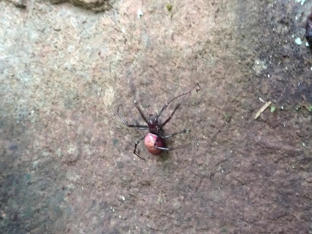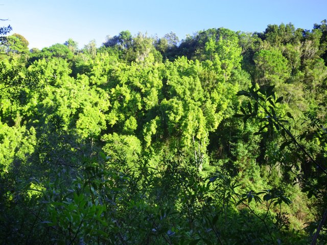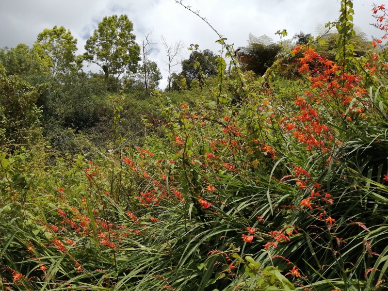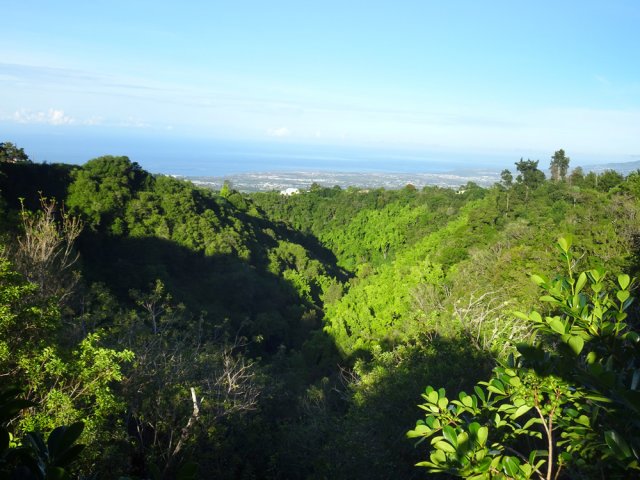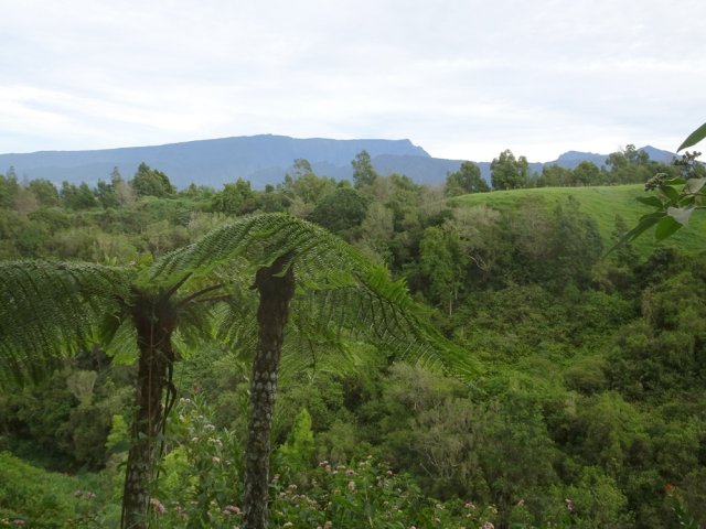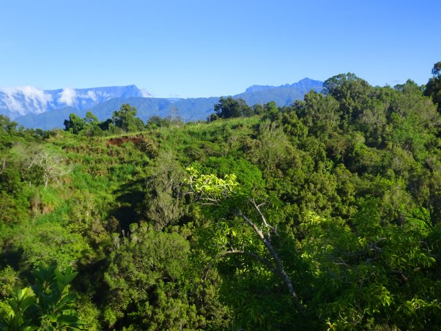 Si on connait bien le circuit de la Foulée de la Fraise à partir du Domaine Vidot, une partie de celui présenté ici est beaucoup moins fréquenté. Il longe la Ravine des Cafres presque jusqu'à sa source. En regardant la carte on remarque qu'entre l'Espace Vidot et le haut du circuit, il n'y a que 400 mètres de montée. Hélas, c'est sans compter sur la quinzaine de dents de scie qui parcourent le flanc de la falaise, doublant facilement le dénivelé (la dénivelée pour les puristes). On rencontre peu de panoramas tout au long du parcours et une bonne partie du cheminement s'effectue à l'ombre. On voit les bois de couleurs quand le regard porte sur le fond de la vallée mais c'est parce qu'ils dépassent des immensités recouvertes de goyaviers, bringeliers, galaberts ou vigne marronne. On remarque surtout de très hauts champacs (Magnolia chapaca) dont certains atteignent des tailles respectables. Le sentier est souvent de bonne qualité, bordé de rochers imposants, et semble régulièrement entretenu, surtout à l'époque de la course de la Fraise. Pour les randonneurs non arachnophobes, guetter sous chaque rocher rencontré, et il y en a beaucoup, les bibes rouges (Nephilingis borbonica) qui peuvent attendre des jours entiers l'insecte qui viendra faire vibrer les fibres de sa toile. Attention toutefois au venin nécrosant et aux toiles de ses concurrentes pouvant encombrer le sentier au petit matin !