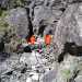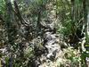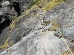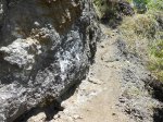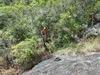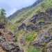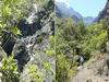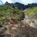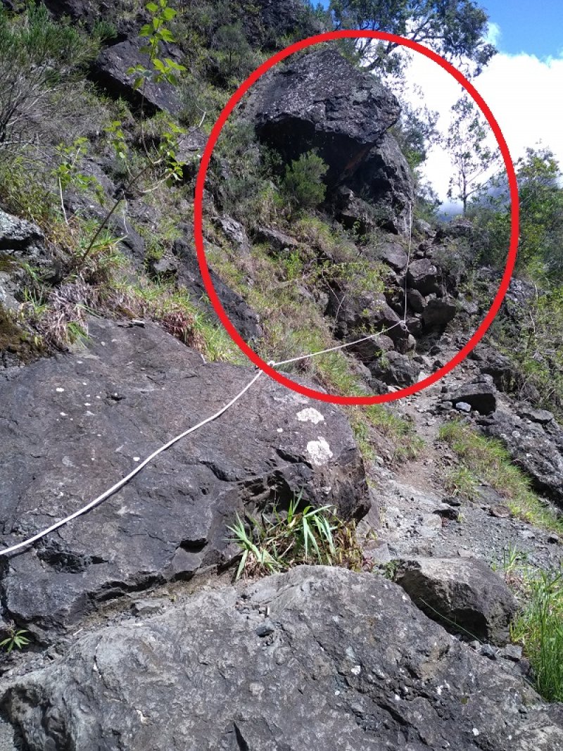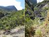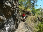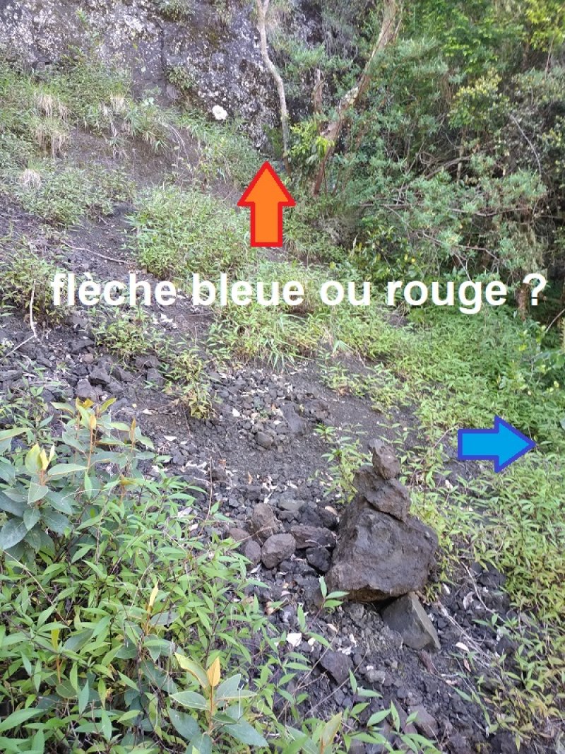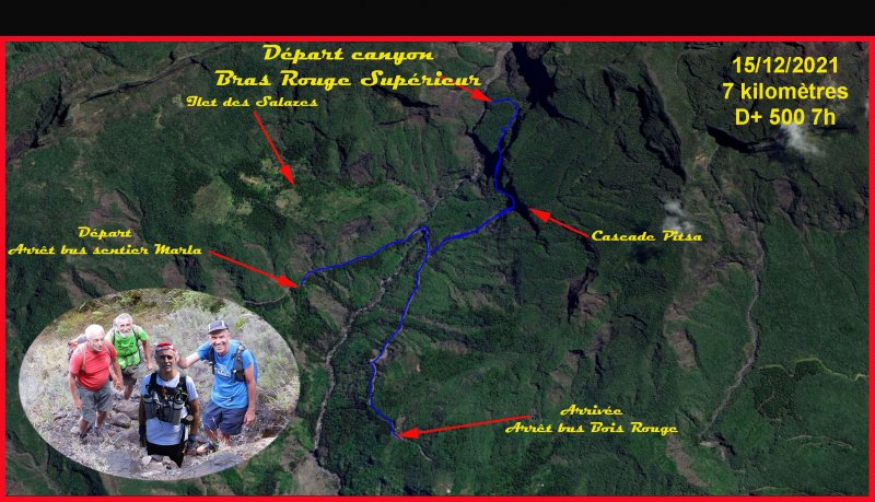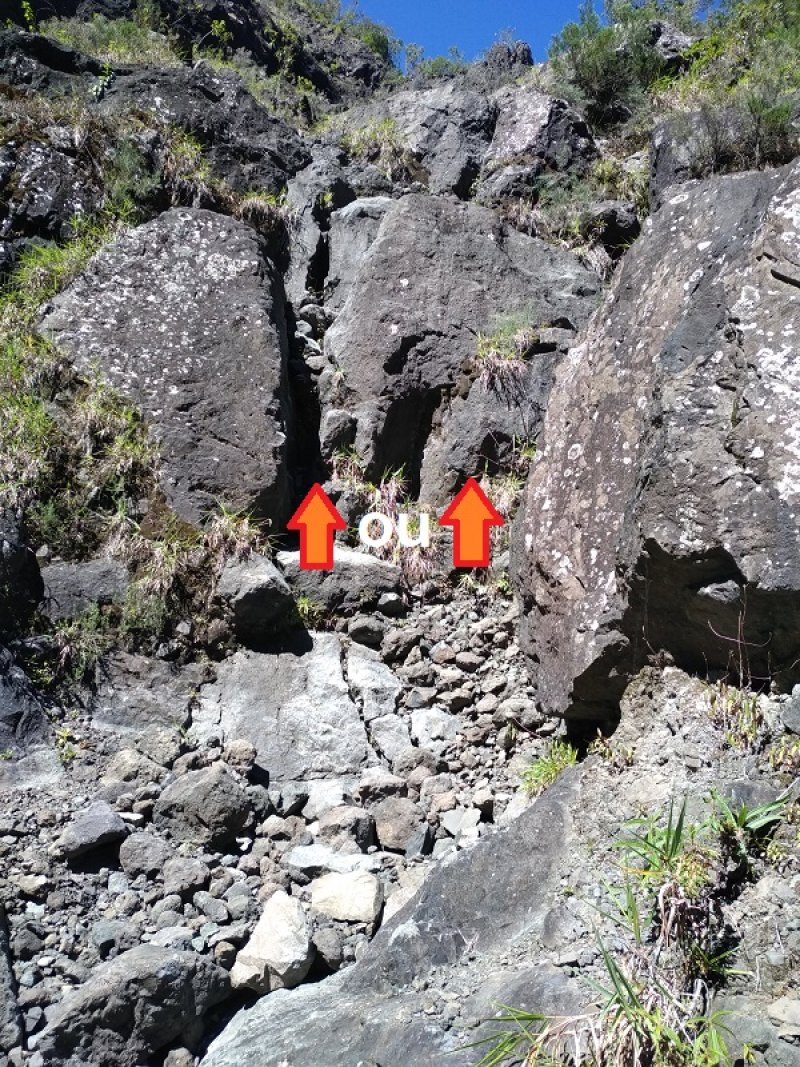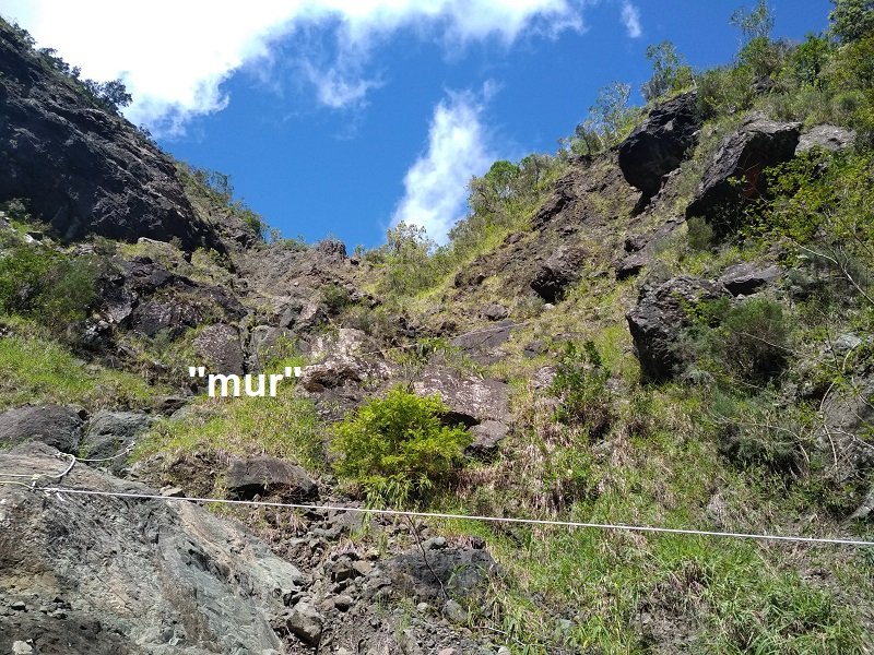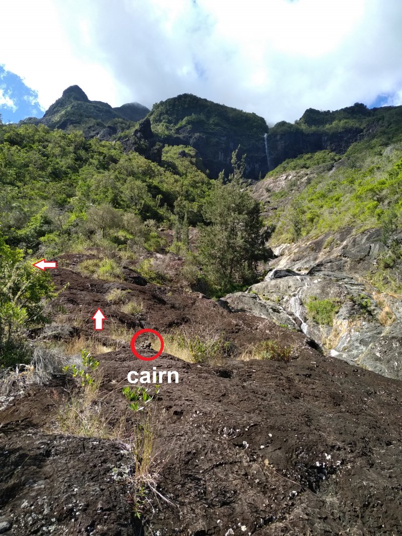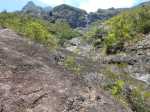 La montée débute au pont sur le Bras Rouge, entre Cilaos et l'Îlet à Cordes. Avant de partir, profiter du spectacle des cascades qui coulent ici de toutes parts (fin de la ravine des Salazes, de la Ravine Pitsa, Bassin des Salazes, etc.). Des canyonistes pendent même parfois au bout de longues cordes fixées au parapet pour rejoindre ces cascades bruyantes. Le spectacle est assuré, surtout pour les craintif du vertige. Revenir à pied vers Cilaos et rejoindre en quelques mètres le départ du sentier qui mène à la Ravine Pitsa à gauche de la route. On se retrouve près du petit torrent au pied d'une paroi oblique de lave (Photo 1). Le rocher est tellement aride qu'on n'y distingue aucun sentier. Pourtant quelques roches ont été détachées pour créer un semblant de marches. Grimper cette courte distance dénudée en cherchant le meilleur passage. Là-haut, en se retournant, on distingue très bien la route de l'Îlet à Cordes et la vallée du Bras Rouge en amont du pont (Photo 3). Le spectacle des toboggans est superbe à droite (Photo 2) mais c'est à gauche qu'il faut repérer un cairn sur un replat du rocher (Photo 4). Si le cairn vient à disparaître, chercher simplement le sentier dans la végétation basse. Un deuxième cairn confirme le bon itinéraire. On se retrouve très vite à la lisière boisée. Le sentier, étroit et de très bonne qualité, bordé de jouvences, serpente sous les bois de couleurs (Photo 5). Puis il grimpe de plus en plus fortement sur les roches et racines dans un univers boisé envahi de toutes sortes d'orchidées et de belles fougères (Photo 7) On marche sur la crête étroite mais sans peur du vide, éloigné et protégé par la végétation (Photo 8). On longe les premières barres rocheuses sur un sentier bien visible (Photo 9). Quand le sentier est étroit et en corniche, les premières cordes font leur apparition (Photo 10). Quelques trouées permettent de photographier les cascades de la Ravine des Salazes sans trop s'approcher du bord (Photo 11). On croise ça et là de beaux troncs de bois de rempart. Certaines portions sableuses et glissantes ne sont pas protégées et demandent plus d'attention (Photo 12). Plus haut c'est un pic rocheux qu'on rencontre au début d'une courte descente (Photo 18) avant de retrouver les bois de couleurs et des tapis d'orchidées ou de fougères tam-tam (Photo 15). On vient de bien s'élever et les panoramas sur la vallée se sont agrandis. On distingue le Nez de Bœuf vers le Col du Taïbit et on domine maintenant les cascades de la Ravine des Salazes (Photo 14). Une longue corde dans les jouvences indique la fin proche de l'itinéraire (Photo 16). On se retrouve rapidement face au cirque du Bras Rouge venant des Salazes, ce formidable effondrement du Gros Morne. Sur la gauche, vers Cap Bouteille, une immense fissure laisse imaginer la cascade en cas de crues. Le spectacle est grandiose et peut très bien se terminer ici pour des familles qui prendraient le risque de venir avec des enfants. Mais de belles cordes fixées à la paroi glissante donnent envie d'aller voir plus loin le spectacle de l'eau qui se précipite beaucoup plus bas (Photo 17). Par temps sec, on peut très bien marcher sans utiliser les cordes mais il est fortement conseillé de ne jamais les lâcher car, même sec, le sol sableux peut très bien partir sous la semelle (Photo 20). Le sol est caillouteux mais suffisamment large pour ne pas hésiter. De plus, les cordes servent de sécurité et de fil d'Ariane (Photo 21). Le plus long tronçon sur terrain rocheux et glissant à 45° doit se franchir prudemment, surtout si on regarde les cascades plutôt que ses pieds (Photo 23). Une fois ce bout de falaise franchi, on se retrouve sur une plateforme rocheuse assez plate d'où l'on peut admirer les chutes, bassins et toboggans du Bras Rouge (Photo 25). Le spectacle vient surtout de la haute cascade que les professionnels rejoignent par de nouveaux circuits glissants et équipés (Photo 26). On ne voit pas la totalité de la cascade mais le spectacle de la rivière vaut à lui seul le déplacement (Photo 27). La dernière corde, qu'on n'utilise sous aucun prétexte, est située près d'une plateforme herbeuse qui peut très bien servir de lieu de repos avant de redescendre. Quel pique-nique rare que de manger en regardant ces paysages uniques ! La descente est très rapide par le même sentier jusqu'au cairn en marquant le début (Photo 28).