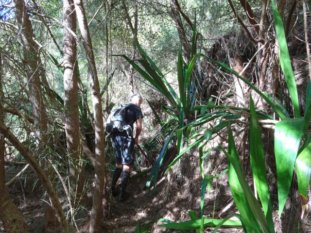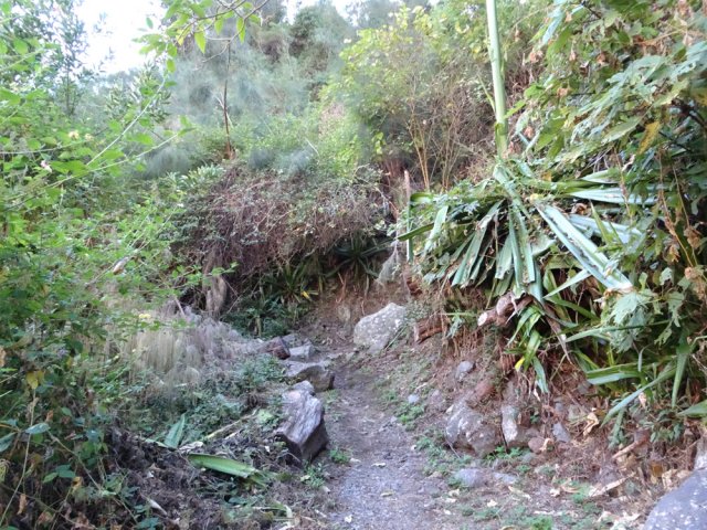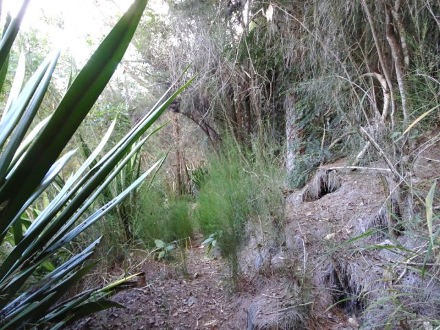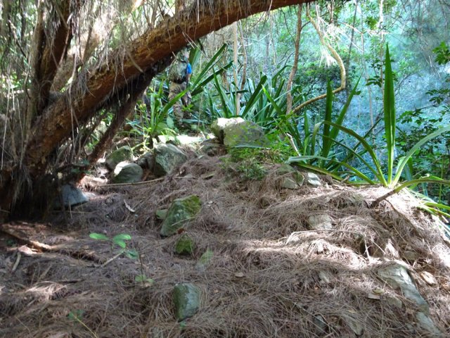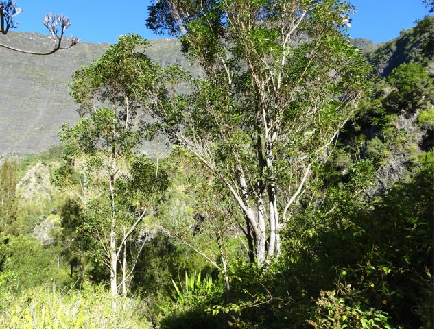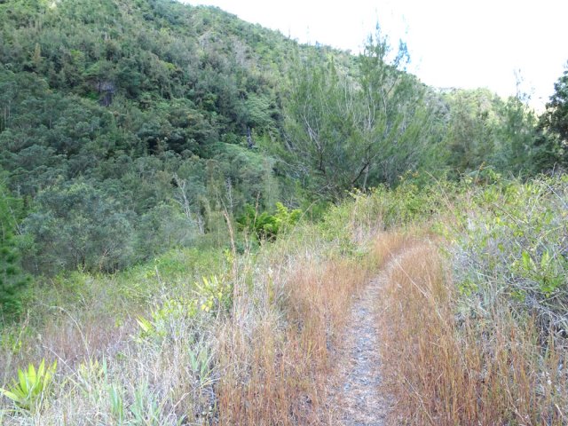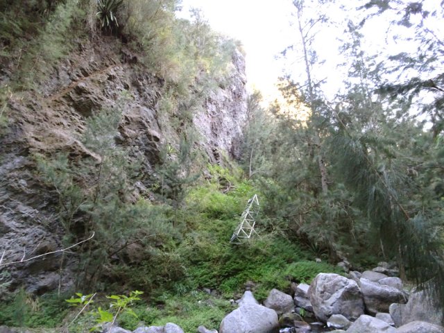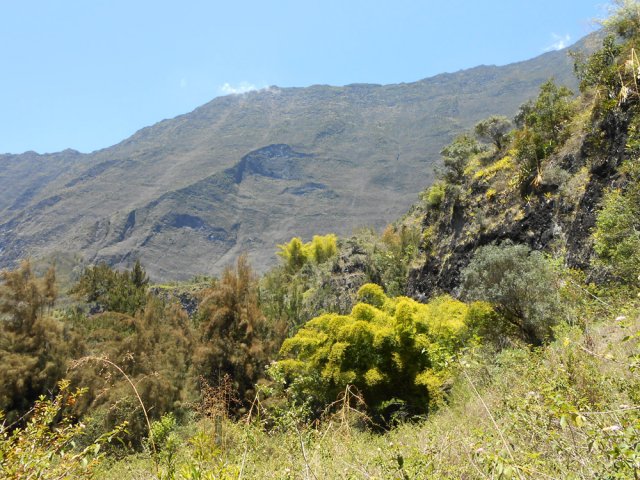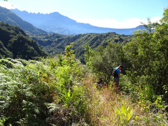 La randonnée débute au plus près du Chemin du Bras de Saint-Paul qui comporte très peu de lieux de stationnement. Préférer les abords du Chemin Figaro. Entamer la descente le long de la petite route qui permet de rencontrer des habitants très sympathiques. Plus bas, on parvient à un escalier à quelques mètres du départ officiel du sentier, symbolisé par un poteau de l'ONF. Un regard avant de partir permet d'admirer les paysages vers le Grand Bénare, la forêt du Tapcal ou les plateaux anciennement cultivés de l'Îlet Sonjes (Photo 1). Le sentier débute dans les pierres et la terre par quelques lacets et se poursuit longuement sur un sol bétonné qui recouvre une canalisation d'eau (Photo 2). Il comporte escaliers neufs et soutènements récents avant de reprendre son aspect de sentier caillouteux (Photo 3). Il descend assez rapidement par des escaliers en pierre, des lacets ou des portions empierrées (Photo 4). A l'approche du Bras de Saint-Paul, il s'aplanit dans le bois de filaos de plus en plus envahi de treilles de chouchous (Photo 5). Pas de difficulté pour traverser le petit torrent dont le lit est totalement couvert de grosses roches (Photo 6). On arrive à un nouveau poteau de l'ONF, au croisement de plusieurs sentiers. Celui de droite part en direction du captage du Bras de la Vierge, celui de gauche vers le sud. On se plait à imaginer que le sentier sera comme celui que l'on vient de descendre. Hélas, on voit très bien qu'il n'est plus entretenu et risque de disparaitre rapidement. Il débute dans les cailloux et grimpe un peu en direction d'une zone assez dégagée où l'on aperçoit encore de l'herbe (Photo 8). Les invasives sont partout et s'accommodent mal du terrain aride. On arrive très vite sous les filaos mais les chocas commencent à empiéter tout comme les jeunes filaos (Photo 9). Plus loin, ce sont les jouvences qui cachent les pierres ou aspérités du sol, le sentier descend en direction du Bras de Saint-Paul depuis que la passerelle située contre la falaise a chuté dans le vide (Photo 10). L'ancien sentier passait au sec, celui-ci emprunte plusieurs fois des gués en général faciles à franchir avec un niveau d'eau bas (Photo 11). Lorsque l'eau est plus haute, ce qu'on remarque aux traces blanches laissées sur la roche, il faut prêter plus d'attention à ces traversées (Photo 12). Bien suivre les balises blanches peintes sur les galets et trouver, en rive droite, le début du sentier qui remonte en direction de l'ancien tracé. Après une forte pente, il passe sur une passerelle qui semble bien fixée puis remonte à nouveau sur le plateau (Photo 13). La végétation est touffue, le sentier visible et les paysages agréables sur les plateaux qui abritaient des îlets (Photo 14). Un dernier poteau de l'ONF indique la fin du trajet officiel et demande de faire demi-tour. Ne pas prendre l'ancien sentier de droite coupé par un éboulis mais celui de gauche, plus discret partant en direction de grands arbres et permettant d'apercevoir le haut de l'Îlet Sources (Photo 15). Le sentier, encore bordé de pierres sèches qui se voient de moins en moins, descend toujours plein sud (Photo 16). On parvient à un ancien îlet impossible à deviner s'il n'y avait pas cette cabane en tôle qui semble encore en bon état (Photo 17). En tournant le dos à la cabane, on aperçoit devant une grosse touffe de bambous et des filaos (Photo 18). Marcher vers les bambous puis obliquer à gauche pour longer un peu les filaos avant de pénétrer dans leur sous-bois. On arrive en une minute à la cascade, surgissant d'un étroit canyon, qui coule à l'ombre des grands arbres (Photo 19). Le gué longe le bassin et l'on devine le sentier qui remonte en rive droite. Marcher en forte pente caillouteuse jusqu'au réservoir servant à l'époque à recueillir les eaux (Photo 20). Un peu plus loin, il faut emprunter le lit très rocheux de la ravine Gabriel et remonter d'une centaine de mètres sans chercher à trouver une échappatoire (Photo 21). Ne pas manquer, sur la gauche, le très discret sentier qui remonte dans les jouvences et passe très vite sous les filaos sur un sol recouvert de fines aiguilles (Photo 22). Si jusque là c'était une balade un peu sportive sur des sentiers peu entretenus ou oubliés, à partir de là c'est l'aventure qui commence. Depuis la création de la fiche en 2015, les chocas de 20 cm de l'époque font désormais 5 mètres de diamètre (Photo 23). Le sentier est toujours visible dans les filaos mais il faut obligatoirement sortir les outils tranchants pour l'élargir un peu (Photo 23). La montée est lente mais permettra un passage facile pour les mois qui viennent. Pour le rendre praticable sur des années il faudrait que des marcheurs y passent mais on a même du mal à fédérer 1% des randopitonneurs avertis ! Le sentier s'approche d'une barre rocheuse puis oblique sur la gauche avant d'atteindre le bord du plateau recouvert de végétation (Photo 25). La montée difficile en raison du défrichage s'oublie assez rapidement dès que l'on profite des panoramas jusqu'au Piton des Neiges (Photo 26). On a également la vallée du Bras de Saint-Paul que l'on vient de parcourir avec quelques vues sur des îlets abandonnés repérables aux toitures des vieilles cases en tôle (Photo 27). De l'autre côté, c'est l'inverse. Les champs de lentilles couvrent toutes les surfaces cultivables (Photo 27). Le plateau est une véritable forêt inextricable de toutes les pestes végétales que compte le cirque. Le sentier qui permettait de rallier la Ravine Bananes est très difficile à suivre et demanderait des travaux trop importants pour s'en approcher. Profiter des rares murettes en pierre sèche non encore envahies et refaire le trajet inverse pour rejoindre l'Îlet à Cordes.