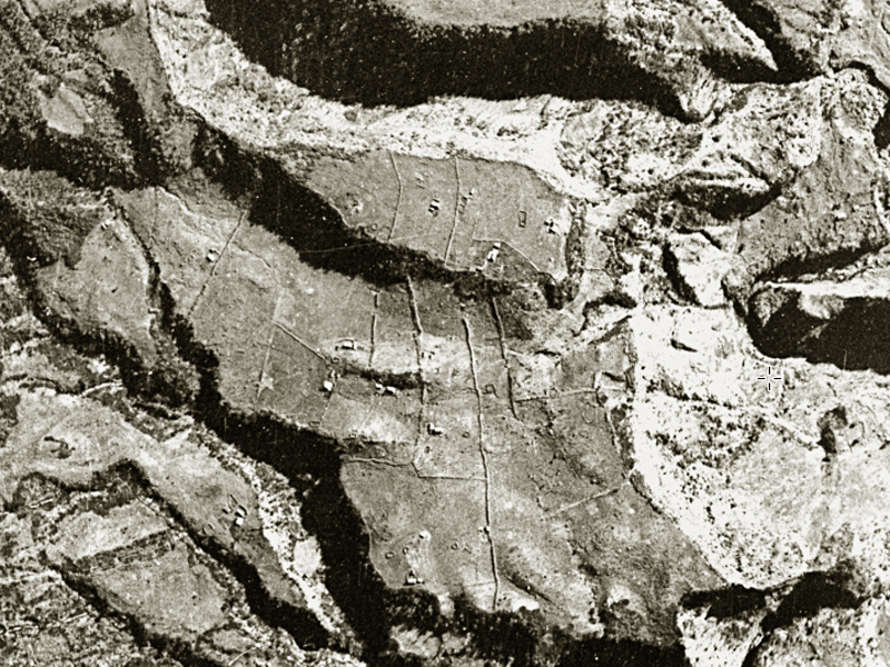 Rien à voir entre la photo satellite de 2020 et cette image aérienne de 1956 où l'on peut remarquer que toutes les zones plates ou en pente légère sont cultivées autour de Cilaos en général et sur la plateau de l'Îlet Sources en particulier. On voit très bien les parcelles délimitées par les murettes qui subsistent encore dans les broussailles. On aperçoit également une dizaines de petites cases dont certaines étaient vraisemblablement habitées. Il est toujours émouvant de visiter ces lieux en pensant à toute la sueur nécessaire pour ce défrichages et ces cultures alors que 3 ans suffisent pour faire disparaitre à jamais ces "hauts" lieux de la ruralité.
