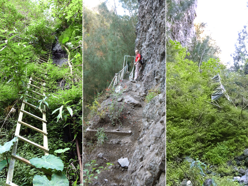 Cet itinéraire, lorsqu'il était en boucle, était un vrai plaisir pour les randonneurs n'ayant pas le vertige. Une échelle de 47 barreaux, soit environ 18 mètres, courbée par le poids et poussée hors de son emplacement par une crue cyclonique, est désormais séparée du sentier par un dangereux éboulis. La passerelle au-dessus du torrent qui se rejoignait par une forte pente et sa longue corde, a fini dans le vide, obligeant l'ONF à créer un itinéraire bis passant par de nombreux gués du Bras de Saint-Paul.
