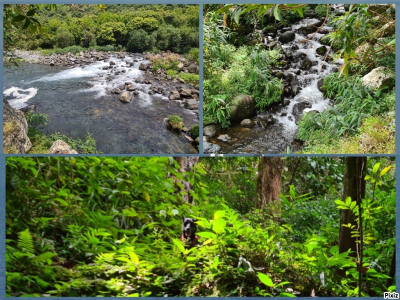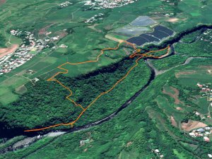 Rando sportive faite dans le sens de la descente (depuis le parking monter, à gauche le long des cannes et à gauche dans le chemin ou à l’oree du bois de litchis), sympa mais des grandes marches, vu la cabane en tôle mais la suite du chemin était bien encombrée (j’ai participé de quelques coups de sabre), Vu plutôt des litchis que des longanis. Ce sens est moins sportif (montée sur la route) et permet de se détendre au bord des bassins à la fin.