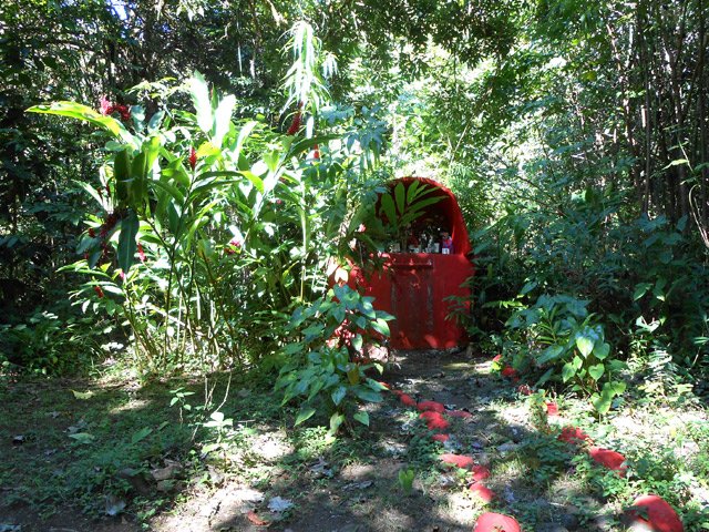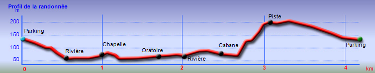 La sortie classique et facile débute au parking du site après avoir traversé une grande étendue de panneaux solaires (voir ci-dessous). Le sentier, facile à trouver depuis le parking, est bétonné et en pente très faible (Photo 1). Il effectue un grand lacet sous les bambous avant de rejoindre les berges de la rivière. C'est un ancien sentier creusé à même le rempart, très utilisé depuis des siècles, qui a été bétonné (Photo 3). On a de belles vues sur la Rivière des Marsouins et la végétation qui l'entoure depuis des trouées de la végétation (Photo 4). Quelques stations du chemin de croix en très mauvais état bordent le chemin protégé par des barrières ou des fascines de goyaviers (Photo 5). Attention en période humide où le béton peut s'avérer glissant, surtout si de la mousse le recouvre (Photo 6). On s'approche de plus en plus de la rivière bordée de grosses touffes de bambous (Photo 7). La pente se termine à un croisement. Prendre vers la gauche pour une visite de la bambouseraie en empruntant une petite passerelle (Photo 8) puis flâner sur les galets de la plage de la Rivière des Marsouins (Photo 9) avant de remonter vers la chapelle qui a également mal vieilli (Photo 10). L'endroit est calme et reposant et il est regrettable de le voir se transformer en ruine d'année en année. Repérer au passage les aménagements qui devaient rendre cet endroit particulièrement agréable à l'origine (voir ci-dessous l'histoire de l'îlet). On y voit une belle petite allée ou une fontaine ne donnant plus d'eau (Photo 11) ainsi que plusieurs bâtiments en assez mauvais état mais pas encore totalement délabrés. A la pancarte explicative, emprunter le sentier bordé de muguet péi (Photo 12) qui chemine à plat sous les plantations de longanis (Photo 15) et marcher jusqu'à un oratoire peint en rouge à la gloire de Saint-Expédit (Photo 17). Poursuivre sur ce même sentier en traversant un petit chantier de pompage puis rejoindre les berges de la Rivière des Marsouins (Photo 14) où le courant est plus fort qu'au pied de la chapelle. Faire demi-tour et remonter le sentier puis le chemin bétonné pour rejoindre le véhicule.