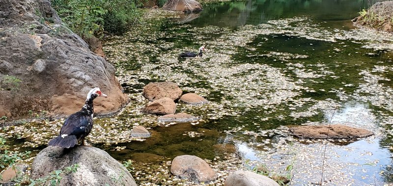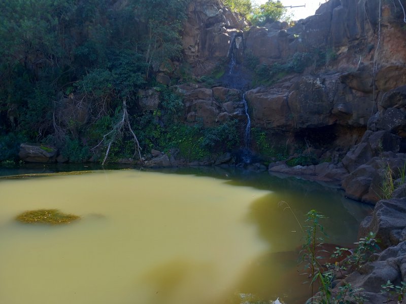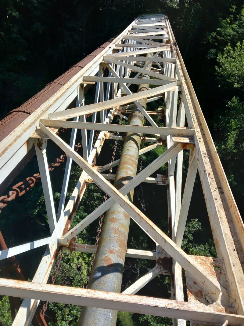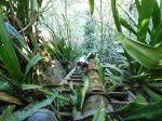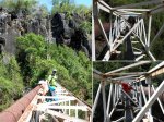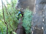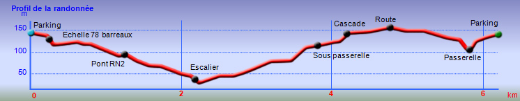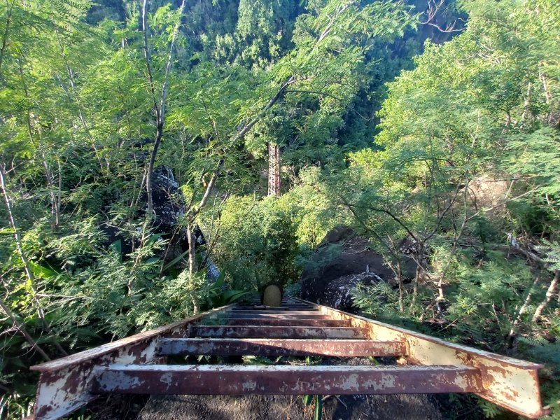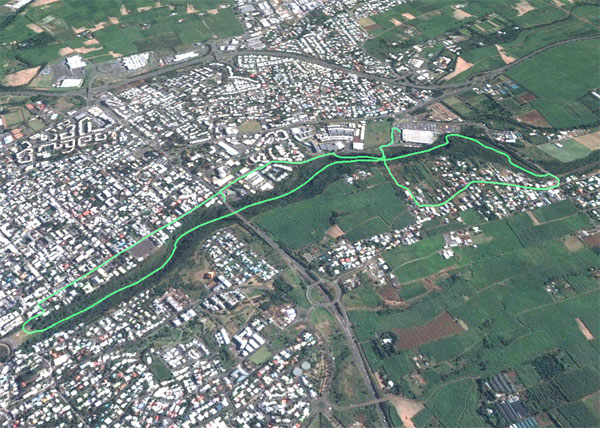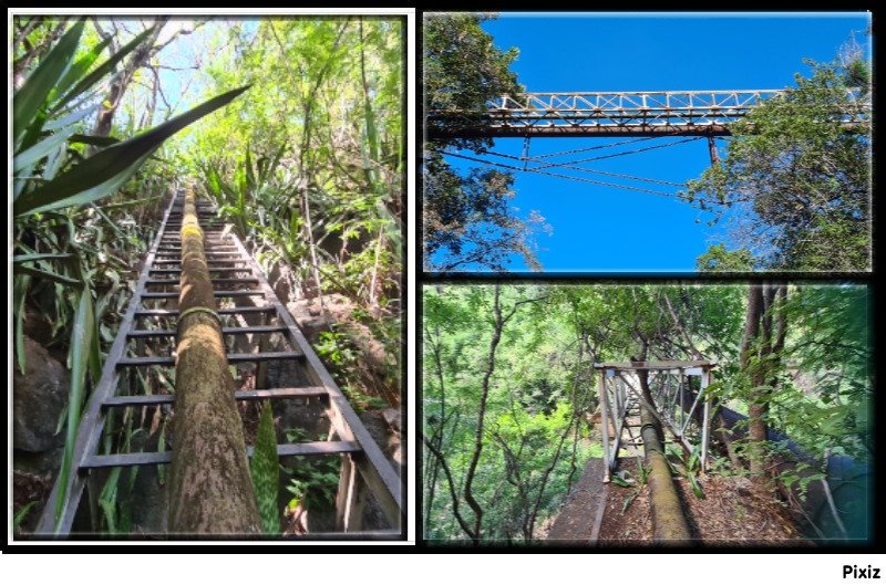 La randonnée débute ici au parking du supermarché proche du grand rond-point de la balance des Casernes. Longer le parking en descendant vers la Rivière d'Abord par la Rue du Père Lafosse. Trouver, dans les premières herbes la trace discrète qui amène en une vingtaine de mètres aux premiers barreaux d'une échelle verticale de 78 barreaux. La vue est vertigineuse avec ce tuyau qui descend et part ensuite vers la passerelle lui permettant de franchir la ravine et de rejoindre le réservoir qu'on longera en fin de boucle (Photo 1). A 40 cm le barreau, c'est donc une trentaine de mètres qu'il faut franchir en se collant à l'édifice pourvu en son milieu d'un gros tuyau rendu frais par l'eau qu'il transporte. Dans le prolongement, on rencontre la passerelle qu'on emploiera pour le retour. C'est un avantage pour ceux qui ont des craintes. En voyant ce nouvel édifice, on sait immédiatement si on peut ou non passer dans 5 heures et il est alors temps de regagner le véhicule sans être fatigué. Un sentier dangereux qu'on délaisse part sur la gauche pour gagner le fond de la rivière. Prendre à droite en bas de l'échelle et suivre la falaise en s'arrêtant de temps en temps pour dénicher où les varappeurs s'amusent à planter des pitons (Photo 5 et 6). On marche près d'un tuyau qui a mal vieilli (Photo 2) ou d'un sentier Canal dans un état identique (Photo 3). Il reste cependant de beaux vestiges que l'on peut parcourir sans danger (Photo 4). Les chocas et cactées longent le rebord et imposent de ralentir pour éviter les piqûres. Un seul écueil de moins de 2m mérite toute l'attention en raison de l'étroitesse du passage pour le tuyau (Photo 7). Il y a la place pour les pieds sous la canalisation et les mains assurent le maintien et l'équilibre durant moins d'une minute. Attention au sac à dos qui peut s'accrocher à la roche qui surplombe le tout. Un coup d'œil vers l'arrière permet de voir la vallée et toujours cette passerelle qu'il faudra utiliser bientôt (Photo 8). Après quelques mètres de sentier Canal, un tunnel d'une dizaine de mètres se présente (Photo 10). Comme on voit l'autre extrémité, inutile d'emporter de lampe (Photo 11). La broussaille devient si touffue qu'une seule issue sur la droite est possible. Elle consiste à remonter la pente en s'aidant des arbustes et la murette grillagée pour rejoindre la Rue du Père Lafosse (Photo 12). Longue séance de repos en longeant cette rue agréable en descente qui se prolonge par la Rue Auguste Babet. Ne pas manquer, sur la gauche, une ruelle qui permet de marcher à l'ombre sur un sol pavé (Photo 14). Si on la manque, on utilise alors les escaliers, un peu plus bas, qui dominent la grande grotte dédiée à la Vierge. On se retrouve au radier proche du port de Saint-Pierre et la ravine n'est qu'à 50 mètres sur la gauche. Trouver le sentier discret qui longe dans la verdure le fond de la Rivière d'Abord qui devient de plus en plus rocheux au fur et à mesure de la montée (Photo 15). On marche dans les herbes ou sur de gros rochers sans se poser de questions car la trace est toujours visible. Quelques balises jaunes laissées par les alpinistes rassurent en cas ce doute. On rencontre ça et là de beaux rochers, grottes ou ponts naturels qui changent souvent de physionomie en fonction des crues lors des cyclones (Photo 16). On passe tout d'abord sous le haut pont de la RN2. Repérer, en rive d, dans la falaise, les travaux du canal qu'on empruntait une heure avant (Photo 17). Les rochers deviennent de plus en plus gros, les marches de plus en plus hautes et quelques cascades à sec imposent de chercher le meilleur passage (Photo 18). Par la droite pour la première, par la gauche pour la suivante (Photo 19). Celle sous la passerelle s'effectue par le lit de la rivière car des barreaux ont été scellés dans la roche (Photo 20). Un regard vers le haut confirme que la passerelle ne comporte pas de plancher et qu'il faudra marcher sur les cornières de soutènement. Il est encore assez tôt pour renoncer !! La suite fait d'un seul coup gagner deux étoiles à la sortie par les paysages sauvages qu'elle traverse. Cascades, bassins poissonneux (Photo 21), sources, grottes, roches verticales et même une "statue de l'Île de Pâques" font oublier la chaleur, la poussière ou les fourmis. La fin de la montée devient moins attrayante et on rejoint le radier du Chemin de Bassin Plat où on s'amuse du regard interrogateur des automobilistes se rendant au travail et voyant ces marcheurs sortir de cette savane à première vue inextricable. Longue séance de repos en suivant l'allée des Aubépines jusqu'à l'Allée des Muguets qu'on emprunte sur la droite (Photo 22). La ruelle est courte jusqu'au prochain embranchement. Prendre à gauche l'allée Pluie d'Or puis longer un champ de pitayas (Photo 23). La suite du parcours est loin d'être évidente (voir film). Le but consiste à rejoindre la lisière en longeant le champ de cactus. Pas de trace évidente car des restes de palettes et matériaux agricoles encombrent un peu le passage. Rechercher des yeux parmi les chocas le haut de l'échelle verticale qui permet de rejoindre la passerelle repérée à plusieurs reprises (Photo 24). La partie qui arrive méritera une longue série d'adjectifs en fonction de la population qui s'y aventure (ludique pour nous, hard pour les jambes flageolantes, inquiétante pour les hésitants, dangereuse pour les distraits, tout bonnement impossible, etc.). En marchant de fer plat en fer plat, en enjambant la tuyauterie ou les fers verticaux de maintien, on traverse en quelques minutes (Photo 26). Puis on parvient enfin à l'échelle de 30 mètres. L'aventure prend fin après la longue remontée (Photo 27) de l'échelle prise en début de boucle.