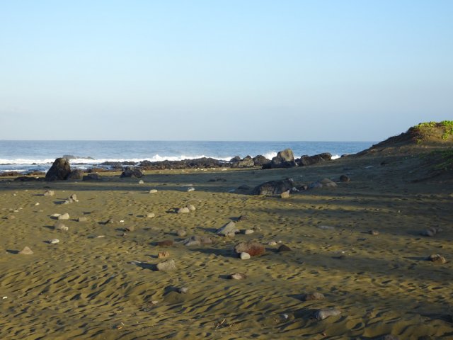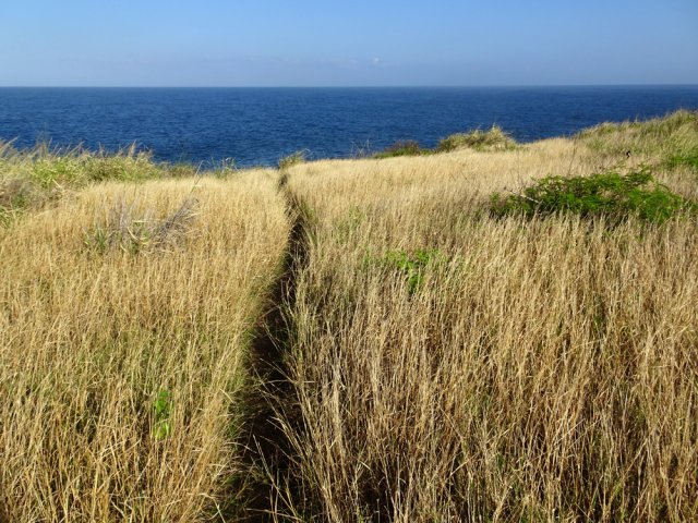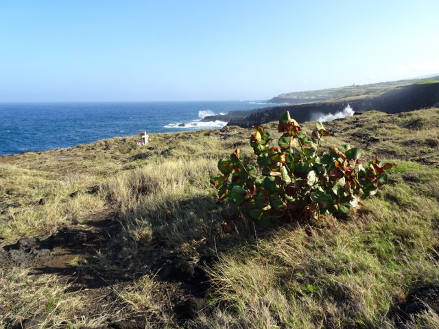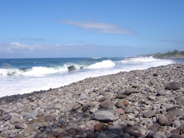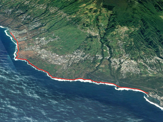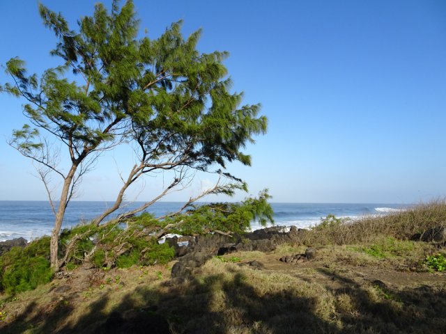 Voici une courte étape totalement plate afin d'avoir le temps de flâner et d'explorer toutes les merveilles que la nature offre à nos yeux. Choisir un jour avec un léger vent ainsi la mer instable permet de belles vagues qui s'écrasent sur les rochers de basalte et donnent plus de puissance à la demi-douzaine de souffleurs rencontrés tout au long du circuit. Aucun arbre pour se mettre à l'ombre si ce n'est quelques filaos, principalement au début et en fin de sortie. On foule du pied, tour à tour et dans le désordre, du sable noir très fin, des galets, des herbes, des basaltes de lave acérée, des champs de corail mort, d'autres de lianes de patates à Durand et souvent hélas, de nombreux détritus laissés par l'homme ou transportés par les vagues et les courants. Les embruns salés sont omniprésents et il faut faire attention à ne pas trop laisser les appareils photos à l'air libre. Le sentier est bien marqué parfois, plus difficile à deviner à d'autres moments mais il est impossible de s'égarer car l'espace entre mer et route nationale est étroit. Lorsque le sentier devient trop dangereux en bordure de falaise, il est préférable de se rendre sur la nationale et la longer sur quelques dizaines de mètres en prenant garde toutefois à la circulation, bien moins dense depuis la construction de la Route des Tamarins. Ce ne sera pas une aventure que de réaliser cette rando sans emprunter la route mais prudence tout de même aux passages étroits. Attention aussi aux chiens qui sortent de certaines cases modestes implantées en bord de plage et qui foncent sur tout ce qui bouge ; un bâton de marche rassure.