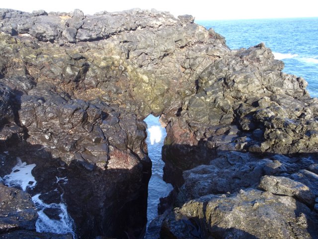 Plus difficiles à repérer que les souffleurs, les arches minérales parsèment le littoral entre l'Etang Salé et la Saline. Pour les trouver, il faut s'approcher du bord des falaises et parfois descendre vers la mer. C'est le plus souvent la lumière passant par l'ouverture qui permet de les découvrir. C'est aussi, comme ici, l'eau qui éclabousse à chaque vague. Il faut toujours être très prudent pour s'en approcher. Des croix, un peu partout, sont là pour rappeler que même les pêcheurs se font emporter par la vague qu'ils n'attendaient pas. De nombreuses autres arches sont réparties sur ce circuit au nord de Saint-Leu.