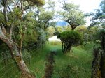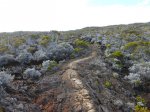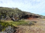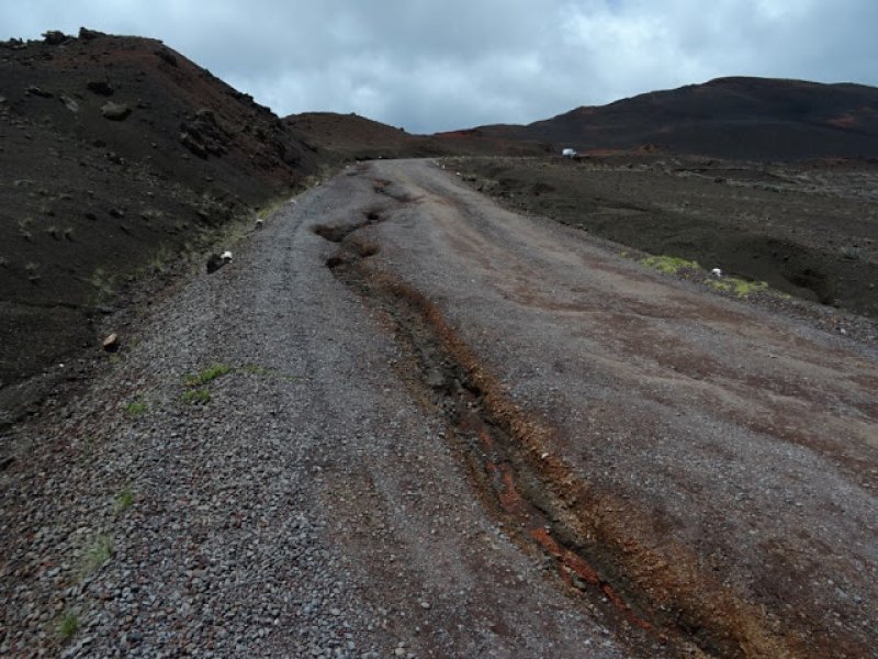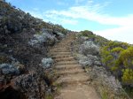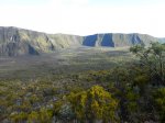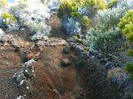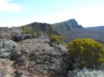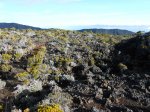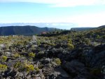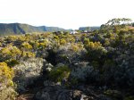 La randonnée débute au croisement des deux pistes partant, l'une vers le Pas de Bellecombe, l'autre au gîte du Volcan. Un petit élargissement de la route près d'un ancien cratère (Photo 23) permet de se garer aisément sur la droite de la piste en direction du Pas de Bellecombe. On marche tout d'abord très facilement sur la piste qui rejoint en quelques virages le parking du gîte (Photo 1). Juste avant d'arriver, une pancarte sur la droite indique le sentier de découverte. Il est étroit et un peu humide en début de matinée. La pente est faible et la végétation assez dense mais base. Plus haut, il longe ou emprunte des coulées anciennes de lave où l'on peut avoir quelques hésitations pour suivre l'itinéraire sur une cinquantaine de mètres. Il faut repérer et suivre les saignées étroites sciées dans la roche et recouvertes de peinture rouge vieillissante (Photo 6). On rencontre très vite des sculptures en résine peinte en gris et représentant des "montagnes" en miniature (Photo 3). Quelques petits panneaux tentent d'attirer l'attention sur la lente installation des plantes dans de tels milieux défavorisés. Le sentier ne s'éloigne jamais du gîte qu'on aperçoit souvent dans les trouées. Il effectue de nombreux petits virages avant de couper le sentier principal grimpant au Pas de Bellecombe. Il se poursuit sur une centaine de mètres avant de revenir vers le gîte. Au prochain croisement, abandonner la boucle pour prendre à droite un sentier balisé de jaune qui longe une clôture (Photo 15), franchit une petite ravine et s'approche de quelques cases et d'une étable à vaches (Photo 16). Poursuivre dans l'herbe et traverser des sous-bois de branles verts ou de petits tamarins puis rejoindre la Rampe Liot qu'on remonte alors jusqu'au gîte. Le sentier du Pas de Bellecombe est aisé à trouver. Il débute par des marches et se poursuit dans un univers très minéral et arrive en pente jamais très forte au portillon du Pas de Bellecombe. Avant de prendre à droite la direction du Parking de Bellecombe, faire un petit tour sur le sentier de l'Enclos Fouqué qui permet de beaux points de vue sur la Fournaise et le Formica Leo. La montée vers le parking est assez facile malgré les nombreuses marches (Photo 19). Longer au plus près les rambardes du long belvédère pour admirer le Piton de la Fournaise. La fin de la boucle emprunte la portion de route forestière jusqu'au croisement. Par beau temps, les véhicules soulèvent la poussière mais la jonction est courte jusqu'au beau tamarin dans la clairière à gauche de la route près du véhicule.