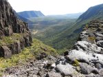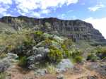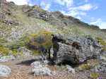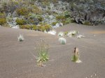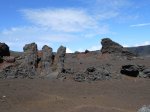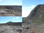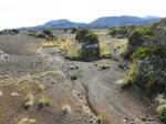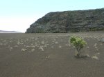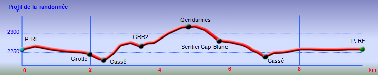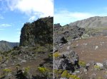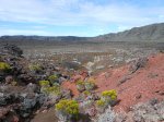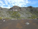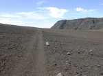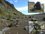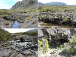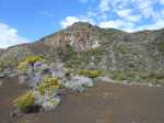 La randonnée débute au premier parking rencontré après avoir descendu les lacets du Pas des Sables. Dix mètres après la fin du goudron, trois ou quatre emplacements permettent de garer facilement le véhicule. En cherchant les endroits les plus plats, se diriger vers le rempart et s'en approcher au plus près (Photo 1). On remarque que, malgré certains pics rocheux, le terrain semble facile à traverser pour rejoindre le Sentier Mouton (Photo 2). Marcher en rive gauche d'une minuscule ravine à sec (Photo 1). On rencontre un peu plus loin un champ de "menhirs" constitué de morceaux d'orgues tombés de la falaise à gauche (Photo 5). Quelques herbes ou fleurs tentent de s'implanter dans ce sol pauvre. Un discret sentier fait son apparition (Photo 7 G). On peut le suivre ou se rapprocher du rempart pour rallonger un peu la boucle mais on le retrouve plus loin avant de couper le sentier venant de l'Oratoire Ste-Thérèse. Suivre la ravine une cinquantaine de mètres et prendre à gauche sur du sable pour suivre à nouveau le fond de la ravine. Avant d'arriver au cassé, remarquer à gauche une grotte et son foyer montrant qu'elle est connue et utilisée. Marcher sur le fond basaltique de la ravine égayé de quelques petits bassins remplis par la dernière pluie (Photo 6). La ravine cesse d'un seul coup et plonge vertigineusement dans le premier Cassé de la Rivière de l'Est (Photo 10). On aperçoit d'ailleurs le classique grand cassé dans le lointain, beaucoup plus connu puisque près d'un sentier officiel. Attention de ne pas s'approcher trop du bord où une glissade s'avèrerait fatale mais profiter des paysages grandioses sur la plaine verdoyante en dessous de nos pieds (Photo 12). On aperçoit très bien la Savane du Rond, les Piton Coco, Rouge ou de l'Îlet qui ne peuvent que motiver pour une descente future car on ne voit aucun obstacle pouvant décourager de s'y aventurer. Chercher, au plus près du cassé, le passage sur la lave entre les branles verts. La montée est insignifiante. Le basalte est remplacé par des gros gratons instables. Viser un gros monolithe d'une douzaine de mètres de haut en effectuant quelque zigzag pour le contourner par la droite (Photo 13). Poursuivre en visant cette fois le piton Haüy puis une dent de lave qui se repère très bien à sa forme pointue. La rejoindre et prendre un peu à droite pour atteindre un cratère qu'on contourne par la gauche (Photo 17). Le cheminement devient instinctif car le Demi-Piton et le Chisny sont très visibles devant. La traversée amène facilement au GRR2 qu'il suffit de suivre à plat jusqu'au pied du Demi-Piton (Photo 18). On quitte alors très vite ce sentier à une aspérité du sol pour traverser la plaine sableuse où tentent de s'installer des herbes et quelques fleurs (Photo 19). Le pied du Demi-Piton est encombré d'une haute et large coulée sombre. Viser le col que fait la pente du demi-Piton et la coulée où le cheminement est facile et la pente assez faible. Le but de la journée étant de marcher le plus à plat possible, repérer les roches esseulées nommées Gendarmes, les frôler et rejoindre la route (Photo 21). On ne peut pas manquer, en face, le discret sentier qui débute une remontée du Chisny. On le laisse très vite pour épouser au plus près la courbe de niveau qui mène droit vers un grand champ de bombes volcaniques toutes aussi grosses les une que les autres, projetées il y a 1000 ans par l'éruption du Piton Chisny (Photo 22). Entamer graduellement la descente vers la Plaine des Sables où on ne tarde pas à rencontrer le sentier descendant vers Grand Galet par Grand Pays (Photo 23). Suivre ce sentier et obliquer à droite pour une progression un peu moins plate que tout ce qui vient d'être fait mais sans aucun danger. La descente vers le cassé n'a rien d'obligatoire mais elle permet de se régaler de nouveaux panoramas sur Grand Pays, le Morne Langevin ou son cousin en face, le Piton du Rond de Langevin (Photo 24). Il faut alors reprendre en direction du Morne Langevin sur un terrain sableux comportant même parfois des dunes accumulées par les crues soudaines lors de fortes pluies. On se retrouve ainsi au pied du Morne Langevin, constitué d'innombrables orgues de basalte étalés en plusieurs couches infranchissables (Photo 26). Un écart est recommandé lorsque l'on aperçoit les traces rouges à 200 mètres sur la droite (Photo 25). Se rapprocher à nouveau du rempart pour entamer une longue "traversée du désert" sur un sol tout d'abord très souple où on a vite fait de remplir les chaussures de sable. Plus loin c'est un vrai plaisir de cheminer totalement à plat le long du morne et des amoncellements du sable tombé du rempart où tentent de pousser quelques fétuques ou fleurs jaunes (Photo 27). Après une longue courbe pour rester au plus près du mur, on se trouve nez à nez avec deux très jeunes tamarins qui ont réussi à pousser dans le sable (Photo 28). Peut-être trouverons-nous un petit bois ombragé dans quelques décennies ? Partout, des traces caractéristiques d'empreintes de lièvres et leurs crottes montrent qu'ils ne craignent pas la fraîcheur du lieu. Pour les voir, préférer l'aube ou le crépuscule. Contourner les roches au pied du Pas des Sables afin de rester à plat et retrouver la piste et le véhicule qu'on découvre recouvert d'une fine couche de poussière soulevée par les passages incessants de véhicules de touristes et randonneurs.