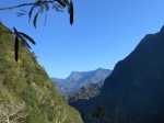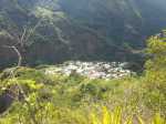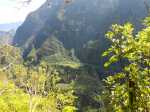 La randonnée débute au superbe village du Petit Serré, traversé lors des jonctions vers Cilaos. Quand on le traverse on pense à quelques maisons mais quand on est sur le rein qui le domine, on remarque que c'est un gros village qui possède commerces, école et grande chapelle. Un coup d'œil sur le rempart en direction de la touffe de bambous de l'Îlet Bleu peut donner l'impression qu'on y sera dans moins d'une heure. C'était le cas à l'époque où il était habité. Il en est tout autrement de nos jours. En face du parking commence le Chemin de la Place qui se termine à d'importantes touffes de bananiers ayant empiété sur l'ancien sentier. Il faut donc dénicher entre les troncs la trace qui devient immédiatement très facile à suivre même si on s'éloigne des standards d'un GRR (Photo 2). S'il était de cette qualité il y a 50 ans il était effectivement facile de rendre visite à Mémé sans trop d'efforts car ce sentier comportait une vingtaine de lacets pour grimper la falaise. Au dernier champ, on comprend vite qu'il y a longtemps qu'on ne monte plus à l'Îlet Bleu pour y cueillir mangues ou bananes. On voit depuis le village la grosse touffe de bambous qui pousse au bord mais pas les fruitiers qui sont recouverts de pestes végétales. On poursuit presque à plat dans une jungle de jouvences, de fougères et des premiers galaberts (Photo 3). Après les derniers bananiers qui deviennent sauvages par abandon, on entame la montée en cherchant des yeux le sentier (Photo 4). La montée se fait donc plus à l'instinct qu'en suivant réellement le sentier. On le rencontre de temps en temps pour le suivre sur des distances plus ou moins courtes (et non plus ou moins longues !). Il longe de manière très nette les barres rocheuses plus à l'abri de l'invasion des plantes même si tous les lieux conviennent au choca (Photo 5). Quand il disparaît dans la végétation, on reprend la montée à quatre pattes en essayant le plus possible de ne pas s'éloigner de la trace originelle (Photo 7). La comparaison des traits de la vieille carte et celle du GPS montre que c'est impossible. Il faut pourtant trouver des avantages à de telles sorties. Les panoramas sur Saint-Pierre, sur les lacets entourant le village (Photo 8), sur le Gros Morne et la Vallée du Bras de Cilaos (Photo 9) ou vers les autres îlets sur le rempart en face (Photo 10) permettent des haltes à condition de trouver un coin plat pour poser le pied. Quand on connaît tous ces îlets perdus baptisés du nom du propriétaire de l'époque, il est amusant de constater qu'on cherche à rejoindre l'Îlet Bleu en ayant en face de soi l'Îlet Rouge. Plus haut, même les portions le long des rochers ont été envahies par les bois noirs des bas ou les zépinards (Acacia farnesiana - Photo 13). Comme le long de tous les sentiers reliant un ancien îlet, on y trouve des manguiers (Photo 15). Les mangues à peine mûres donnent même l'occasion de grignoter et d'effectuer une halte pour reposer bras et jambes (Photo 16). C'est d'ailleurs au premier manguier qu'il faut retrouver le sentier qui file au sud au lieu de longer la falaise comme nous l'avons fait. Les chocas colonisés par d'énormes fourmilières a vite fait de saper le moral des participants et de contraindre à la descente sans avoir rejoint la touffe de bambous (Photo 19). Le retour s'effectue par le même trajet en prenant garde cette fois à la descente et aux cailloux tombés d'un précédent éboulis (Photo 21).