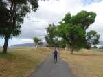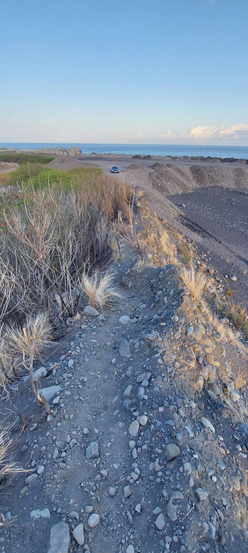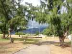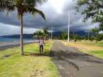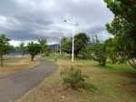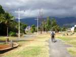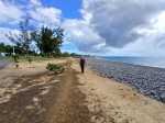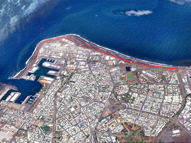 La région du Port n'a jamais été renommée pour ses randonnées. Loin des premières collines, bruyante, brûlée par le soleil, dépourvue de plages, elle doit surtout sa puissance dans l'île à la présence de fonds marins suffisamment profonds pour y faire accoster de gros bateaux. Au nord des infrastructures, citernes de carburants, autoroutes et entreprises de toutes catégories, existe un long parc étroit qui longe la plage de galets ou de sable noir. Une piste cyclable, des aires de sport et un chemin sableux attirent des sportifs portois qui viennent ici pratiquer quelques activités. A la pause méridienne, des dizaines de personnes viennent déguster leur cari à l'ombre des raisins de mer et des palmiers. Si la partie nord s'effectue dans un parc boisé, la portion ouest longe d'impressionnantes murailles de béton censées protéger la zone industrielle des assauts des vagues. Cette courte boucle peut aisément se greffer à une sortie urbaine plus longue organisée en ville.