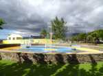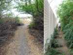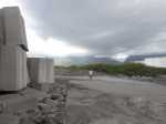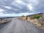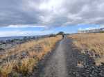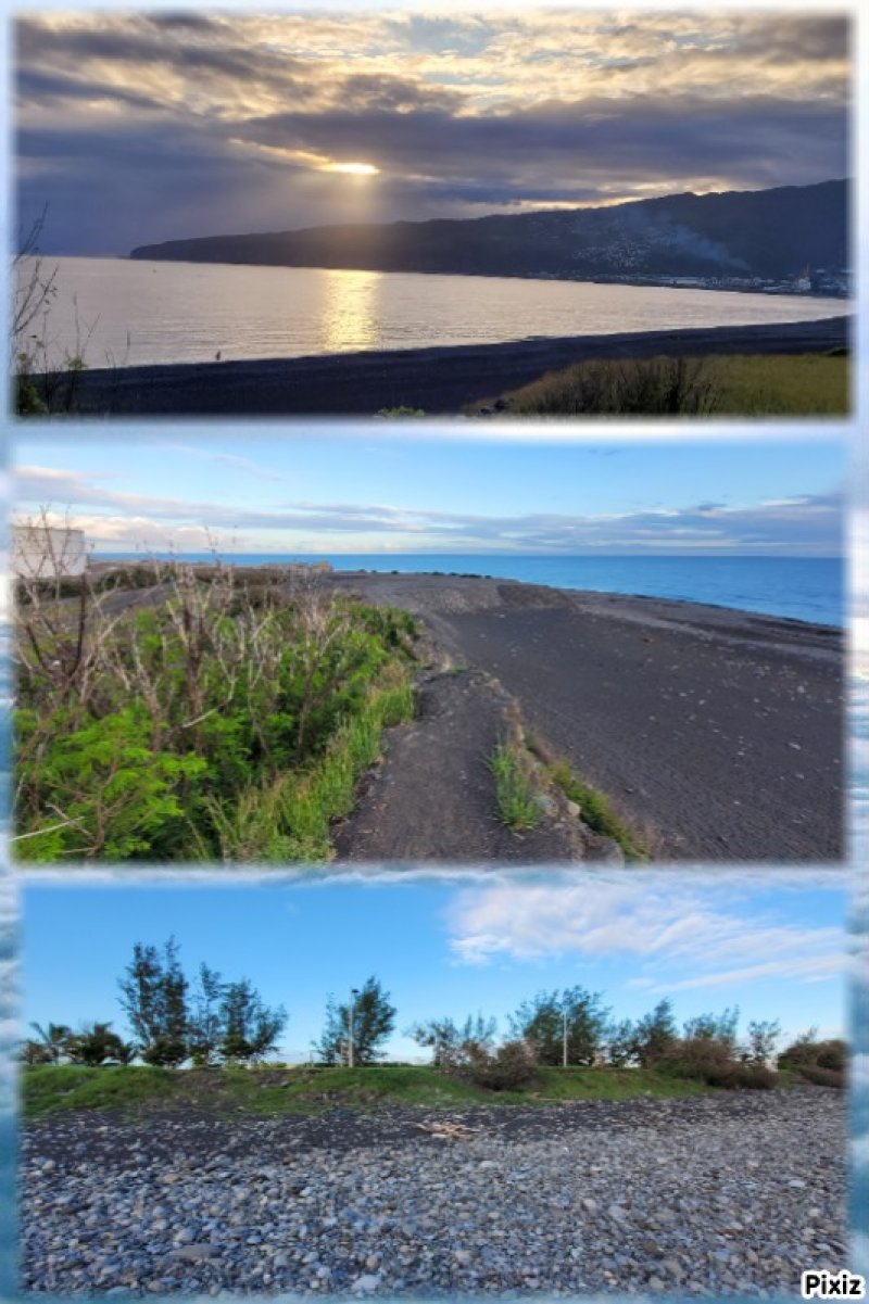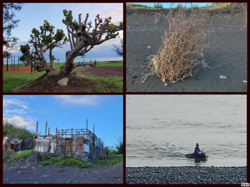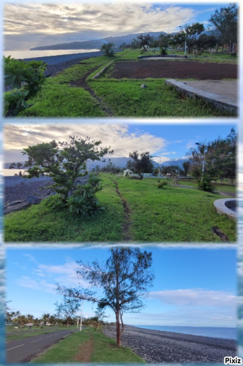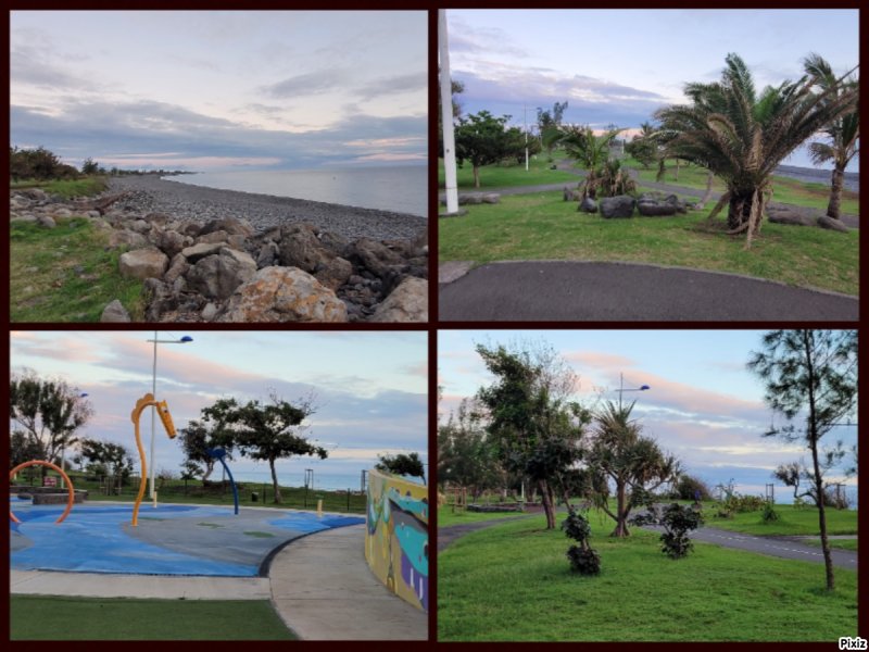 La randonnée débute au parking jouxtant le rond-point. Le parc, étroit et tout en longueur, est planté de quelques arbres qui poussent lentement. Une piste cyclable venant du Parc Boisé, large et totalement plate, longe la côte. C'est là que débute la boucle qui mènera jusqu'au port (Photo 1). La région est chaude même lorsque le temps est couvert comme ici. Ne pas chercher d'ombre car les arbres sont jeunes et espacés (Photo 2). Très vite, il est possible de quitter la piste cyclable et de se rapprocher au plus près de la plage de galets (Photo 3). Lorsque la piste est très proche, les coureurs délaissent le sentier pour revenir sur le bitume ou préfèrent la pelouse (Photo 4). Après 15 minutes à naviguer entre pelouses brûlées et galets, on remarque un sentier descendant vers la mer et une trace dans le sable filant vers la Pointe des Galets (Photo 5). Les empreintes très nombreuses sur la plage prouvent que les coureurs ne craignent pas le sable dans les chaussures (Photo 6). On longe une falaise de galets empilés depuis des millénaires. L'endroit est friable et n'encourage pas à grimper. On remarque, sur la gauche, quelques statues sans doute destinées à invoquer un saint, probablement malgache (Photo 7). Poursuivre en direction des dernières falaises en regardant les pêcheurs (Photo 8). A la fin de la plage, remonter le talus créé par les dizaines de camions venus déposer leur chargement de galets. On émerge sur une longue route bétonnée menant presque aux bassins du port. Le paysage change du tout au tout et peut faire regretter le parc. Mais les coureurs ne demandant qu'à faire de longues distances, apprécient ce paysage plat, idéal pour l'entraînement. Sur la droite, on ne distingue pas l'océan caché derrière des plots bétonnés de plusieurs tonnes (Photo 9). A gauche, les premières séries des 25 immenses cuves de carburant de plusieurs milliers de m3 chacune occupent tout l'espace (Photo 10). Longer ces montagnes de béton sachant qu'un sentier se trouve à une quinzaine de mètres pour le retour (Photo 11). Même les fresques peintes sur les blocs ont du mal à redonner de l'éclat à cette courte traversée (Photo 12). A la fin de la route bétonnée, après une esplanade créée également par les centaines de camions de galets, on arrive à revoir les vagues. Poursuivre sur la piste de cendre en longeant cette fois des barbelés qui protègent les cuves (Photo 13). On marche parallèlement au Bassin des Kerguelen entouré d'immenses entrepôts (Photo 14). Par beau temps, on peut voir une partie du Cirque de Mafate à l'horizon. Le chemin poussiéreux se termine au Bassin Bardot, face au chenal qui s'ensable. Les excavatrices creusent sans cesse pour gagner en profondeur. Des bateaux y sont ancrés dont le Marion Dufresne, près de la Base nautique des Mascareignes, lorsqu'il n'est pas en expédition (Photo 15). Il est possible de poursuivre jusqu'à la pointe du port. Reprendre la piste et marcher jusqu'au début du sentier, facile à repérer le long du grillage (Photo 16). Il est agréable de retrouver de véritables sentiers de randonnée, même s'ils frôlent des barrières infranchissables (Photo 17). La route empruntée à l'aller est à une dizaine de mètres seulement lorsque l'on parvient à la savane (Photo 18). Les traces laissées par les coureurs se terminent peu après de gros tas de roches (Photo 19). Reprendre une piste bétonnée longeant les réservoirs sur 300 m. Des barrières, qui sont certainement fermées à des périodes de la semaine, imposent de chercher sur la gauche un passage. On le trouve facilement aux traces de passages laissés par les joggeurs (Photo 20). Suivre une piste goudronnée longeant des aires de stationnement abandonnées entourées d'épineux (Photo 21). On retrouve la verdure et la route en traversant une dernière savane sèche menant aux parkings (Photo 22). On revient également à la piste cyclable délaissée en début de boucle qui passe sous les filaos alors qu'on suit l'itinéraire sur terre battue (Photo 23). La fin du parcours suivra constamment cette belle allée bordée de plus en plus d'arbres (Photo 24). Dès que possible, utiliser celle de droite pour s'éloigner de l'itinéraire de départ (Photo 25). Des haltes sont possibles à l'ombre des filaos, sur l'herbe qui n'est pas toujours verte selon la saison (Photo 26). Contourner par la droite l'aire de jeux d'eau qui doit amuser les enfants en fin de semaine (Photo 26). Terminer le dernier kilomètre par la traversée de la partie la plus boisée du parc jusqu'au parking (Photo 28).
