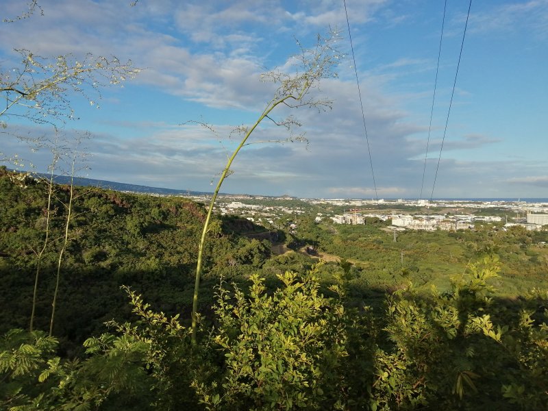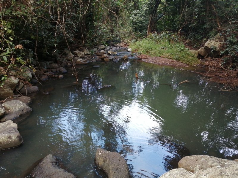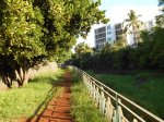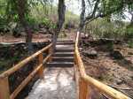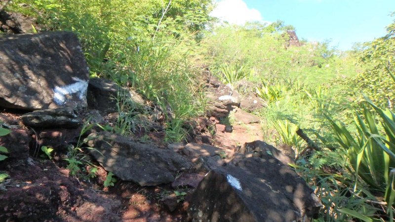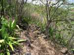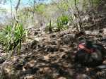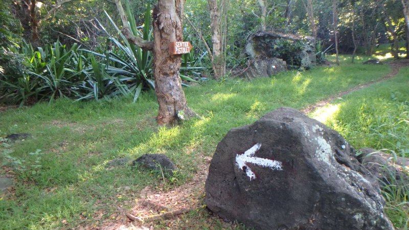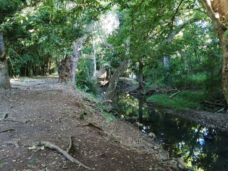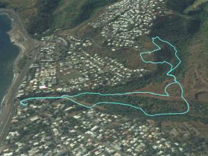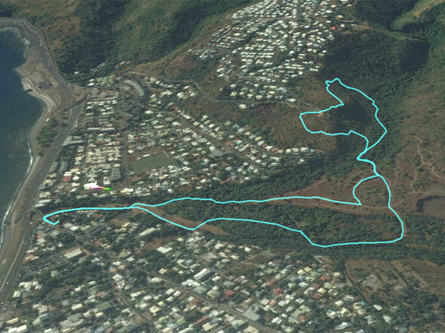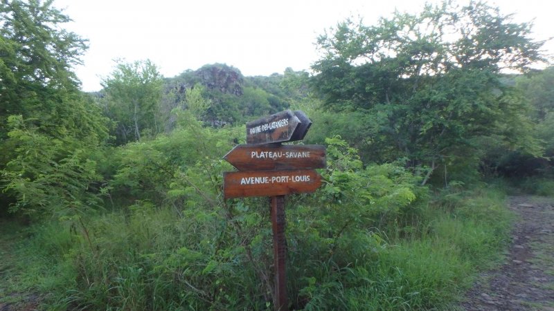 La randonnée débute à la Rue Hubert Delisle à la Possession, près du pont qui enjambe la Grande Ravine des Lataniers. Suivre le sentier qui la longe en rive gauche jusqu'à s'approcher au plus près de la ravine pour la traverser sur des galets très souvent à sec. Le Parc Elizabeth Rosthon débute de l'autre côté. Prendre à droite et emprunter la large piste bordée de gros galets (Photos 2 et 3). En fin d'année, les mangues pourrissantes tombées au sol font perdre un peu de charme à l'endroit qu'on traverse très rapidement. Poursuivre sur la même piste devenue herbeuse (Photo 4), bordée d'acacias, bois noirs et tamarins. Laisser la première piste qui part vers la Kalla puis la deuxième qui monte vers la carrière. Toujours suivre la piste principale et terminer par un sentier qui s'enfonce sous les arbres avant de franchir la Petite Ravine des Lataniers sur un gué facile mais aux galets branlants. Le sentier se poursuit dans une végétation plus fournie qu'au départ. Prendre le sentier de droite le plus marqué par les passages et entamer une courte mais assez forte pente caillouteuse comportant de grandes marches. Plusieurs embranchements se rencontrent dans cette montée. Prendre plutôt vers la gauche pour rallonger un peu sans toutefois utiliser le sentier qui descend vers la ravine. Le sentier se finit à la route et rejoint une aire de repos offrant de beaux panoramas sur la mer (Photo 9). Repérer sur la gauche l'escalier qui débute sous des tamarins. On remarque bien le sentier qui se poursuit vers le haut en passant près d'un pylône électrique (Photo 11). Un autre sentier part sur la gauche mais se termine 150 mètres plus loin. il est utilisé par les habitants pour éviter de longer la route pour gagner l'aire de repos. Le sentier reste tout d'abord agréable à travers les acacias et chocas (Photo 12). Très vite, il descend de manière parfois abrupte sur des milliers de cailloux surchauffés (Photo 13). Au premier croisement, prendre sur la droite et longer la Petite Ravine des Lataniers par un cheminement à plat entre les gros cailloux (Photo 16). On passe près de vestiges puis on rejoint le large sentier pris à l'aller (Photo 18). Tourner à gauche et retrouver l'itinéraire pris après le gué. Franchir à nouveau ce gué et prendre plus loin la piste partant sur la droite. Elle chemine dans un beau paysage composé de hautes herbes où poussent de très grands tamarins (Photos 19, 21 et 22). Les tamarins cessent pour être remplacés par les manguiers. Au lieu de rejoindre rapidement l'entrée du parc par la gauche, privilégier une balade vers la droite pour rejoindre des bambous et les berges de la Petite Ravine des Lataniers (Photo 23). La suivre en rive gauche jusqu'à un sentier qui longe le fond de la ravine. Marcher en rive droite le plus longtemps possible. Quand le sentier disparaît presque et que la marche devient plus difficile, viser le tuyau noir qui a été accroché à la rambarde métallique sur le mur d'en face (Photo 24) et rejoindre le sentier de départ par une montée ludique de 2 mètres qui amusera les enfants. Le véhicule n'est plus qu'à 200 mètres.