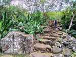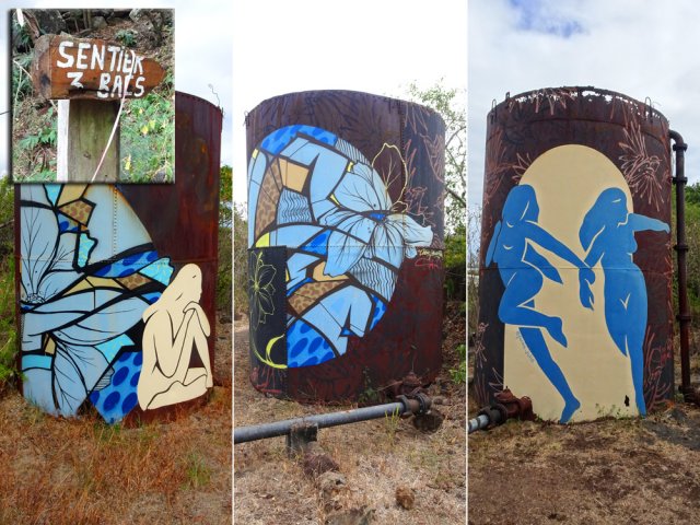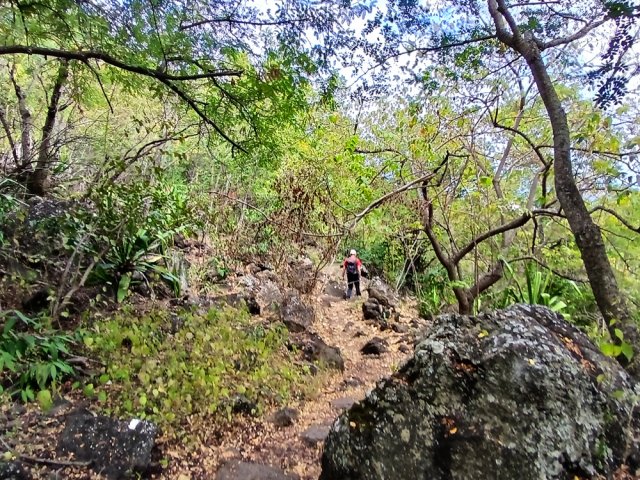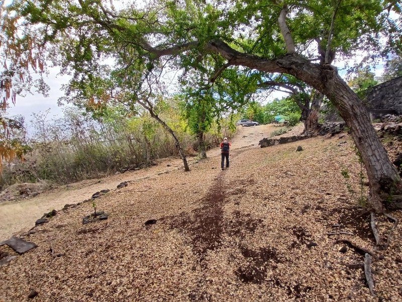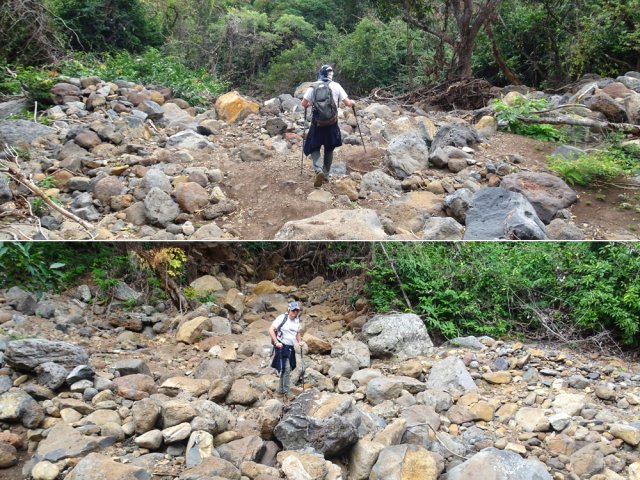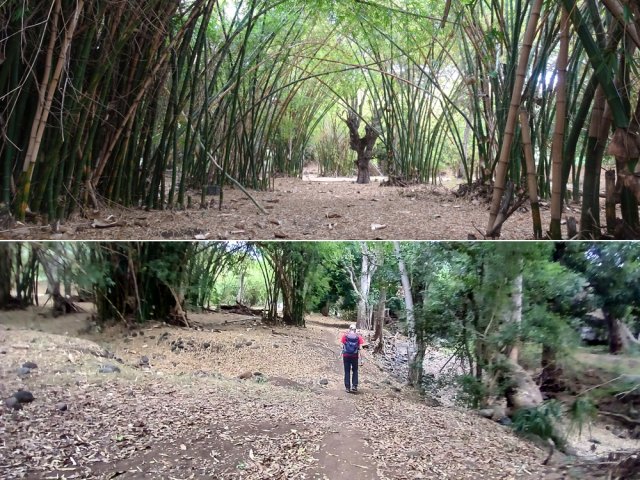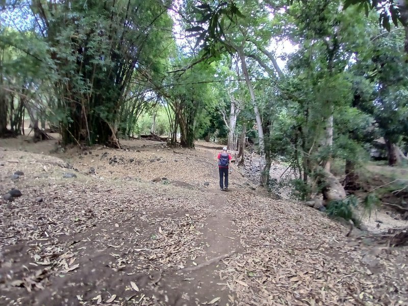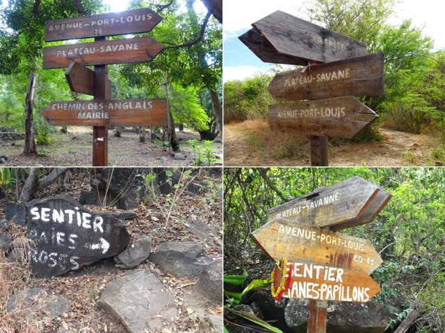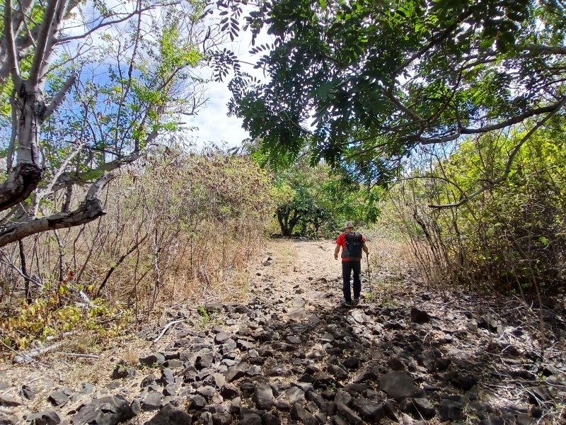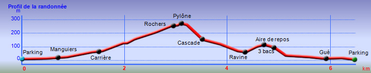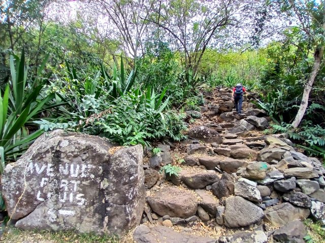 La randonnée débute Rue Évariste de Parny, au grand parking qui se situe en face de la médiathèque de la ville de la Possession. Franchir la porte annonçant le Parc Rosthon, juste avant le pont de la Ravine des Lataniers. On se retrouve pour plus de 300 m sur une large allée longeant la Grande Ravine des Lataniers, de l'autre côté de la rambarde (Photo 1). A la fin de l'allée, partir sur la gauche et traverser le large lit caillouteux envahi de ricins. De nombreuses allées circulent sous les manguiers centenaires. Bifurquer à droite et suivre la large allée bordée de galets dont certains ont conservé de la peinture (Photo 2). Pas de difficulté pour ce départ tout en douceur à l'ombre des grands arbres (Photo 3). A partir de là, il faudra suivre les panneaux indicateurs à condition de savoir quelle direction prendre. Les panneaux sont nombreux mais peu de renseignements sur les sentiers empruntés (Photo 4). La piste se rapproche au plus près de la ravine à sec (Photo 5). Des sentiers partent sur la droite et la traversent pour d'autres parcours. On s'éloigne enfin de la ravine en poursuivant sur une piste toujours aussi facile (Photo 6). Prendre à droite à l'embranchement de plusieurs directions (Photo 7). On rejoint très vite un étage des carrières qui ont fait couler beaucoup d'encre au moment de la construction de la NRL. Il est possible de traverser dans la savane qui l'a envahie ou mieux, de contourner par un chemin plus étroit passant dans les faux mimosas (Photo 8). Attention, en partant à droite immédiatement, il faudra remonter en hors sentier à la fin de la carrière. A l'issue du contournement, on domine les carrières et les nombreux sentiers qui font le bonheur des joggers (Photo 9). Emprunter un sentier plus discret sur la droite qui se dirige vers un pylône qu'on aperçoit à 200 m. La trace est devenue plus étroite entre hautes herbes sèches et chocas (Photo 10). La montée est régulière pour effectuer les 200 m jusqu'au croisement. On a de belles vues sur les vallées des ravines des Lataniers. Le sentier est toujours facile à suivre. Il traverse des savanes, des friches, des petits bois et quelques zones rocheuses (Photo 11). Les portions plates, très courtes, permettent de souffler un peu (Photo 12). La pente reprend aussitôt entre avocatiers marrons et savanes sèches (Photo 13). Laisser le premier sentier descendant sur la gauche. Poursuivre en ayant toujours la ligne haute tension et les pylônes en point de mire (Photo 14). A 270 m d'altitude, laisser le sentier qui se poursuit vers l'Est et entamer la descente vers la Petite Ravine des Lataniers. On traverse de nouvelles zones rocheuses offrant de belles vues sur le Port (Photo 15). La descente n'est pas très longue mais assez technique en raison de la pente et des roches en travers (Photo 16). A l'approche de la ravine, le sentier fait un coude puis plonge à un moment dans une partie rocheuse surmontée d'un arbre tombé au sol. C'est le seul passage technique de la boucle qui demande un peu d'attention (Photo 17). Aussitôt après cette descente, un petit sentier file en direction de la ravine. De nombreuses balises blanches invitent à rejoindre un bassin alimenté par une cascade, hélas souvent à sec (Photo 18). L'endroit doit être agréable lorsque la cascade coule et remplit son bassin. Longer la ravine en rive gauche en retrouvant des parties rocheuses et de nombreuses marches (Photo 19). Plus bas, le sol a été chamboulé par les crues violentes et il faut désormais suivre les taches blanches pour se frayer un chemin jusqu'au Bassin Cheval, emporté lui-même par l'eau en furie (Photo 20). Après la traversée, laisser les deux sentiers partant sur la gauche et entamer une forte montée en direction de la Route de la Montagne. La montée du pierrier s'effectue sur de hautes marches en pierre (Photo 21). Toute la montée est raide et s'effectue le plus souvent sur ces marches (Photo 22). Le sentier redescend un peu et l'on rejoint plus facilement l'aire de pique-nique. Elle a souffert des ans, du manque d'entretien et les kiosques ont disparu. Les rambardes ont pourri et si certaines semblent en meilleur état, éviter de trop s'y appuyer (Photo 23). Les vues sur le Port sont toujours là. Un sentier débute au sud de l'aire. Il descend vers les trois cuves rouillées repeintes par des artistes du coin (Photo 24). Emprunter le sentier 3 Bacs pour revenir en direction de la Petite Ravine des Lataniers. Il comporte quelques tronçons rocheux assez abrupts qui permettent de rejoindre la piste plus large longeant la ravine (Photo 25). Partir sur la gauche et suivre la piste jusqu'au gué sur la ravine. Il a également souffert des crues mais on trouve facilement le passage vers une énorme racine dans le fossé. 100 m plus loin, on parvient à une fourche de trois destinations. Prendre la plus à droite et poursuivre sur une belle piste plate entretenue (Photo 26). On s'approche tranquillement du Parc Rosthon en frôlant quelques beaux spécimens de tamarins (Photo 27). Descendre vers une grosse cuve avant de pénétrer à nouveau dans le parc aux manguiers. Partir sur la droite en direction de la ravine. Avant de revenir au gué, effectuer une petite boucle dans le parc en se rapprochant des grosses touffes de bambous en vive gauche de la ravine (Photo 28). Revenir au gué emprunté en début de boucle et reprendre la belle allée ramenant au point de départ.
