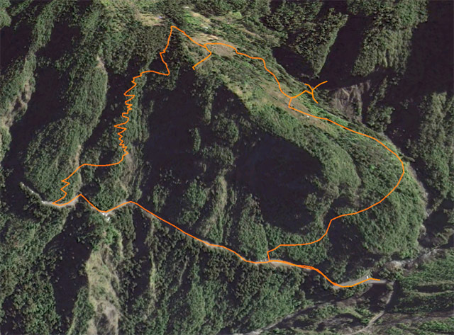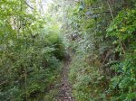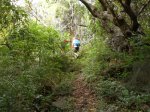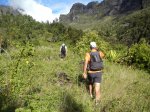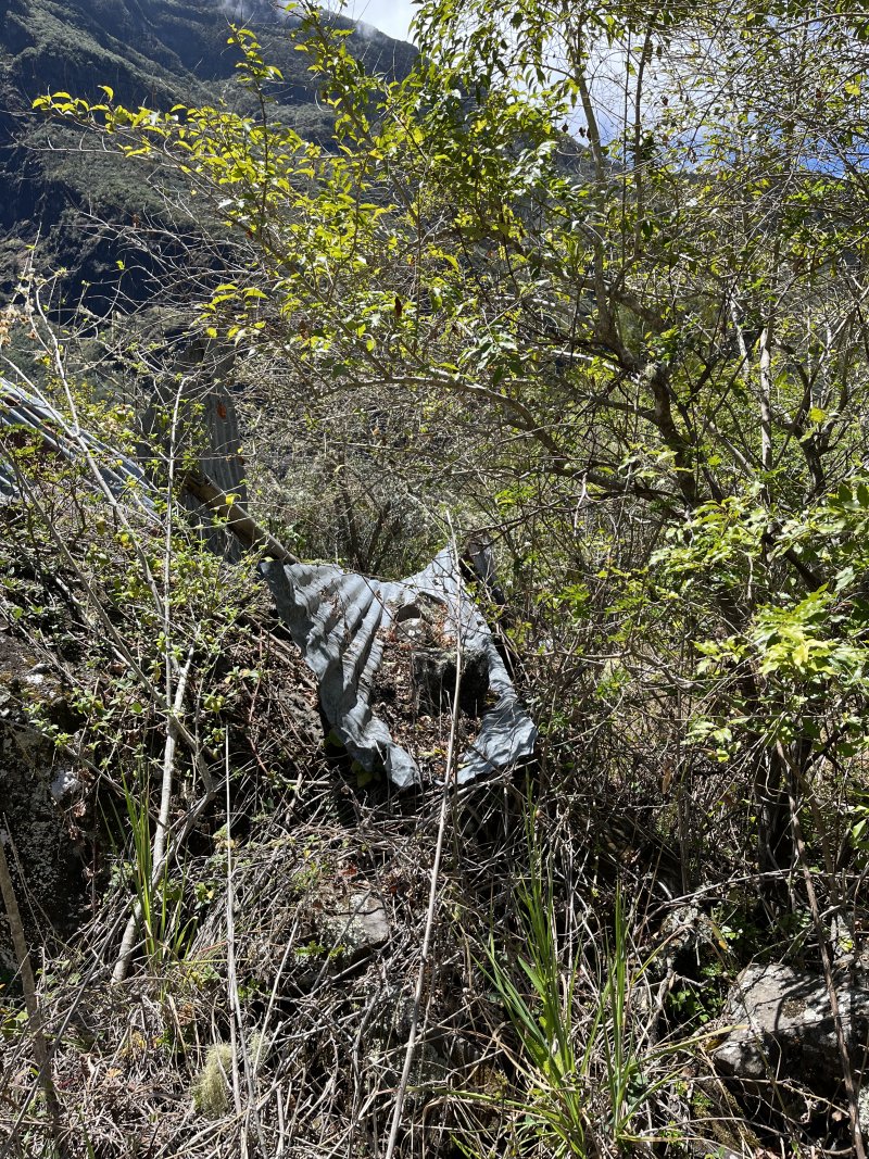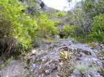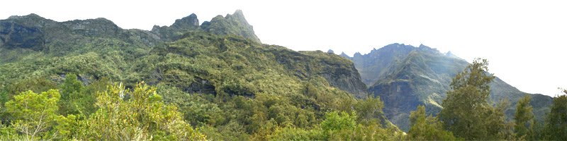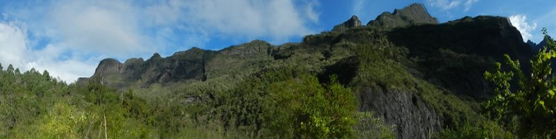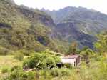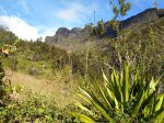 La randonnée débute au pont qui enjambe l'impressionnant Bassin des Salazes. Une petite portion de 200 mètres sur la route de l'Îlet à Cordes est inévitable pour rejoindre le début de la montée qui n'a jamais eu de panneau indicateur (Photo 1). Le départ est simplement le fond d'une ravine caillouteuse, affluent du Bras Rouge, où il faut escalader quelques gros rochers sur une pente assez forte (Photo 2). On rencontre très vite un court câble électrique qui donne la direction vers la droite. Un très ancien petit sentier apparaît, encore bien visible et peu envahi malgré la faible fréquentation depuis l'abandon de l'îlet Bas des Salazes (Photo 4). Un câble électrique attire l'attention à un moment où on ne voit plus trop le sentier (Photo 5). Plus loin, un cul de sac entre deux falaises peut donner l'impression qu'on ne pourra pas passer mais le nouveau câble électrique est là pour rassurer. On monte plus avec les bras qu'avec les jambes mais l'effort est de courte durée pour retrouver le sentier en très bon état mais toujours aussi étroit (Photo 6). On longe un peu plus loin une barre rocheuse et le sentier effectue quelques lacets. Il est envahi de "zerb vache", cette espèce de plante ressemblant de loin à de l'arachide mais dont les tiges collantes restent attachées aux chaussettes. La végétation est assez importante sur les bords du sentier (Photo 7). On atteint rapidement le plateau de l'Îlet Bas des Salazes. Beaux panoramas alentour mais les cultures sont désormais invisibles (Photo 8). Plus de sentier mais on peut marcher le long des anciens petits champs (Photo 9). Pluto (le Nez de Bœuf) et ses trois puces sur le dos (Photo 10) dorment paisiblement au-dessus de l'endroit très calme. Une cabane en tôle entourée de poteaux d'arrosage délabrés, de quelques plantes, vignes et fruitiers permettent de savoir que le lieu fut habité (Photo 12). Les cultures ne demanderaient sans doute que peu de travail pour les réhabiliter mais les habitants ne sont plus remplacés dans ces zones oubliées (Photo 13). On entend distinctement le bruit de l'eau et de quelques cascades. S'il y a un bruit de torrent, il y a certainement un sentier qui s'en approche sinon comment l'habitant des lieux aurait-il pu manger de la truite ou de l'anguille ? Pour le trouver, repérer sur la droite une touffe de gros bambous jaunes à une soixantaine de mètres de la cabane. La trace de ce qui fut un sentier part entre un gros pied de chocas et un troène. Il rejoint quelques petits filaos puis des plus grands avant d'arriver à la rivière. C'est le festival de chutes, toboggans écumeux, bassins ou pisse en l'air. Il faut hélas se mouiller les pieds pour effectuer cette deuxième partie de parcours, facultative puisque en aller-retour même s'il serait dommage de s'en passer. Descendre ou remonter la Ravine des Salazes à la recherche de ces chutes en prenant garde de ne pas glisser. Une longue et fine cascade tombe d'un flanc de rocher droit devant (Photo 19). En regardant bien où mettre les pieds sur le sol instable, on peut grimper sur le côté jusqu'à dominer la chute (Photo 20). On bénéficie alors d'un beau point de vue sur Cilaos et sur le plateau de l'îlet qu'on vient de quitter. Après une courte montée pour le retour vers la case, il faut alors viser le gros rocher qui domine l'ancienne aire de l'îlet (Photo 22) et un vêtement accroché dans une branche d'arbre, sans doute en guise d'épouvantail (attention, il n'y restera pas des années !). Contourner le rocher par la droite. Si on arrive à franchir ces plantes collantes sans encombre (lever haut le pied !) on rencontre un grand pied de bibasse (néflier réunionnais) qui confirme le bon itinéraire. Le cheminement s'effectue sans difficulté en sous-bois jusqu'à l'Îlet Haut des Salazes (Photo 24). Là également, on franchit plus loin une zone privée en passant au plus près d'une case en tôle (Photo 25). Il faut bien suivre les sentiers qui mènent au belvédère qui offre de splendides panoramas sur le cirque (Photo 26). En suivant un de ces sentiers, on se retrouve au kiosque implanté à quelques mètres du GR qui remonte vers Mafate. C'est un lieu très classique pour tous ceux qui montent ou viennent au Taïbit et qui aiment y déguster une infusion en laissant une pièce. Le retour au pont du Bassin des Salazes s'effectue en descendant les nombreuses marches d'un large sentier largement décrit pour d'autres randonnées. Il paraît une autoroute après ceux employés pour voir les cascades ou rechercher les traces de vie. Les lacets sont nombreux ainsi que les paysages sur Cilaos (Photo 27). On termine à la route de l'Îlet à Cordes pour une courte descente vers le pont en profitant des vues sur la Cascade Pitsa (Photo 28).