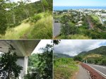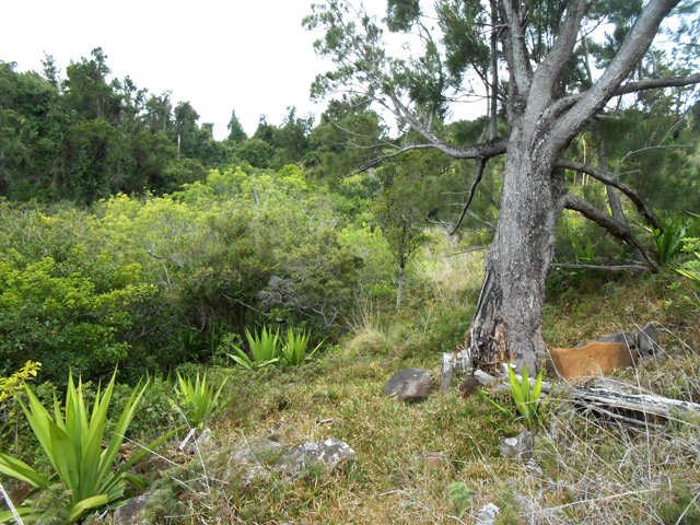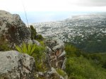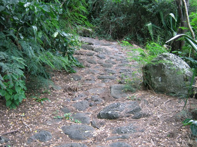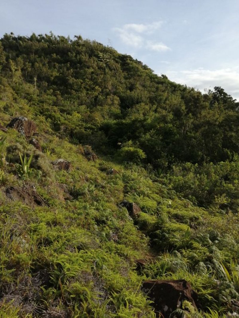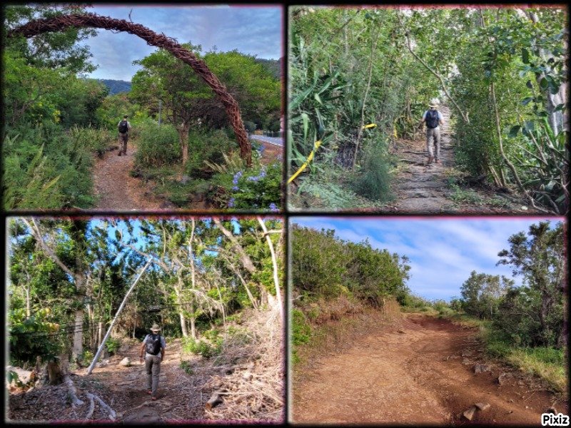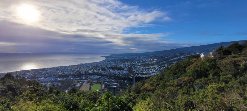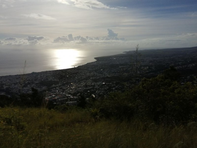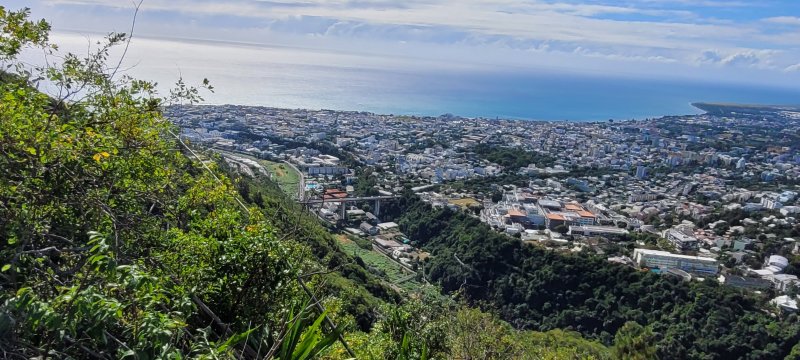 La randonnée débute au très connu Stade de la Redoute en longeant la Rivière Saint-Denis sur un sentier agréable aménagé le long de la route de la Montagne. Les fascines de goyavier ont tendance à un peu vieillir mais la balade est plaisante malgré le bruit des véhicules. Un sentier rencontré sur la gauche dirige vers un oratoire et sur les berges de la rivière pour un petit détour facultatif. Poursuivre sur la route au pont Vinh San jusqu'au carrefour qui enjambe la route de Saint-Paul. Le sentier des Rampes de la Montagne est impossible à manquer sur la droite. Des panneaux explicatifs sont installés au départ de la forte montée (Photo 1). On commence par un sentier un peu ombragé qui rejoint les quatre canons qui pointent sur une partie de la ville (Photo 2). On poursuit en frôlant un kiosque de pique-nique en bordure de route (Photo 3). Suivre ce sentier de bonne qualité mais bordé en revanche d'une végétation très pauvre et sans attrait (Photo 4). Il grimpe en pente douce alternant des portions plus fortes comportant plusieurs lacets et quelques vestiges pavées (Photo 5). Le sentier s'approche plusieurs fois de la route de la Montagne puis se rapproche d'une case caractéristique aperçue depuis le bas. Quand on aperçoit la clôture d'enceinte de la villa, laisser le sentier partant sur la gauche vers la route et plonger vers le Bras Gentil par de nouveaux lacets sur un sol caillouteux. De l'autre côté de la ravine à sec, la pente constituée de courts lacets est rude mais courte. Le sentier se termine à la muraille qui sépare du Chemin de la Vigie. Rejoindre cette route, profiter du panorama sur la ville et poursuivre en marchant en direction de la Montagne. Une piste part sur la droite et rejoint le stade de la Vigie et plus loin, le Chemin des Prêles. Suivre cette route sur 250 mètres et partir sur la gauche sur un chemin pavé ombragé sous les filaos et bien évidemment dans les lianes papillon (Photo 5). Ce vestige du Chemin Crémont permet de rejoindre sans circulation la RD 41. Les pavés encore en place sont bien conservés (Photo 7). Dans le virage partant sur la gauche, emprunter le Chemin du Piton Trésor et le suivre sur 500 mètres avant de bifurquer à nouveau sur la gauche sur un sentier discret partant près des antennes relais. On marche facilement près de touffes de bambous, dans les chocas et sous les arbres. Le sol est recouvert d'une concentration exceptionnelle de liane papillon (Photo 8). Cette peste peut envahir des hectares en quelques années ; c'est pourquoi ce sentier doit absolument être pratiqué, faute de le voir tomber dans l'oubli (Photo 9). Des touffes d'herbe sont aussi inquiétantes car, si elles ne sont pas enlevées ou tondues, elles peuvent boucher le chemin en deux ans (Photo 10). Le parcours longe plusieurs fois des grillages (Photo 12). La végétation est irrégulière et parfois un peu envahissante mais on ne perd jamais le sentier (Photo 13). Il faut à un moment franchir quelques rochers mais sans danger, sauf par temps de pluie (Photo 14). De grosses touffes de bambous comportent des petites sentes utilisées par certains élèves pour fumer en cachette (Photo 16). Une fois passé le lycée qu'on aperçoit sur la droite, longer une petite falaise de tuf puis poursuivre dans les fougères, herbes et arbustes ras vers une zone rocheuse (Photo 17). Effectuer une halte pour profiter de splendides points de vue sur le chef-lieu qu'on voit en totalité jusqu'à Sainte-Marie. La zone est particulièrement rocheuse, créant plusieurs promontoires où il est facile de s'asseoir pour admirer le paysage (Photo 18). Le sentier se poursuit en forte descente vers la vallée qu'on aperçoit un peu plus loin. Un passage plus vertical que les autres est facilité par un long câble qui évitera la glissade par temps humide (Photo 19). Le terrain s'aplanit mais la végétation n'est pas domestiquée (Photo 20). On suit pourtant sans difficulté le sentier qui remonte petit à petit sous les filaos ou jamrosas sur une portion assez rocheuse (Photo 21). La montée est parfois rude, parfois glissante sur les aiguilles des filaos, les feuilles tombées au sol ou sur la terre humide (Photo 22). On ne tarde pas à rencontrer des portions du sentier venant de Saint-Denis, en très bon état en raison des passages fréquents. Deux solutions sont alors possibles. Rejoindre l'aire de loisirs du Colorado par le sentier puis la piste, ou prendre à gauche pour redescendre vers Saint-Denis. L'aire de loisirs ne se décrit plus et les chemins qui y mènent sont larges, très fréquentés et parfois glissants. La descente s'effectue sur un sentier de bonne qualité comportant parties glissantes, marches en bois, roches parfois surchauffées. Les points de vue sur Saint-Denis sont de plus en plus nombreux et on peut voir le lycée technique et ainsi mieux deviner le sentier (Photo 24). Profiter des derniers points de vue sur la vallée de la Rivière Saint-Denis et se lancer dans la descente vers la Redoute (Photo 25). Le sentier comporte quelques lacets et plonge parfois assez fortement sur des marches ou les roches qui dépassent (Photo 26). On a vite fait de rejoindre les eucalyptus qui dominent l'hôpital de Bellepierre (Photo 27) et lacets de la route de la Montagne qu'on peut utiliser en partant sur la gauche, en descente. Mais un sentier escarpé permet de dévaler la pente beaucoup plus rapidement vers le pont. Passer sous le pont et longer le sentier paysager utilisé au début de la boucle pour retrouver le véhicule (Photo 28).