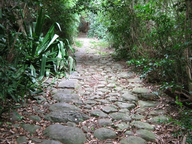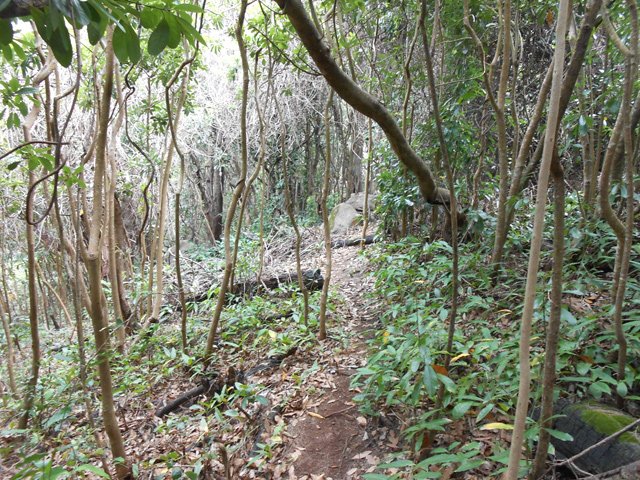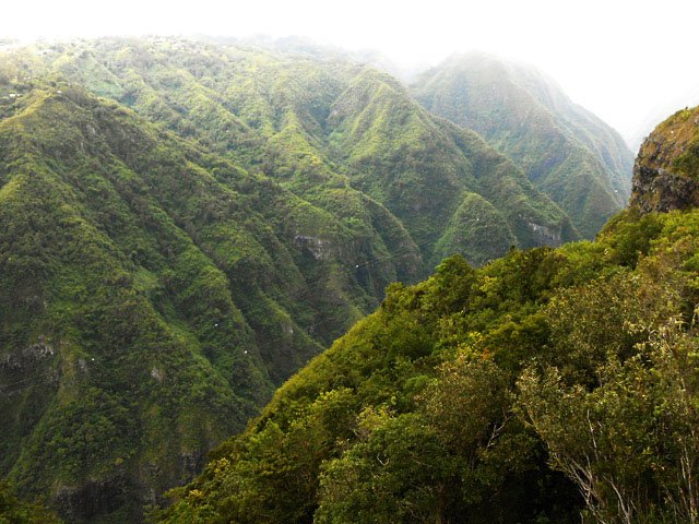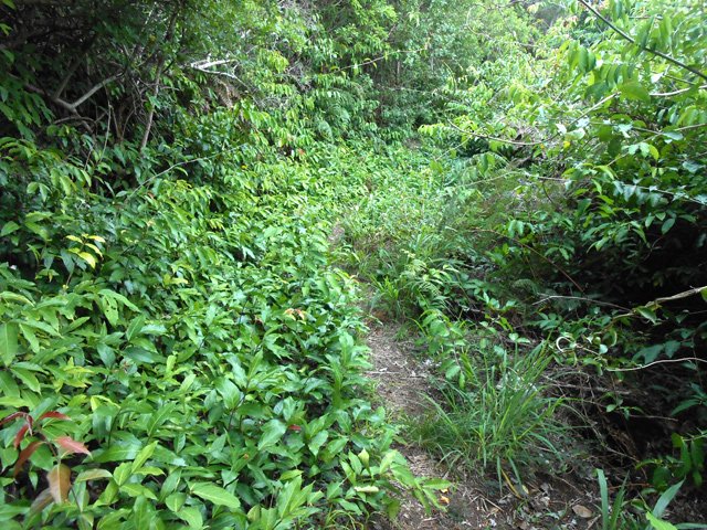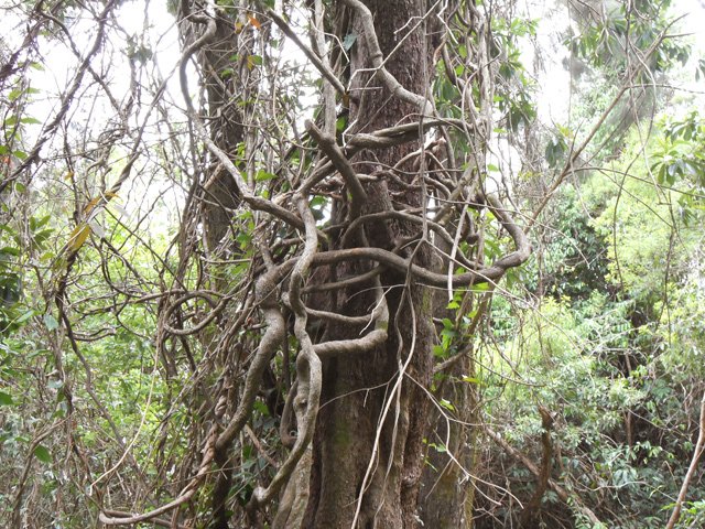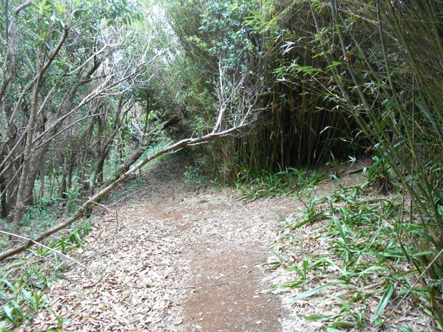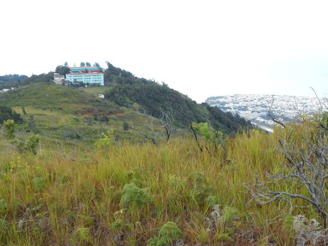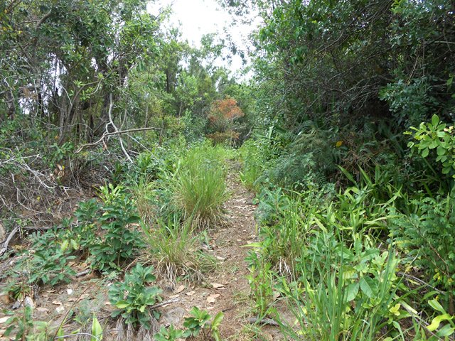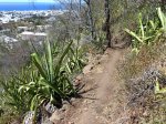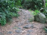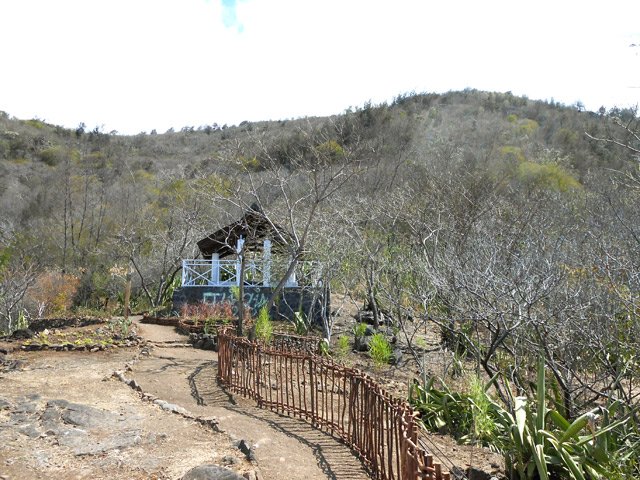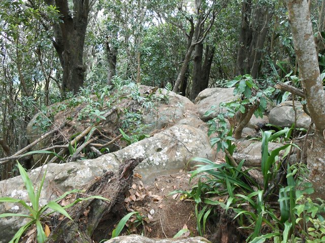La randonnée débute au très connu Stade de la Redoute en longeant la Rivière Saint-Denis sur un sentier agréable aménagé le long de la route de la Montagne. Les fascines de goyavier ont tendance à un peu vieillir mais la balade est plaisante malgré le bruit des véhicules. Un sentier rencontré sur la gauche dirige vers un oratoire et sur les berges de la rivière pour un petit détour facultatif. Poursuivre sur la route au pont Vinh San jusqu'au carrefour qui enjambe la route de Saint-Paul. Le sentier des Rampes de la Montagne est impossible à manquer sur la droite. Des panneaux explicatifs sont installés au départ de la forte montée (Photo 1). On commence par un sentier un peu ombragé qui rejoint les quatre canons qui pointent sur une partie de la ville (Photo 2). On poursuit en frôlant un kiosque de pique-nique en bordure de route (Photo 3). Suivre ce sentier de bonne qualité mais bordé en revanche d'une végétation très pauvre et sans attrait (Photo 4). Il grimpe en pente douce alternant des portions plus fortes comportant plusieurs lacets et quelques vestiges pavées (Photo 5). Le sentier s'approche plusieurs fois de la route de la Montagne puis se rapproche d'une case caractéristique aperçue depuis le bas. Quand on aperçoit la clôture d'enceinte de la villa, laisser le sentier partant sur la gauche vers la route et plonger vers le Bras Gentil par de nouveaux lacets sur un sol caillouteux. De l'autre côté de la ravine à sec, la pente constituée de courts lacets est rude mais courte. Le sentier se termine à la muraille qui sépare du Chemin de la Vigie. Rejoindre cette route, profiter du panorama sur la ville et poursuivre en marchant en direction de la Montagne. Une piste part sur la droite et rejoint le stade de la Vigie et plus loin, le Chemin des Prêles. Suivre cette route sur 250 mètres et partir sur la gauche sur un chemin pavé ombragé sous les filaos et bien évidemment dans les lianes papillon (Photo 5). Ce vestige du Chemin Crémont permet de rejoindre sans circulation la RD 41. Les pavés encore en place sont bien conservés (Photo 7). Dans le virage partant sur la gauche, emprunter le Chemin du Piton Trésor et le suivre sur 500 mètres avant de bifurquer à nouveau sur la gauche sur un sentier discret partant près des antennes relais. On marche facilement près de touffes de bambous, dans les chocas et sous les arbres. Le sol est recouvert d'une concentration exceptionnelle de liane papillon (Photo 8). Cette peste peut envahir des hectares en quelques années ; c'est pourquoi ce sentier doit absolument être pratiqué, faute de le voir tomber dans l'oubli (Photo 9). Des touffes d'herbe sont aussi inquiétantes car, si elles ne sont pas enlevées ou tondues, elles peuvent boucher le chemin en deux ans (Photo 10). Le parcours longe plusieurs fois des grillages (Photo 12). La végétation est irrégulière et parfois un peu envahissante mais on ne perd jamais le sentier (Photo 13). Il faut à un moment franchir quelques rochers mais sans danger, sauf par temps de pluie (Photo 14). De grosses touffes de bambous comportent des petites sentes utilisées par certains élèves pour fumer en cachette (Photo 16). Une fois passé le lycée qu'on aperçoit sur la droite, longer une petite falaise de tuf puis poursuivre dans les fougères, herbes et arbustes ras vers une zone rocheuse (Photo 17). Effectuer une halte pour profiter de splendides points de vue sur le chef-lieu qu'on voit en totalité jusqu'à Sainte-Marie. La zone est particulièrement rocheuse, créant plusieurs promontoires où il est facile de s'asseoir pour admirer le paysage (Photo 18). Le sentier se poursuit en forte descente vers la vallée qu'on aperçoit un peu plus loin. Un passage plus vertical que les autres est facilité par un long câble qui évitera la glissade par temps humide (Photo 19). Le terrain s'aplanit mais la végétation n'est pas domestiquée (Photo 20). On suit pourtant sans difficulté le sentier qui remonte petit à petit sous les filaos ou jamrosas sur une portion assez rocheuse (Photo 21). La montée est parfois rude, parfois glissante sur les aiguilles des filaos, les feuilles tombées au sol ou sur la terre humide (Photo 22). On ne tarde pas à rencontrer des portions du sentier venant de Saint-Denis, en très bon état en raison des passages fréquents. Deux solutions sont alors possibles. Rejoindre l'aire de loisirs du Colorado par le sentier puis la piste, ou prendre à gauche pour redescendre vers Saint-Denis. L'aire de loisirs ne se décrit plus et les chemins qui y mènent sont larges, très fréquentés et parfois glissants. La descente s'effectue sur un sentier de bonne qualité comportant parties glissantes, marches en bois, roches parfois surchauffées. Les points de vue sur Saint-Denis sont de plus en plus nombreux et on peut voir le lycée technique et ainsi mieux deviner le sentier (Photo 24). Profiter des derniers points de vue sur la vallée de la Rivière Saint-Denis et se lancer dans la descente vers la Redoute (Photo 25). Le sentier comporte quelques lacets et plonge parfois assez fortement sur des marches ou les roches qui dépassent (Photo 26). On a vite fait de rejoindre les eucalyptus qui dominent l'hôpital de Bellepierre (Photo 27) et lacets de la route de la Montagne qu'on peut utiliser en partant sur la gauche, en descente. Mais un sentier escarpé permet de dévaler la pente beaucoup plus rapidement vers le pont. Passer sous le pont et longer le sentier paysager utilisé au début de la boucle pour retrouver le véhicule (Photo 28).