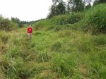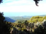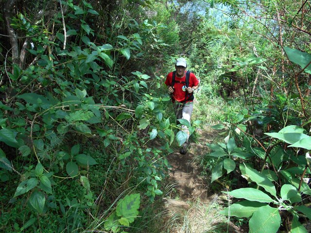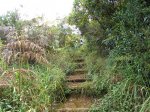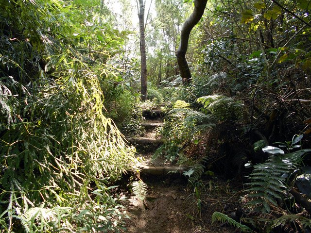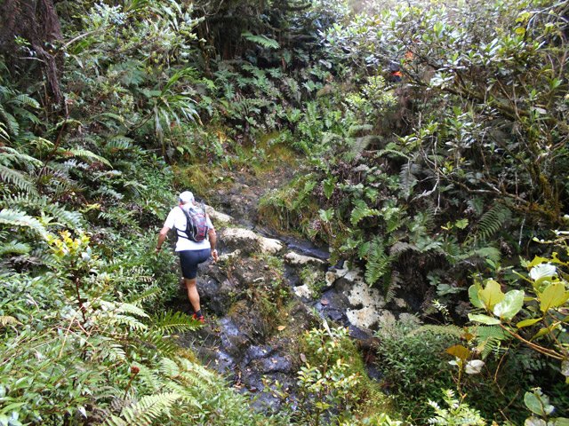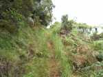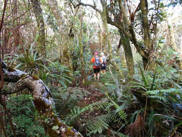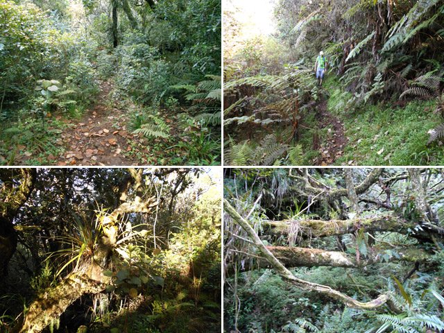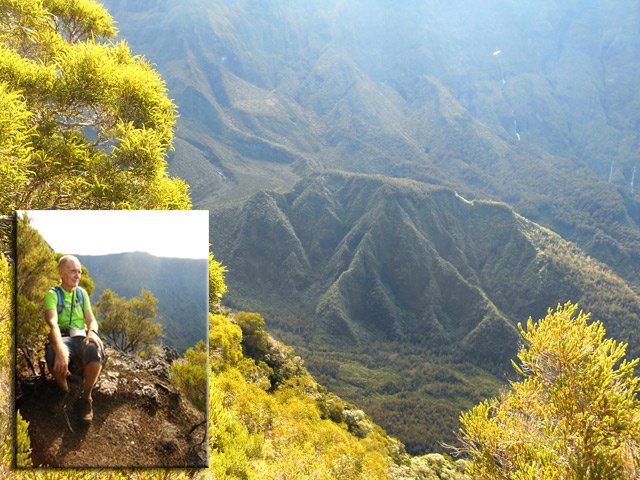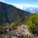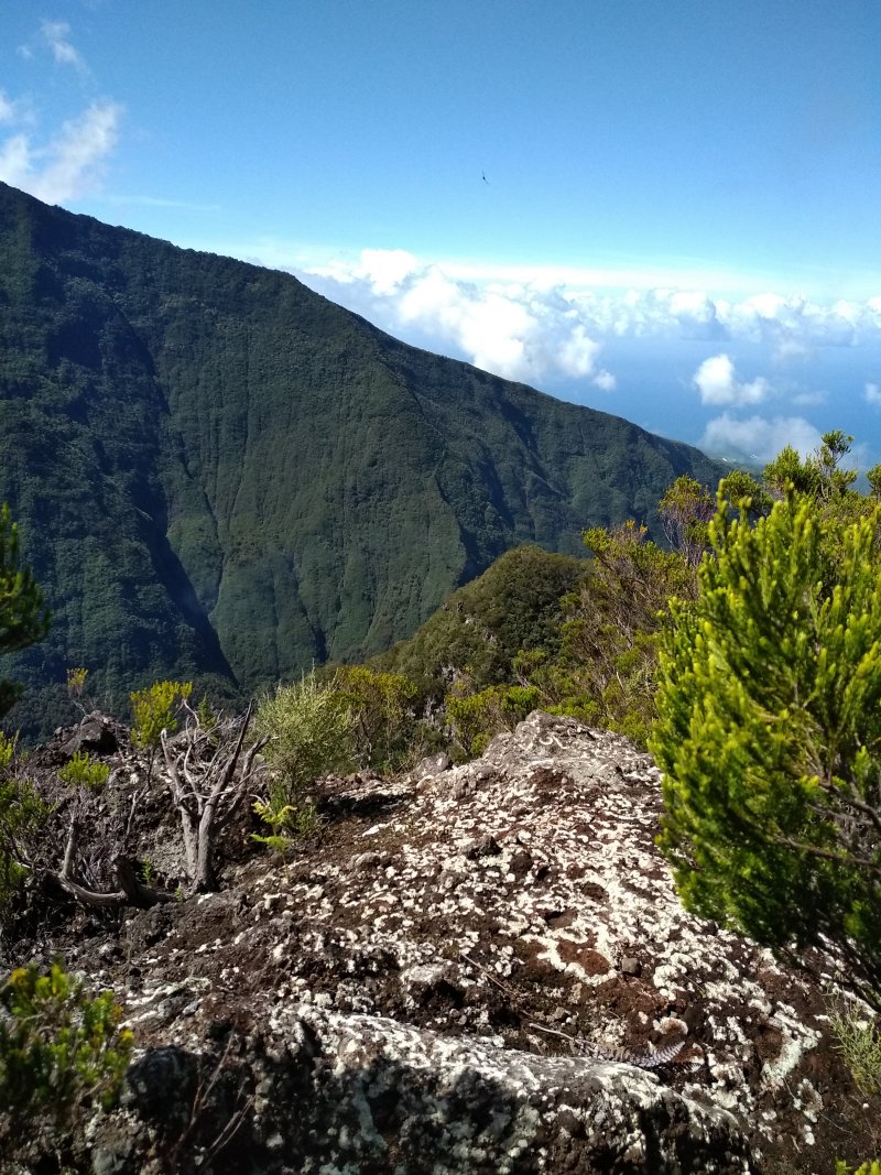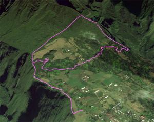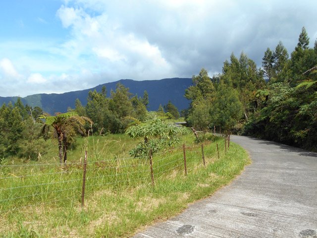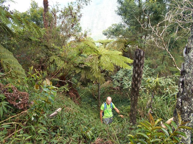 La randonnée débute au classique parking situé un peu plus haut que l'église du village. La piste d'atterrissage existe toujours mais ne semble pas servir tous les jours. L'herbe est déjà haute et mouillée le matin. Au rempart, désormais bouché par les plantes, plus de panorama sur la Rivière des Remparts pour admirer la vallée. La montée débute à droite en suivant un sentier un peu rétréci par la végétation, dont une zone de vigne marronne. La piste qui descendait en bordure de prairie est recouverte d'herbe mais le cheminement des randonneurs se voit très bien. Plus loin, la montée s'effectue sur une multitude de marches en rondins avec deux petits raidillons un peu plus raides que la moyenne. La végétation est importante mais le sentier facile à suivre (Photo 1). On parvient en une vingtaine de minutes de montée au kiosque et à ce super panneau. Un petit coup d'œil en passant au sentier de découverte permet de voir qu'il est beaucoup moins fréquenté que celui partant vers la gauche en direction du Morne Langevin . Partir sur la droite et longer le sentier encore visible sur de nombreuses portions (Photo 2). Ce coupe-feu rectiligne ne remplit plus depuis très longtemps son rôle de coupe-feu ; il semble même idéal pour le propager par la multitude de plantes qui l'on envahi ! Le sentier ne se perd jamais malgré son étroitesse par moments. Après une longue portion agréable et quasiment plate, il commence à monter parfois fortement et ne redescend que pour franchir des petites ravines au sol glissant (Photo 3). L'une d'entre elles, plus profonde, comporte une longe échelle de très bonne qualité (Photo 4). La forêt, de chaque côté, est idéale pour une leçon de botanique car on côtoie presque toutes les espèces, endémiques, exotiques ou invasives de ces altitudes. Vers la fin de cette longue ligne droite un peu aventureuse, on profite de rares points de vue dans les trouées de la végétation en direction de Grand Coude, Jean Petit ou Saint-Joseph (Photo 5). Compter près de 90 minutes pour rejoindre le rempart opposé. Durant cette traversée rectiligne, on rencontre deux sentiers partant sur la droite, qu'il faut délaisser. Comme pour le tour de Grand Coude, le seul but à atteindre pour ne pas s'égarer est l'éperon rocheux, étroit et vertigineux, qui permet de sublimes points de vue sur Grand Pays (Photo 6). Il ne faut donc jamais quitter cette trace tant qu'on n'a pas rejoint le rempart. L'éperon s'atteint après une marche de quelques dizaines de mètres le long de la falaise protégée du vide par les branles verts. Par beau temps, c'est l'endroit idéal pour se reposer de la traversée du coupe-feu. Le rempart se poursuit sur la gauche en direction du Morne Langevin (Photo 7). Les panoramas sur Saint-Joseph ne sont plus bouchés par les arbres et brandes (Photo 8). Le sentier qui redescend à Grand Coude est impossible à manquer puisqu'il passe sur cet éperon. C'est presque un GRR entre les branles verts qui le bordent (Photo 9). Plus bas, le sentier, bien que rétréci par la végétation se perd difficilement mais il faut rester vigilent tout de même (Photo 10). Il comporte des parties plates (Photo 11) et quelques pentes fortes qui sont souvent très glissantes. Le mieux est de se maintenir aux plantes, dont les sabres omniprésents. Nous avons réduit pour un temps la longueur des vignes marronnes rencontrées mais il faut quand même se baisser ou enjamber les troncs d'acacias tombées lors de cyclones. Là aussi, il faut près de 90 minutes pour atteindre la route, cachée par de hautes cannes fourragères (Photo 12). Partir vers la droite sur cette route bétonnée qui chemine dans les prairies durant 1800 mètres pour un vrai moment de repos avec des vues sur toute la région (Photo 13). La région est surtout constituée de pâturages et de quelques cultures (Photo 14). Poursuivre la traversée du plateau entre broussailles, prairies, bois de filaos et vues sur Grand Coude (Photo 15). Ne pas manquer le sentier qui part sur la droite après un oratoire et rejoint les Trous de Cissia par des dents de scie également envahies de végétation dont un ancien champ recouvert de vigne marronne (Photo 16). Ne pas oublier le coupe-coupe pour éviter les griffures désagréables. Le sentier, assez fréquenté, comporte de belles portions entre les bois de couleurs et les fougères (Photo 17). Quand les jouvences s'en mêlent, le passage est bouché mais le sentier se devine aisément (Photo 19). Au premier croisement, prendre à droite et rejoindre en une minute le bord du Grand Trou puis descendre au fond du maar Un maar est un cratère volcanique d'explosion créé par la lave entrée en contact avec une nappe d'eau marécageux qui comporte un puits entouré d'une murette dans les joncs et oseille sauvage (Photo 20). Profiter de la vue sur la forêt de bois de couleurs qui tapisse ses flancs (Photo 21) avant de remonter et rejoindre le sentier du rempart sur une très agréable trace (Photo 23). Reprendre le sentier employé en début de boucle en sens inverse (Photo 25). Poursuivre tout droit et retrouver les branles verts dévorés par la végétation (Photo 27) et les hautes herbes où il faut chercher la trace des yeux (Photo 28). La descente, moins humide depuis que la rosée s'est évaporée, s'effectue rapidement jusqu'au parking.