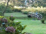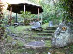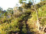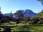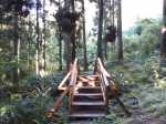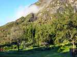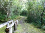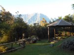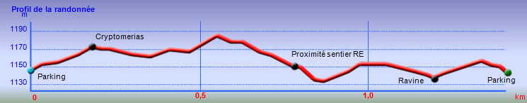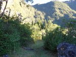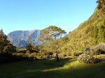 La randonnée débute à quelques mètres de l'aire de pique-nique fermée par une barrière. Du parking situé en haut de la côte, on bénéficie d'un splendide panorama sur le Gros Morne (Photo 1) et le Piton d'Anchaing (Photo 2). Grimper au premier kiosque qu'on aperçoit de la route (Photo 3). Commencer la boucle aux escaliers frôlant ce kiosque où l'on repère la première balise émaillée indiquant le départ (Photo 4). On en retrouvera d'autres tous les 100 mètres. Prendre à droite en grimpant les quelques marches et se laisser guider tranquillement par les balises. On trouve tout d'abord des goyaviers très fournis à la saison qui bordent le sentier herbeux (Photo 5). Quelques vestiges de parcours sportif bordent le sentier mais gare aux échardes (Photo 8) ! Difficile d'imaginer le sentier de la Roche Ecrite sur la gauche de l'impressionnante falaise qui domine le site (Photo 9). Le sentier se rapproche de la petite forêt de cryptomerias et y pénètre près d'une ravine coulant dans les pierres (Photo 10). La balade est aussi agréable que depuis le début même si la lumière a du mal à traverser la canopée (Photo 11). On traverse ainsi de nombreuses ravines dont la Ravine Blanche alimentée par la petite cascade tombant de la falaise (Photo 12). De nouvelles passerelles de très bonne facture remplacent les anciennes faites de rondins de cryptomeria (Photo 13). La traversée est rapide puis on poursuit sur une petite piste bordée de longoses et de jouvences (Photo 14). On retrouve les goyaviers inévitables de cette région où quelques tentatives d'éradication sont tentées de manière optimiste (Photo 15). Impossible de trouver la moindre difficulté sur ce circuit taillé pour marmailles (Photo 18). La boucle passe près du sentier de la Roche Ecrite puis revient sur la gauche en direction des kiosques. On voit mieux la forêt de cryptomerias qu'on vient de traverser au pied des petits pitons (Photo 20). On retrouve très vite l'aire de repos sans pour cela quitter les goyaviers (Photo 21). Obliquer sur la droite et franchir une zone marécageuse sur une longue passerelle (Photo 22). Se diriger vers le kiosque situé le plus à droite après la passerelle (Photo 23). Trouver, tout près de ce kiosque, le sentier qui descend vers la ravine qu'on entend couler (Photo 24). Les pierres sont un peu glissantes mais l'endroit n'est pas dangereux. Il peut même amuser les enfants en attendant le casse croûte. Il ne reste plus qu'à rejoindre le point de départ en appréciant les paysages qui entourent l'aire (Photo 26) ou les installations elles-mêmes (Photo 27).