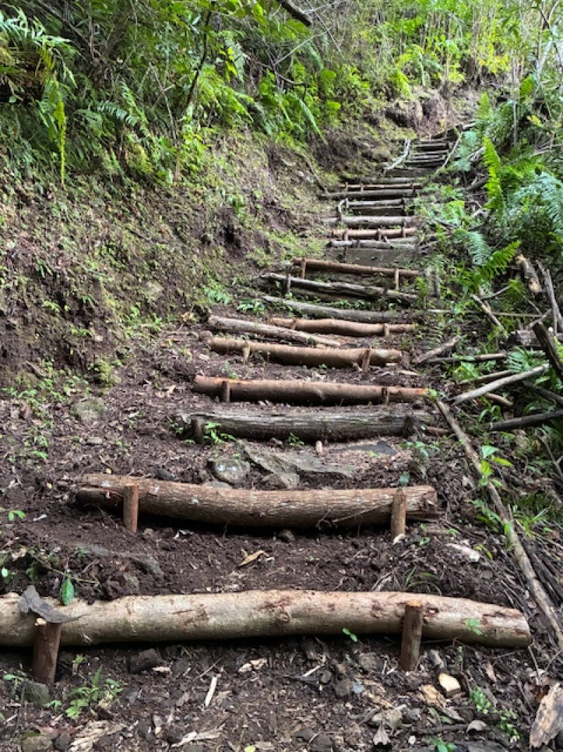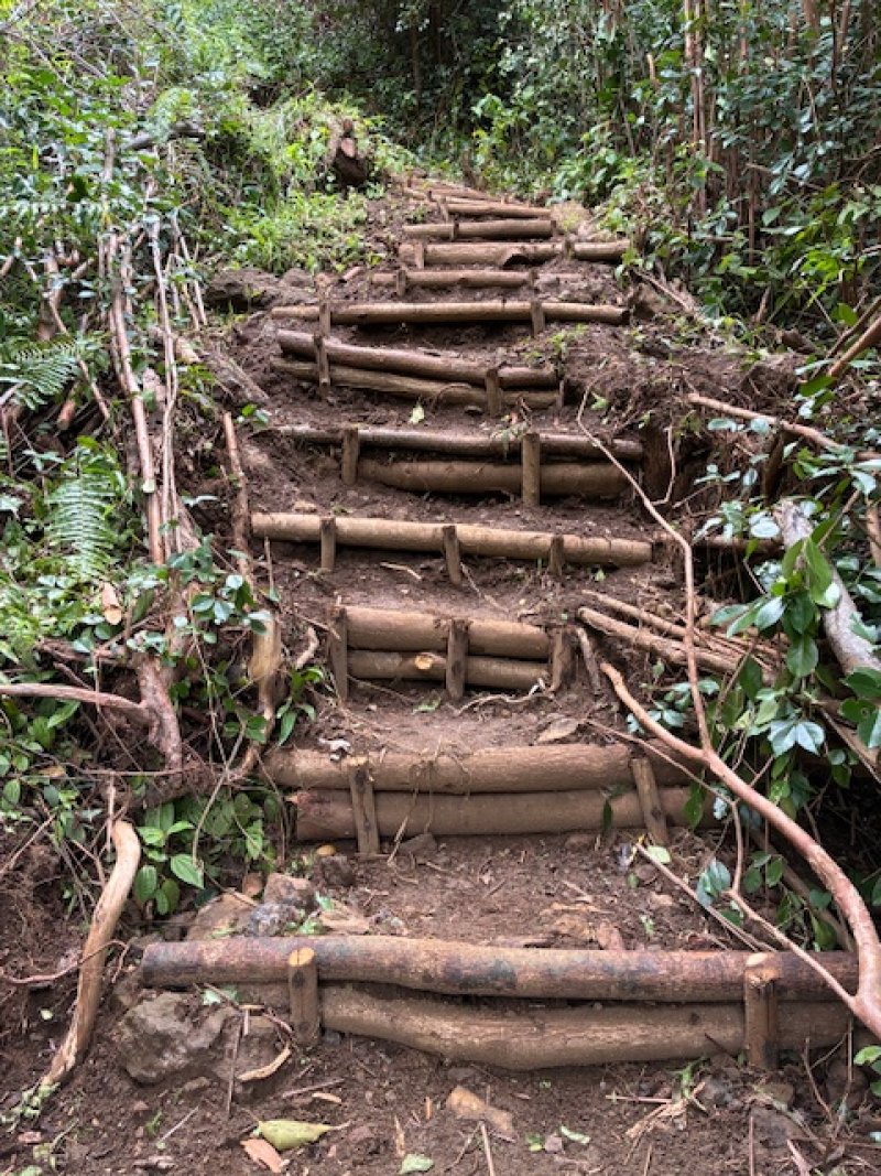 Bonne nouvelle. La toujours dynamique ADE (Association de Développement de l'Espérance) a remis en état le sentier de l'Echelle. L'éboulis a été déblayé et les marches endommagées ont été consolidées ou remplacées sur l'ensemble du sentier reliant l'Espérance les Hauts à la Confiance les Hauts. La partie haute de la boucle n'a pas été rénovée, mais a été entretenue. En résumé, toute la randonnée est réalisable conformément à la fiche, avec cependant quelques changements par rapport aux photos et au descriptif : les bancs n'ont pas été réparés, la table de pique-nique a disparu et les rambardes n'ont pas partout été remplacées. Ce dernier point doit inciter à la prudence. Ce qui n'a pas changé, c'est l'absence totale de panneaux indicateurs ou de balises ! Il reste recommandé d'enregistrer la trace pour trouver les accès au sentier.