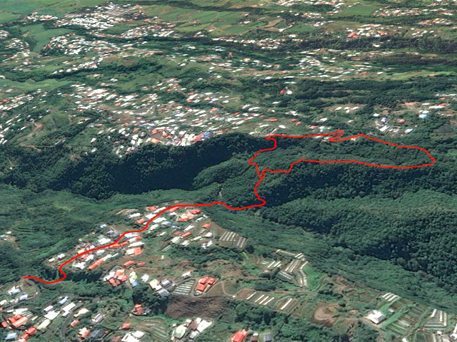 Par la route, il y a 7,5 km entre les deux débuts de sentier présentés ici. Durant de longues générations, les habitants des deux villages se rendaient visite en empruntant le sentier escarpé de l'échelle, le tout pour environ 1 km en utilisant la partie nord de la boucle. Remis en état de manière exemplaire par l'ADE présidée par Monsieur PAUSE (Association de Développement de l'Espérance), cette boucle permet de se mesurer à de véritables murailles sur un sentier aux hautes marches bordées de verdure. La boucle reliant les deux villages, on peut partir de l'un d'entre eux sans préférence. La boucle présentée ci-dessous débute à l'Espérance les Hauts. Une excellente idée pour calmer les ardeurs d'un enfant voulant marcher moins de 3 kilomètres ou amener belle maman qui se plaint toujours de ne pas être conviée aux randonnées ! Circuit idéal pour les habitants du chef-lieu qui peuvent l'effectuer 4 ou 5 fois de suite dans le cadre d'un entraînement à une compétition de montagne comme on les aime tant à la Réunion.
