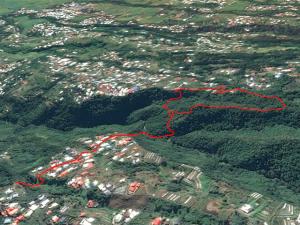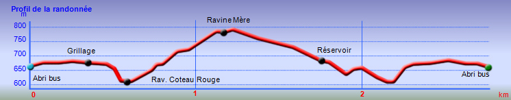 La randonnée débute à l'arrêt de bus "Ravine Grimm" au début de la Rue de la Ravine Rose qu'on longe sur une centaine de mètres, jusqu'à de nombreuses boîtes aux lettres (Photo 1). Poursuivre tout droit le long de la Rue de la Ravine Rose. Les ruelles étroites et les bandes de roulement peuvent laisser penser qu'on s'est égaré et qu'on va pénétrer dans une propriété privée. Il n'en est rien car à la fin de ces ruelles, un double grillage encadre le début du sentier sur la gauche (Photo 2). Aucune signalisation ne vient aider en cas d'hésitation. Espérons que cette idée a été prise en compte par l'association qui ne devrait pas se ruiner en ajoutant quelques flèches ou un panneau à l'entrée. A la fin de la clôture, le sentier débute sa plongée vers la Ravine Sèche (Photo 4). On se retrouve très vite face aux premières marches et balustrades en bois de goyaviers (Photo 5). Certaines marches sont plus hautes que les autres et se sentent très bien au retour malgré la courte distance à parcourir (Photo 6). Heureusement, les autres portions du sentier ressemblent souvent aux autres de la région constitués de marches plus faciles (Photo 7). Mais la pente est le plus souvent très forte et demande de sérieux efforts, surtout à la remontée (Photo 8). En face, les flancs très pentus du rempart de la Ravine Sèche en direction de la Confiance peuvent inquiéter mais le circuit fait une longue boucle vers le sud pour atténuer la montée (Photo 9). Après quelques lacets puis une dernière descente bordée de bananiers, on arrive à la Ravine Sèche, quelques mètres après la jonction de la Ravine du Coteau Rouge (Photo 10). Le fond est constitué de grosses roches qu'on passe sans difficulté (Photo 11). S'il a plu, les roches sont glissantes et il vaut mieux mouiller les pieds que déraper. La remontée est immédiate sur le même type de sentier constitué de terre et de goyaviers (Photo 12). Les lacets sont plus rares et les lignes droites peuvent décourager les moins entraînés (Photo 13). Les beaux et gros arbres sont rares mais on remarque quelques bois de remparts bordant les escaliers (Photo 14). Après de nouveaux lacets et quelques fortes pentes, on rencontre une bifurcation qu'on retrouvera en revenant vers l'Espérance. Prendre à droite et poursuivre sur un sentier comportant moins de bois. Les marches sont creusées dans la terre et supporteront moins les assauts de la pluie que les précédentes. A mi-pente, un banc permet de se reposer (Photo 15) et profiter des panoramas sur la Côte (Photo 16). La pente, constituée de ces multiples marches creusées dans la terre, devient moins forte, les goyaviers sont remplacés par des branles verts (Photo 17). Plus haut, ce sont les filaos et les petits bois de rempart qui dominent sur la crête étroite (Photo 19). Prendre à gauche au prochain petit croisement puis redescendre de quelques mètres jusqu'à une table de pique-nique puis rejoindre la ravine Mère Canal dans un magnifique cadre sauvage (Photo 22). En amont ou en aval du gué, le cours d'eau propose cascades, toboggans et petits bassins mais gare à la glissade par temps humide pour les approcher. Ne pas manquer la cascade sur la droite qui tombe d'un pont naturel creusé dans la roche. Un petit sentier du côté de la table de pique-nique permet de s'en approcher sans danger (Photo 23). Très vite après le gué, on rencontre le sentier qui remonte vers la Maison Martin en longeant une canalisation. Bifurquer sur la gauche pour une marche aisée dans les goyaviers sur un sol parfois glissant (Photo 24). Rejoindre rapidement le Chemin de la Fleurette, constitué ici de deux bandes de roulement bétonnées. Marcher 350 mètres sur ce chemin et retrouver une case modeste sur la gauche, en face du réservoir d'eau et près de plusieurs boîtes aux lettres. La route est large puisqu'elle a été aménagée pour les bus qui y font demi-tour. Le sentier de retour se trouve entre les boîtes et la case (Photo 25). La pente est un peu moins forte que celles utilisées jusqu'alors. Le sentier passe près de bananiers et s'approche de la Ravine Mère Canal, assez glissante et délicate à traverser en période de pluies. Une petite chute agrémente cette traversée de ravine (Photo 26). Poursuivre par une pente comportant les habituels escaliers parfois assez forts (Photo 27). Retrouver un peu plus loin le croisement rencontré en première partie de boucle (Photo 28). La fin du circuit s'effectue sur le même itinéraire qu'en début de boucle sur des pentes de plus en plus marquées.
