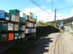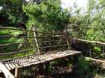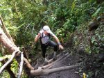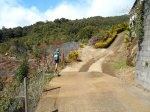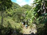 Cette courte et escarpée balade est très agréable, ombragée, aménagée en branches coupées avec une belle récompense à la cascade. La première curiosité vient des lacets de la route qui monte au départ. Voir la dernière photo qui n'en montre qu'une petite partie. un vieux panneau défraichi en bois indique le départ dans le village, juste après, un panneau propriété privé vous indique lui aussi l'entrée du sentier plus une flèche au sol. Ensuite le cheminement est tellement encadré par les branchages bien assemblés qui proposent en permanence deux mains courantes, qu'il vous suffit de les suivre. Les marches sont hautes et les pentes fortes. Quand comme moi vous trainez un surpoids c'est sportif. La cascade est très belle sortant d'une arche. La case rouge servant, à la confiance, de repère pour sortir de la route à gauche est maintenant grise. mais les branches assemblées servant de main courante à coté des boites aux lettres sont une bonne indication. Cette partie du sentier qui permet de boucler est bien moins utilisée et la végétation cache parfois les marches : attention aux poses de pieds. On en ressort le pantalon couvert de graines. A enlever donc avant la prochaine rando ;) Merci à Rando Pitons pour cette découverte.