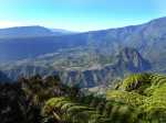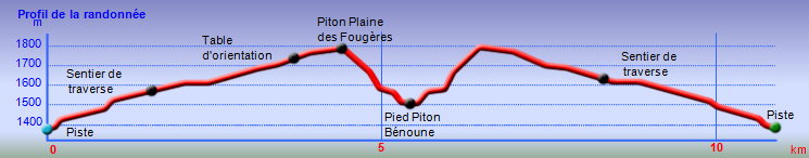 La randonnée débute presque à la fin de la piste partant au petit village de la Maison Martin si la barrière est ouverte. Trouver, dans le virage, proche d'un emplacement de pique-nique, le départ du sentier qui va longer le Bras Sec durant 1500 mètres avant la première bifurcation. Le sentier est étroit et agréable au milieu des fougères (Photo 1). Si on s'arrête n'importe où, il est possible de voir d'un seul coup d’œil une bonne dizaines d'espèces et de variétés de fougères, du sol jusqu'en haut des arbres. Certaines zones sont de plus en plus envahies de longoses (Photo 2). Près du rempart du Bé Massoune, des espaces sont nettoyés mais il est presque impossible de se débarrasser de cette plante à rhizome. La pente est faible et la marche rapide. On atteint donc rapidement une zone envahie de bois de raisin (Photo 5). Un croisement se présente avec quelques poteaux de l'ONF. Prendre à droite en pénétrant aussitôt sous deux tamarins en pont naturel (Photo 6). La traversée constituée de montées et descentes faibles s'effectue en une vingtaine de minutes. On coupe quelques ravines au fond moussu (Photo 7) et on en passe d'autres à gué (Photo 8). On arrive ainsi au rempart qui domine la Rivière des Pluies, un bon kilomètres en amont du belvédère qui permet d'en admirer le fond. Tourner à gauche sous les magnifiques tamarins entourés de calumets (Photo 10). La montée reprend, un peu plus forte, en direction de la table d'orientation. Le sentier alterne les portions boueuses (Photo 13), sèches sous les tamarins et calumets (Photo 12) ou sur quelques caillebotis qui isolent des portions marécageuses (Photo 11). C'est donc les pieds un peu crottés qu'on parvient à ce point de vue qui offre de magnifiques panoramas sur le Cirque de Salazie (Photo 15). Le Piton d'Anchaing en occupe le centre et le Gros Morne domine l'ensemble. Obliquer à droite près d'un tronc au sol et débuter la montée au Piton Plaine des Fougères (Photo 16). On retrouve à peu près le même type de terrain, moins humide cependant. Les portions herbeuses suivent les planches qui isolent du sol mais ce sont surtout les racines de branles qu'on remarque le plus (Photo 17). Nouveaux panoramas sur le cirque au sommet du piton d'où l'on remarque l'importance de Grand Îlet. D'ici, on comprend mieux son nom (Photo 18). L'aventure peut débuter en direction du Piton Massoune. Inutile de chercher son chemin car il est bien tracé et suit au plus près la ligne de crête étroite (Photo 19). Le plus souvent, la crête est arborée de branles verts et gris et bien sûr de fougères (Photo 20). Le cheminement est tout d'abord facile puisqu'en pente faible ou à plat sur l'arête (Photo 21). Mais la descente s'accentue et la balade se transforme en expédition technique par moments (Photo 22). A un moment, il vaut mieux ne pas avoir le vertige pour franchir 4 ou 5 mètres plus dénudés et rocheux (Photo 24). A tout moment, on se régale des paysages vers les îlets du bas ou la Mare à Martin (Photo 25). Il faut choisir : regarder le paysage ou marcher mais éviter les deux en même temps. Il faut constamment chercher la meilleure place pour les semelles et surtout les mains, indispensables pour cette descente. On voit souvent dans les trouées se rapprocher le Piton Bénoune (Photo 23) qu'on atteint enfin. La trace, discrète se poursuit vers le sommet mais cette descente représente déjà une belle randonnée sportive qui laissera des souvenirs aux rares téméraires qui oseront la tenter.La remontée vers le Piton Plaine des Fougères est très rude mais moins dangereuse qu'à la descente. La montée paraît interminable, pourtant la distance est courte. Une fois au point de vue, reprendre le chemin inverse ou décider à ce moment de prendre un des deux itinéraires restants pour rejoindre la Maison Martin.