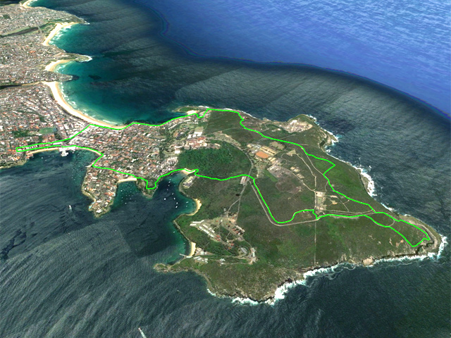 Si Sydney est visitée pour son architecture moderne et ses gratte-ciel, on se rend en bateau à Manly pour se baigner ou faire du surf. La très longue plage de Manly peut accueillir des milliers de baigneurs qui se reposent ensuite au soleil. Très peu ont poussé de quelques centaines de mètres en direction du parc. Et si l'on randonnait à Manly ? La ville est prolongée d'une presqu'île abritant le Sydney Harbour National Park dans lequel on peut évoluer sur plusieurs sentiers, au choix. La carte ci-dessous propose le circuit le plus long permettant de visiter la côte rocheuse du Sud de la presqu'île. On a de beaux panoramas sur Sydney et Manly. Une faune variée peut se rencontrer sur les rochers ou dans les arbres, principalement des oiseaux et des reptiles. Le paysage, semi désertique par endroits, contraste totalement de la ville balnéaire toute proche.