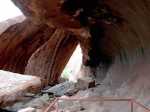 La randonnée débute au parking obligatoire et rejoint rapidement la muraille ; il suffit de prendre à gauche et de suivre le sentier, large, propre et accessible aux handicapés (Photo 2). On circule tranquillement de pancartes explicatives en pancartes d'interdictions et des haltes sont nécessaires assez souvent pour étudier de plus près la géologie des lieux. Des rambardes sommaires indiquent naturellement les lieux qu'il ne faut pas visiter plus près (Photo 3). La pente de la falaise est variable en fonction de la position du marcheur mais il est presque impossible de grimper directement sur le roc (Photo 4). Certaines parties semblent avoir été soulevées de terre et comportent quelques petites grottes (Photo 5). La couleur ocre ressort très bien si un rayon de soleil frappe les hautes falaises (Photo 7). Un peu partout, des trainées noires indiquent l'emplacement des cascades lorsqu'il pleut, ce qui est relativement rare au milieu de ce désert (Photo 9 et 10). Certaines grottes sont assez importantes (Photo 11) mais c'est la vague de grès qui est la plus impressionnante (Photo 12). Il est possible de marcher dessous pour en apprécier la taille et surtout cette forme d'écume rouge figée où l'on s'attend à voir un surfeur (Photo 13). Des eucalyptus arrivent à pousser autour du rocher, signe qu'il y a sans doute de l'eau régulièrement (Photo 15). Des réserves naturelles retiennent l'eau de pluie quelques temps mais peuvent s'assécher en quelques semaines (Photo 16). Des passerelles permettent de s'approcher des principales, sans doute connues des wallabies vivant dans les environs (Photo 17). Parfois, le sol est recouvert de rochers, issus de très anciennes érosions, qui sont accolés ou empilés au plus près du sentier (Photo 19). Prendre tout son temps car il y a toujours une curiosité au plus près du sentier. Il est aussi possible d'effectuer du hors sentier afin d'aller à la rencontre de la faune (Photo 21) où il sera facile de trouver insectes, oiseaux et wallabies à la tombée de la nuit. Tenter de repérer les centaines de scarabées sortant de sous les écorces une fois le soleil au plus près de l'horizon (Photo 24).