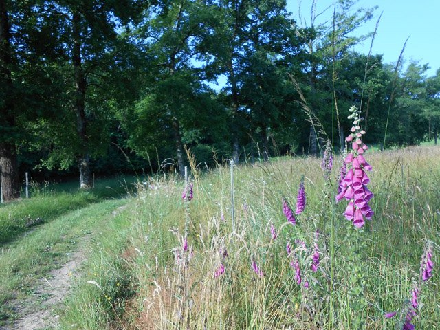 La randonnée débute au village de Saint-Yrieix sous Aixe qui est une des plus petites communes de la Haute Vienne. Elle compte moins de 450 habitants mais elle en a abrité beaucoup plus au cours de l'histoire avec un record de 608 âmes en 1881. Comme ce village était cité chaque année parmi les lauréats des villages fleuris de France, il reste partout, dans les jardins et autour des habitations, des centaines de fleurs ou plantes qui le colorent du printemps jusqu'à la fin des chaleurs. Si on ne se promène pas dans ce village avant de démarrer les deux boucles, il ne faut pas partir sans avoir arpenté ses courtes rues. Il est possible de stationner au plus près de l'église (Photo 1). On démarre tranquillement vers le cimetière et on descend le long de la route pour prendre la première bifurcation à droite. On se retrouve face à un étang qu'on contourne pour prendre la direction du superbe hameau de la Roche (Photo 2). On aperçoit, de l'autre côté de la vienne, l'immense carrière d'extraction de pierre de Pagnac (Photo 3). Contourner le petit village par le nord et prendre un adorable sentier creusé et bordé de grandes haies de noisetiers et de chênes qui se termine à des murailles moussues bordées de lierre (Photo 4). On a l'impression de marcher dans une étroite douve herbeuse envahie d'une espèce de pélargonium sauvage (Photo 5). Une pancarte discrète indique la fontaine qui se rejoint en une minute. Elle mériterait un bon nettoyage et une mise en valeur derrière sa grille (Photo 6). Là également, ne pas poursuivre sans une visite dans les rues pour profiter du calme, des vieilles pierres, des treilles de vigne et des fleurs partout (Photo 7) ou de ce beau portail sculpté bordé de deux portes au style roman (Photo 8). Pas de difficulté pour rejoindre la route puis le bord de Vienne mais la rivière est difficile à atteindre. Un sentier part sur la droite et remonte légèrement. Ne pas manquer sur la droite un immense chêne à 30 mètres du sentier sur la droite (Photo 9). Trouver la piste qui passe entre les étangs est facile et on s'engage aussitôt dans un large chemin traversant un bois de chênes (Photo 10). Flâner à la saison car les cèpes poussent parfois au plus près du chemin dans la mousse sous les arbres. Pas de difficultés pour suivre le chemin entre prairies et champs et prendre la direction du Château du Mas Marvent (Photo 11). On passe tout d'abord près du club hippique repéré à son panneau indiquant des passages possibles de cavaliers (Photo 12). On aperçoit même quelques chevaux et poneys s'abritant du soleil sous les chênes (Photo 13). Poursuivre et frôler le grand panneau "Dechen Chöling" (Photo 14). Le château est occupé par un centre de méditation, de yoga et de bouddhisme. Le chien n'a pas suivi tous les cours et un bâton à la main peut s'avérer fort utile. De même, on croise dans les chemins alentour des gens qui regardent les champs et répondent à peine à un salut pour ne pas interrompre la contemplation d'un champ de blé ou un grand arbre (Photo 15). On bifurque à gauche pour suivre une très longue et agréable piste herbeuse bordée de prairies, chênes, fleurs de toutes couleurs (Photo 16). C'est l'heure de la halte pour une contemplation individuelle ! On parvient, après une centaine de mètres d'ascension depuis les étangs, au hameau de Ratterie. L'endroit respire le calme et la sérénité. Des puits en pierre ou des bacs creusés dans le granite accueillent des fleurs de toutes les couleurs (Photo 17). La petite boucle qui s'éloigne de Ratterie pour y retourner très vite peut paraître curieuse sur la carte mais il ne faut pas, là non plus, l'éviter car le sentier est très agréable. Il est bordé de houx et la marche s'effectue sur l'herbe (Photo 18). Il revient dans Ratterie entre une clôture et une murette (Photo 19). Poursuivre en sous-bois vers Chez Pouzy en suivant les balises jaunes (Photo 21). Le retour à Erin emploie quelques tronçons de petite route étroite. Le retour vers Saint-Yrieix s'effectue au début sur de beaux chemins entre chênes et prairies (Photo 22) ou en sous-bois ombragés sur une pente très faible (Photo 23). Après une longue boucle, le parcours emploie un peu de l'agréable route passant par la Graulière (Photo 24). Les granges ont souvent la même forme dans une grande partie du Limousin. Le bâtiment principal comporte un très grand portail pour laisser passer les remorques de foin ou de paille et une à deux étables latérales accueillaient les bovins (Photo 25). Il est très rare désormais d'y rencontrer un élevage. On retrouve de nouvelles prairies plus ou moins étendues (Photo 26) et les inévitables troupeaux de limousines cherchant de l'ombre (Photo 27). Prendre à droite avant les maisons du Bos Lagarde et reprendre le chemin arpenté en montant à travers champs et cultures (Photo 28). Passer entre deux étangs et bifurquer à gauche pour suivre le chemin qui longe d'autres étendues d'eau. On retrouve le premier étang contourné en début de boucle et le retour au village ne prend que 5 minutes.