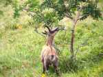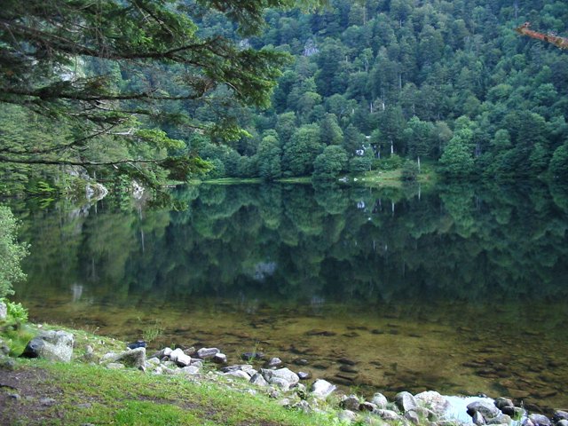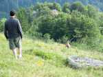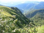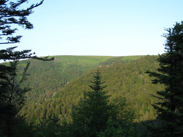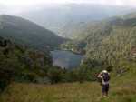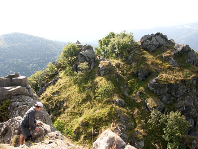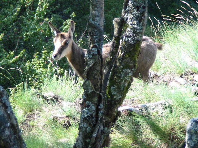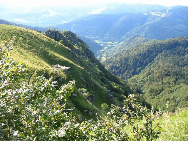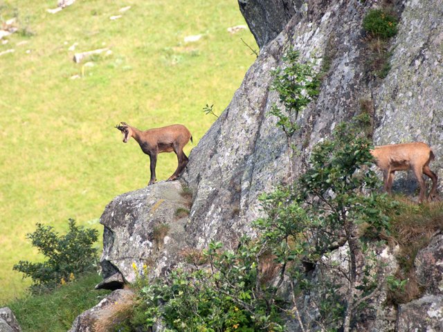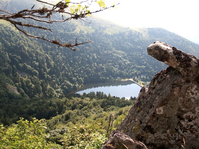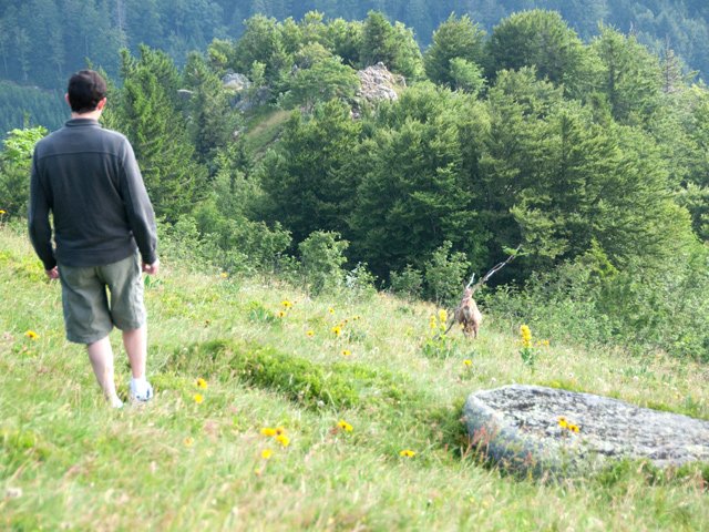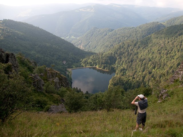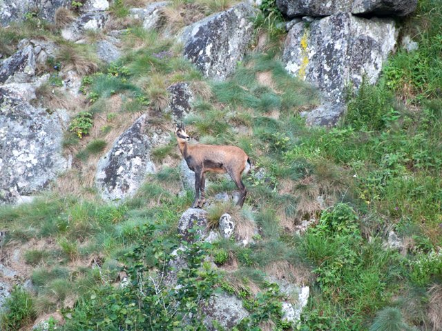 La randonnée débute près de Mittlach et Metzéral au pond sur la Grande Fecht où il est possible se stationner à plusieurs emplacements. Certains randonneurs plus pressés préfèrent rouler sur la piste et se rapprocher au plus près du lac de Fischboedle pour gagner près de 6 km. Quand la végétation a bien poussé, on est assuré de rayer un peu les côtés du véhicule. La piste entame une longue montée de près de 300 mètres pour se rapprocher du minuscule petit lac entouré de verdure en surplombant le ruisseau au nom imprononçable de Wormsabachrunz. L'effort est constant et tout à fait supportable. Les sapins ont bien souffert des pluies acides mais il reste encore beaucoup de verdure tout au long de cette journée. Après une halte au superbe petit lac, remonter d'une bonne centaine de mètres vers le lac de barrage du Schiessrothried par des lacets courts et pentus sous les sapins. Prendre à droite au premier embranchement et rejoindre le barrage qui permet de traverser la zone en direction du Petit Hohneck. Le lac est entouré de sapins et dominé par les premiers rochers du Hohneck qu'on devine à l'horizon (Photo 1). L'eau est claire et profonde mais très fraîche une grande partie de l'année (Photo 2). Les prairies d'altitude au-dessus des sapins donnent une idée de la pente qu'il reste à gravir (Photo 3). Puis une nouvelle montée en forte pente tout en lacets grimpe de 200 m vers les premières pentes du Petit Hohneck. La montée s'effectue principalement en forêt de sapins et de hêtres. A l'approche de Schiessroth, la forêt disparaît et la marche devient plus agréable en partant à gauche vers le Hohneck. On domine toute la région en profitant de magnifiques panoramas (Photo 5). On repère de loin les villages, le lac, les prairies sommitales et les zones vertes dégagées où il est déjà possible d'apercevoir les premiers chamois (Photo 6). Si les vaches, lorsqu'il y en a, sont faciles à voir, c'est différent pour les chamois qui cherchent la discrétion et se cachent sur les flancs parfois abrupts (Photo 7). Les jumelles peuvent s'avérer utiles, surtout s'ils ne bougent pas pour attirer le regard (Photo 8). Une bonne partie du "troupeau" se cache sur les flancs du Wormspel dans les zones les plus rocheuses (Photo 10). En s'approchant sans bruit, il est aisé de les surprendre, soit couchés à rêvasser soit sur des rochers en train de guetter (Photo 11). En général, ils ne bougent pas et ne s'enfuient qu'en cas de danger ou d'intrusion dans leur milieu (Photo 12). Il faut profiter des animaux si on les repère mais ne pas manquer pour autant les magnifiques paysages dominant le lac de Schiessrothried (Photo 13 et 14). La prairie très fleurie est parsemée de rochers parmi lesquels ils peuvent de cacher (Photo 15). Quand la pente est faible et que l'animal insouciant broute tranquillement, il est possible de l'approcher sans faire de bruit ou de mouvement hostile (Photo 16). Un sentier escarpé qu'on va bientôt emprunter descend vers le lac mais en cas de recherche infructueuse, on est certain de les apercevoir en se dirigeant vers les rochers du Spitzkoepfe. Pas de sentier dans cette zone rocheuse mais de multiples passages faciles pour l'homme à la condition de prendre garde à la chute (Photo 18). Les chamois préférant les rochers à la plaine, se repèrent très vite sur les corniches étroites (Photo 19). S'ils sont nombreux et qu'il y a des jeunes, c'est toujours un spectacle de les voir chercher à s'installer tous au même endroit quitte à se bousculer un peu. D'autres profitent des rayons du soleil pour sommeiller au calme (Photo 20). A la saison, laisser le regard errer dans les prairies pour y repérer ces magnifiques lys (Photo 21) ou les gentianes qui se remarquent de très loin à leur hauteur et à la couleur jaune soutenu de leurs fleurs (Photo 22). A la fin de la zone rocheuse, on rejoint facilement le sentier qui mène au lac en descendant hors sentier sur quelques centaines de mètres. Pour cela, il vaut mieux être déjà venu dans cette région ou avoir un bon sens de l'orientation. Le mieux est donc de remonter un peu et de prendre le sentier qui plonge vers le lac qu'on atteint en une heure. Une fois au barrage, ne pas partir vers la digue mais redescendre au sud pour récupérer le sentier pris à l'aller. D'autres sentiers ou pistes descendent en direction de Metzéral mais il vaut mieux emprunter la piste du matin.