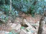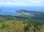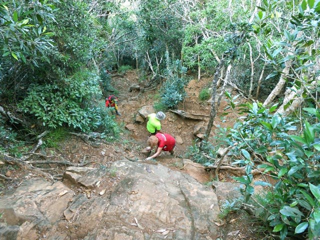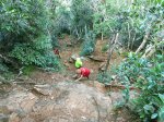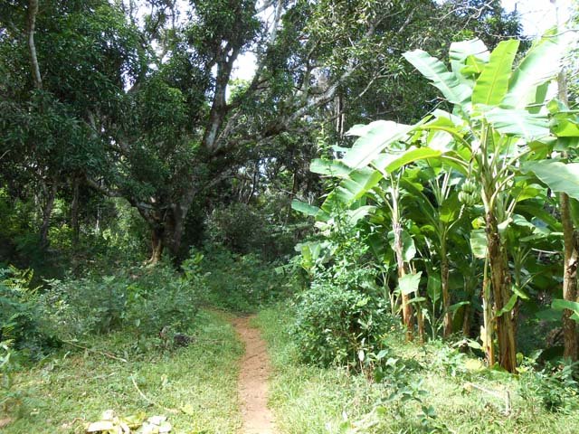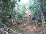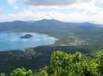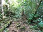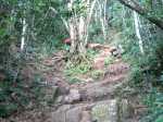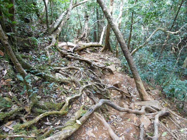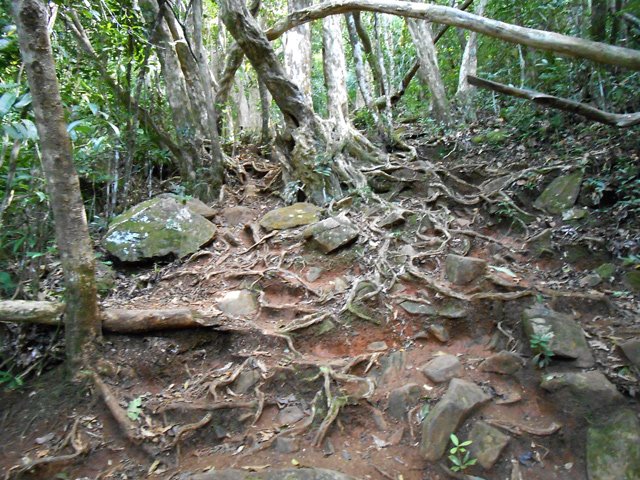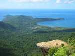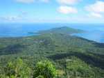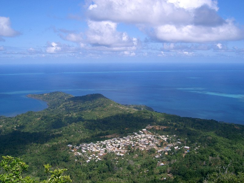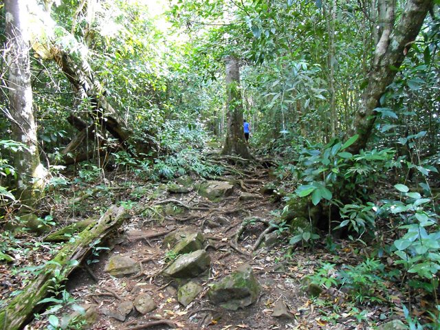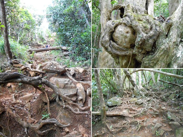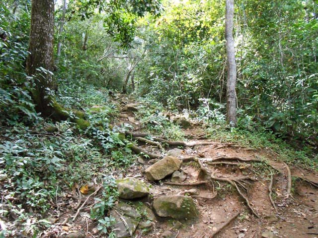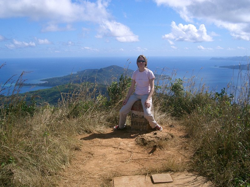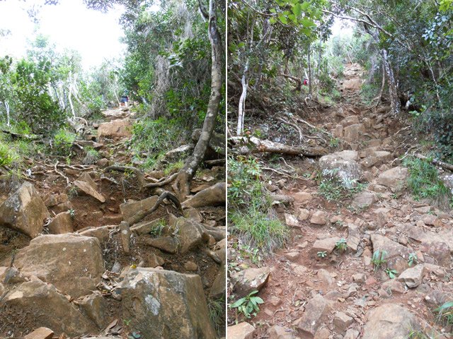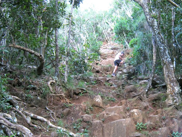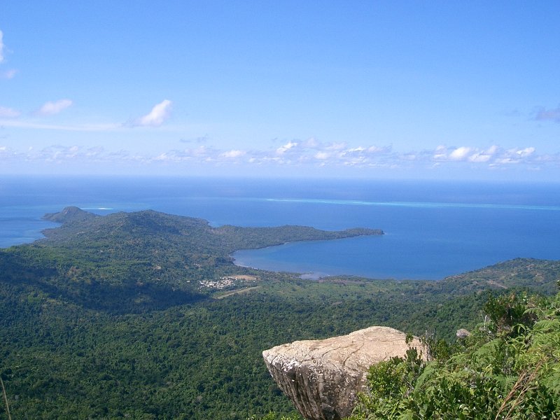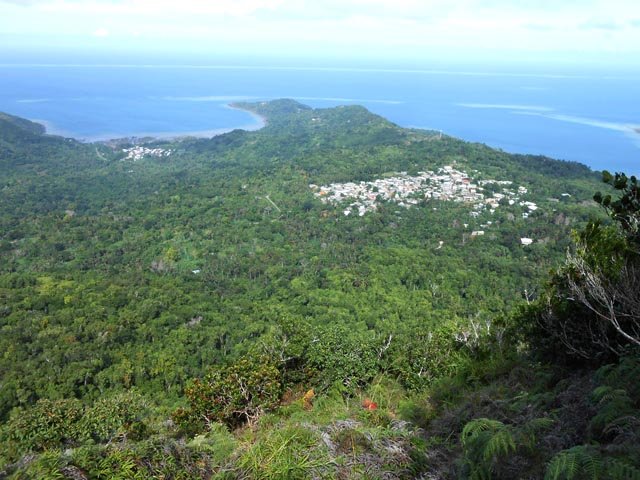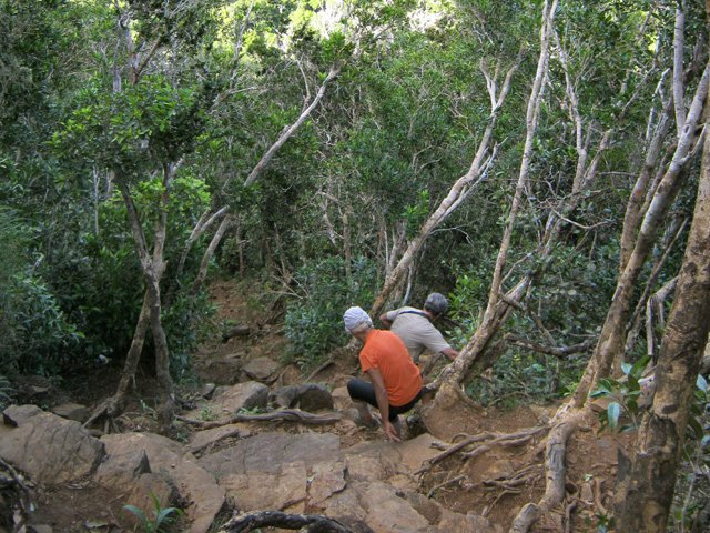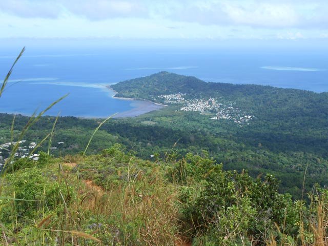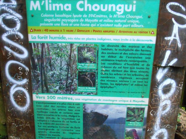 La randonnée débute au village de Choungui près d'un réservoir d'eau et d'un faré de pique-nique. Les abords, cela va de soi, sont entourés de nombreux détritus ! Depuis la route, on a sous les yeux ce piton presque pointu qui peut paraître impressionnant (Photo 1). Et effectivement, il l'est. Le sentier débute à ce faré et traverse quelques cultures et bananeraies avant d'entrer dans la forêt (Photo 2). Le sentier est de bonne qualité, parfois terreux et surtout encombré de racines (Photo 3). Il est quasiment plat à l'exception de rares passages pierreux ou de ravines (Photo 4). Le cheminement est très facile malgré parfois de nombreuses racines qui obligent à lever le pied (Photo 5). Profiter de la forêt et de quelques beaux spécimens jusqu'à l'embranchement à gauche en direction du piton (Photo 6 et 8). Lire le panneau avant de débuter la montée pour se renseigner sur la flore de cette région unique à Mayotte (Photo 9). Partir à angle droit vers le nord sur une pente faible déjà encombrée de racines et de cailloux (Photo 10). Sans grande transition, la pente devient abrupte et le restera jusqu'au sommet. Il y a toujours un tronc, une racine ou un caillou bien placé pour poser les mains ou les pieds (Photo 11). Le sol est essentiellement constitué de grosses pierres maintenues par de la terre rougie (Photo 12). La pente est si raide qu'on ne voit que les fesses de ceux qui montent (Photo 13) ou leur coiffure si on se retourne (Photo 14) ! Inutile d'attendre le lacet qui permettra de souffler sur quelques dizaines de mètres. Il faut s'habituer dès le départ à ces hautes marches dont certaines dépassent les 50 cm (Photo 15). Les temps de montée sont très variables en fonction de l'entraînement de chacun, de l'agilité, des excès de prudence ou des possibles sensations de vertige. Certains gravissent le rocher en 15 minutes alors que d'autre approchent l'heure. On se fait donc doubler à la montée à moins de doubler soi-même quelqu'un de moins entraîné. La chaleur n'aide guère durant l'effort. Lorsque la végétation diminue et que les fougères prennent le dessus, le sommet est proche. On rencontre plusieurs circuits creusés dans la terre glissante. Partir par n'importe quel sentier et utiliser les autres pour repartir. C'est un vrai bonheur d'atteindre le minuscule plateau, surtout si la météo est favorable car les paysages sont certainement les plus beaux de l'île. Plusieurs souvenirs laissés par la légion étrangère rappellent les efforts qu'il a fallu fournir pour tracer le sentier devenu depuis une autoroute à plus de 45°. Une borne symbolique est installée sur le point le plus haut (Photo 17). On domine, tel un hélicoptère, les forêts verdoyantes, les cases grises et les lagons aux splendides couleurs (Photo 19). Une carte en main est plus pratique pour se situer parmi toutes ces anses qui entourent l'île. Un rocher un peu vertigineux dépassant du flanc nord est certainement le plus photographié du département (Photo 22). A n'importe quelle période de l'année, il faut presque faire la queue pour y monter et s'y faire photographier (Photo 23). Il faut dire que c'est le belvédère idéal pour admirer l'île à condition de ne pas avoir le vertige (Photo 24). Après s'être bien gorgé de ces panoramas, la descente est certes plus facile mais peut s'avérer dangereuse si on ne prend pas bien ses repères et qu'on n'utilise pas les mains (Photo 28). Le retour en sous-bois, après cette véritable ascension et cette descente parfois scabreuse, est une plaisanterie. Il est possible, de retour au panneau, de partir à gauche vers Dapani ou Saziley. Comme la sortie est courte, profiter de la forêt pour tenter d'apercevoir des makis ou des oiseaux à moins de filer vers une des multiples plages de la région.