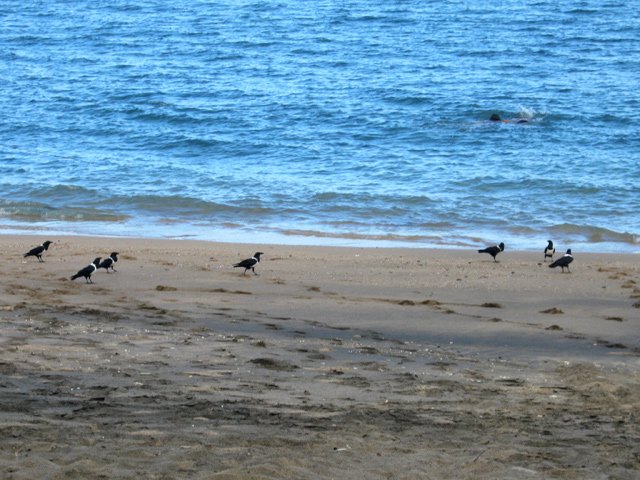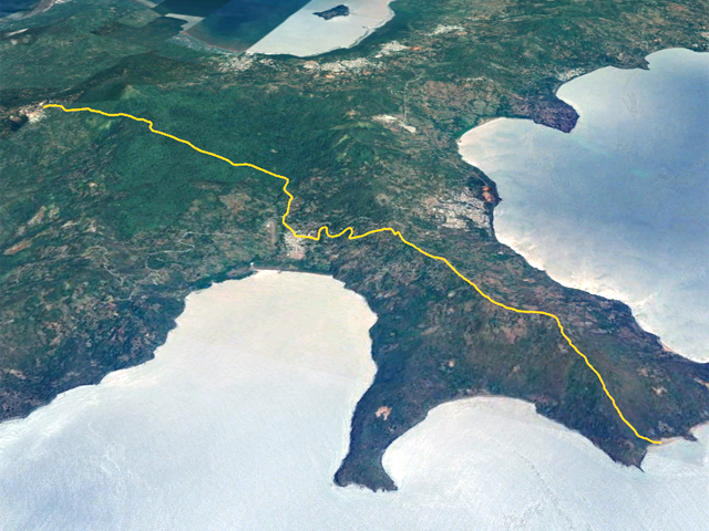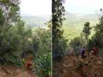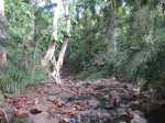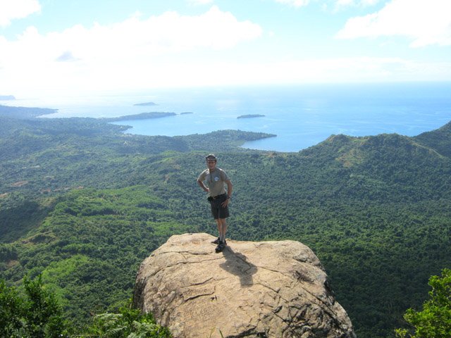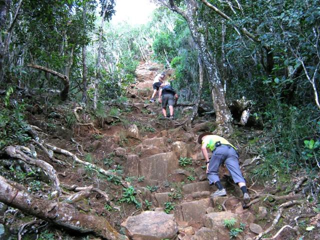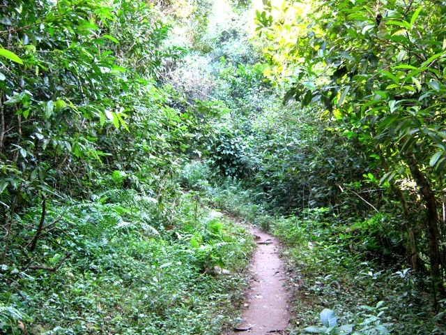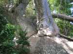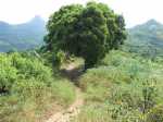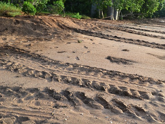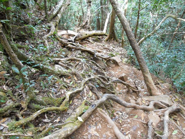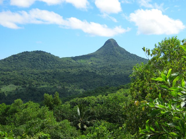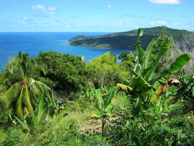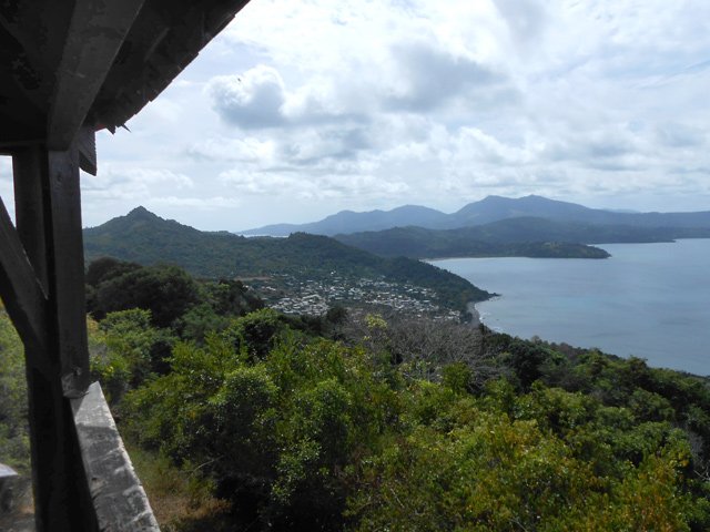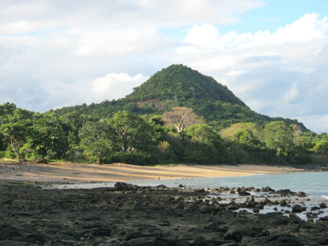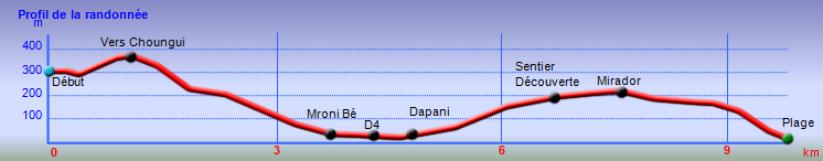 La randonnée débute au Village de Choungui, soit directement à partir du village ou depuis la réserve d'eau de la D11a. Le sentier est facile dans les bananeraies et cocoteraies avant de pénétrer réellement dans la forêt (Photo 1). Le cheminement comporte cependant quelques passages de racines ou de petites roches (Photo 3). La forêt est agréable et on parvient rapidement au croisement du sentier menant au Mont Choungui. Si on connait et qu'on veut économiser de l'énergie, poursuivre tout droit, sinon partir à gauche en direction d'une des plus belles pentes de l'île. On atteint très vite le pied du mont et l'ascension, plus que la randonnée, débute sur de gros cailloux, des racines ou de la terre glissante (Photo 4). Le sentier, tracé par les légionnaires, ne comporte aucun virage pour une pente dépassant parfois les 75 %. Il faut absolument utiliser les mains, les racines ou aspérités du sol pour passer sans difficulté les très hautes marches. Le grimpée est sévère mais paradoxalement, il y a toujours du monde en train de monter en soufflant ou de redescendre en riant ou en parlant plus fort (Photo 5). Les temps sont variables pour atteindre le sommet. Là-haut, le sentier se divise pour faire le tour du petit plateau constituant le sommet. Un rocher caractéristique semble placé au-dessus du vide (Photo 6). Il est usé par les centaines de grimpeurs qui sont fiers d'immortaliser leur passage sur ce monolithe esseulé. Du sommet, on a des panoramas à 360° à couper le souffle sur tout le sud de l'île (Photo 7). Il faut pourtant songer à redescendre car les plages de ponte sont encore loin. La descente s'effectue avec autant de difficultés qu'à la montée et il ne faut pas oublier de trouver la racine qui évitera la chute qui pourrait s'avérer douloureuse. Au croisement, partir vers la gauche et entamer les 300 m de descente jusqu'à Dapani. La forêt alterne avec des clairières couvertes de fougères aux alentours du Mont Vatounkaridi qu'on contourne par la gauche (Photo 8). Les panoramas sur la mer et la presqu'île de Saziley sont nombreux (Photo 9). A l'approche de la ravine Mroni Bé, le sentier oblique sur la droite et file plein sud vers le village. Les rares gués se passent sans difficulté (Photo 10). En fin de descente, à l'approche de la D4, les panoramas sur le Mont Choungui se multiplient (Photo 12). Le retour à la civilisation débute par quelques champs et bananeraies (Photo 13). Traverser la route et rejoindre Dapani. De ce village, on peut rejoindre la plage de Mtsanga Kolo Batsoumou par le GR qui longe la côte à de nombreux endroits, par le sentier des pêcheurs le long de la côte ou par l'arête du Mnima Saziley qui chemine à 200 mètres d'altitude et permet de beaux panoramas sur la presqu'île. On peut même longer la D4 vers Mtsamoudou et tourner à droite au col de Sazilez, près du kiosque et des pancartes donnant les directions (Photo 14). Le Gr1 remonte vers le col, parallèle à la route qu'on effleure parfois. Puis on rejoint le sentier de découverte qu'on emprunte en partant par une courte bretelle partant plein nord. Le sentier est très agréable sur la ligne de crête. On y bénéficie de nouveaux panoramas sur le Mont Choungui (Photo 15). Une pente très légère amène à un mirador d'observation qui se rejoint par un escalier. Du plancher recouvert d'une toiture on profite du point de vue à 360° sur la presqu'île vers Mtsamoudou (Photo 17) ou Rassi Maoussi (Photo 18). On devine même les baobabs entourant le village qu'on rejoindra en fin de randonnée ou le lendemain si une nuit est prévue sur la plage (Photo 19). Au loin, en pleine mer, se situe un banc de sable dépassant à peine du lagon, Mtsanga Tsoholé (Photo 22). On y distingue très souvent de nombreux touristes laissés là pour quelques heures au soleil brûlant. La descente débute et on rejoint rapidement les plages. Les quelques baobabs rencontrés lors de la descente ne sont rien comparés à ceux du littoral qui atteignent des tailles impressionnantes (Photo 23). Une fois la plage atteinte, il ne reste plus qu'à s'installer sous les baobabs, monter sa tente et attendre les tortues qui profitent de la nuit pour rejoindre le sable, grattent le sol durant une bonne heure, pondent une centaine d' œufs et repartent en laissant la trace qui trahira le lieu de ponte et guidera les braconniers vers leur butin. (Voir les photos sur cette fiche). Heureusement, les tortues sont nombreuses et des gardes veillent. Toutes les pontes ne sont donc pas perdues et on peut le même soir assister d'une part à la ponte sur une partie de la plage et à la naissance des petites tortues dans l'autre. Au petit matin, ne subsistent de cette difficile épreuve pour les tortues que des traces dans le sable (Photo 25). Les corbeaux à ventre blanc sont constamment à la recherche des œufs brisés ou des petites tortues tentant de rejoindre la mer (Photo 26). Si on ne reste pas pour la nuit, poursuivre sur les autres plages bordées de baobabs (Photo 27) et passer au plus près du Saziley Bé pour filer vers Mtsamoudou (Photo 28).