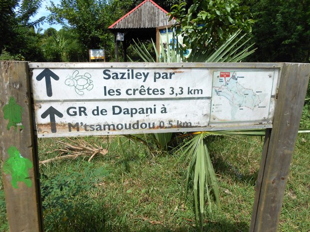 Cette très belle randonnée dans le sud de Mayotte permet une escalade exceptionnelle du Mont Choungui (en option), une traversée de très belles forêts humides ou sèches et d'assister la nuit à la ponte des tortues vertes. Elle s'effectue en deux jours : le premier mène de Choungui aux plages de Saziley et le deuxième permet de quitter les plages pour rejoindre le village de pêcheurs de Mtsamoudou ou de Bambo Est. Le Mont Choungui (594 m) est le deuxième point culminant de Mayotte après le Mont Bénara (660 m). Sa forme de cône très pointu est due à sa constitution géologique de phonolite, plus dure que les roches volcaniques ayant constitué le volcan et qui se sont érodées beaucoup plus vite que le cœur qui restera en place encore longtemps. La Réserve Forestière des Crêtes du Sud est constituée de magnifiques forêts où l'on rencontre des espèces atteignant facilement les 30 mètres de haut. Le climat chaud et humide et surtout l'absence de cyclones explique la taille de certains de ces grands arbres. La presqu'île de Saziley (Sazilé) est un site naturel protégé contourné par le GR1 du tour de Mayotte. Ses plages sont renommées pour être très fréquentées par les tortues vertes qui viennent y déposer leurs œufs au cœur de la nuit.