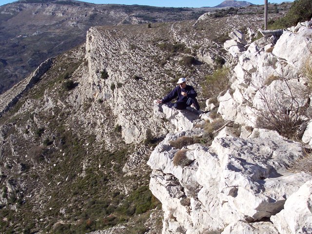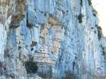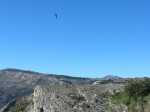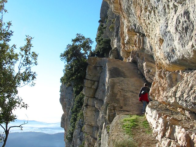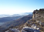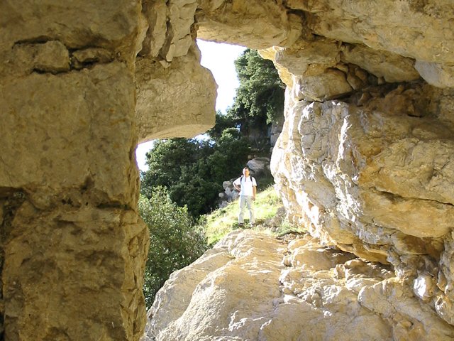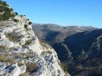 C'est une randonnée moyenne en difficulté mais forte en sensations qui débute sur un parking facile à trouver en quittant Gourdon par la D12 en direction du nord. Le sentier, au sol très calcaire, file vers l'est sur une pente légère. Puis, au point 909, il attaque une série de lacets pour une ascension de plus de 100 mètres jusqu'au bord du rempart. Une fois arrivé au plateau, on a une vue d'ensemble sur les sommets environnants et le regard porte par endroits vers les Alpes enneigées (Photo 1). La végétation, très pauvre, comporte beaucoup de pierraille calcaire d'où émergent quelques pins penchés à cause des vents fréquents à cette altitude (Photo 2). En se retournant, on aperçoit la D12 et une partie du sentier qu'on vient d'emprunter (Photo 4). Le village de Gourdon paraît minuscule, perché sur son petit éperon calcaire (Photo 5). Le bord du rempart est constitué de falaises parfois abruptes et fragiles (Photo 6). Deux aires de décollage de parapentes se trouvent dans les environs : une aperçue en montant, l'autre plus à droite, vers l'Aven de Cavillore qu'on rencontrera au retour. Les adeptes de ce vol libre sont souvent nombreux au-dessus des montagnes (Photo 7). Les vents ascendants en bord de falaise leur permettent de grimper assez vite au-dessus du plateau (Photo 8). Il est agréable, pour les points de vue, d'escalader les roches qui dominent le vide mais attention à la chute (Photo 9). Suivre l'ancienne voie romaine, rectiligne, qui mène au nord jusqu'au bois 1200 m plus loin. Partir à droite et traverser alors le plateau en longeant le bois pour arriver à nouveau au rempart qui domine la vallée du Loup (Photo 11). On domine quelques hameaux aperçus en roulant vers le parking (Photo 12) ou les lacets de la Rd3 qui dominent le canyon du Loup (Photo 13). De là, part le sentier qui mène à la Forteresse. Ce passage est tout d'abord facile en longeant une corniche naturelle de la falaise (Photo 14). Les chutes de pierres ou rochers sont rares mais l'endroit peut être dangereux par moments (Photo 15). Les gens sujets au vertige s'abstiendront de cet écart car le vide dépasse les 250 m et le sentier devient de plus en plus étroit et sans doute très glissant par temps de pluie (Photo 16). Une fois dans la place et en imaginant les échelles ou passerelles enlevées, on a du mal à savoir comment un envahisseur aurait pu prendre le lieu sans arme lourde (Photo 17). Les derniers 10 mètres sont particulièrement délicats et il est formellement déconseillé de s'y rendre avec des enfants jeunes et turbulents (Photo 18). Une fois la porte en pierre de taille franchie, on peut se promener à l'arrière sous les arbres à l'ombre de la grande muraille (Photo 19). La forteresse troglodytique est plus impressionnante par son accès que par ses rares vestiges. La falaise est tellement verticale qu'on se rend bien compte que le sentier qu'on vient d'emprunter est le seul passage possible (Photo 20). L'arrière comporte quelques cavités où pouvaient s'abriter les soldats et des passages assez larges pour moins craindre le vide (Photo 21). Une fois cette visite historique terminée, reprendre le chemin inverse en prenant les mêmes précautions pour franchir l'étroit passage. Poursuivre en longeant le rempart jusqu'au Trou du Mouton, une grotte fermée par des branches et laissée aux spéléologues. Suivre le petit sentier ou marcher dans la garrigue et sur les plaques de calcaire pour se rapprocher de l'Aven du Col de Cavillore. Là également, il vaut mieux venir avec des professionnels pour en effectuer la visite souterraine. Partir plein ouest à moins de prendre le sentier qui descend à partir du col. On retrouve le sentier pris pour monter et le parking se rejoint rapidement par le sentier en descente.