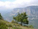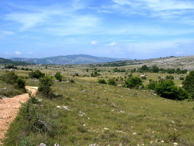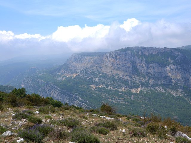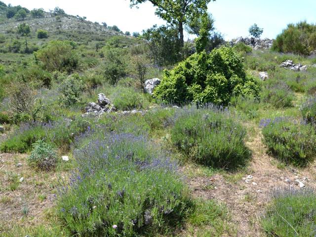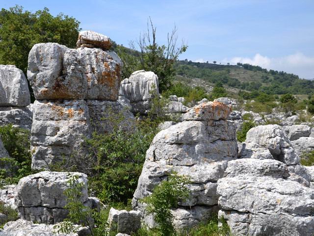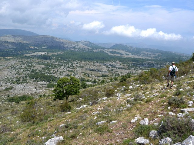 La randonnée débute par une piste facile qui grimpe peu ou pas du tout jusqu'à la Clapière Rousse. Le sol est assez caillouteux mais la marche est cependant facile (Photo 1). Les terres, souvent abandonnées sont recouvertes d'anciens pâturages dont on devine encore les murettes d'enceinte (Photo 2). Hormis quelques arbres poussant essentiellement dans les fonds de talwegs où ils recherchent l'humidité, la végétation est rase ou inexistante. On rencontre les premières grosses pierres avant la montée et il faut bien prendre son temps afin de se promener dans ce "Village Nègre" à la recherche de la plus belle sculpture naturelle sur ces monolithes calcaires (Photo 3). Certaines sont situées dans des prairies, d'autres dans des sous-bois. Leur ascension est aisée pour dominer cette architecture minérale naturelle originale (Photo 4). Plusieurs sentiers sont visibles ainsi que de nombreuses traces laissées par les troupeaux, on peut donc marcher n'importe où sans risque à travers les courtes garrigues et les touffes de lavande (Photo 5). La montée en zigzags est facile en évitant de marcher sur les plantes. Quelques grosses roches blanches dépassent de la verdure ainsi que des arbustes qui ne craignent pas la chaleur d'été ou les vents froids de l'hiver. On en prend autant dans les yeux que dans les narines avec les effluves de lavande et de thym. On rejoint le bord inférieur du Puy de Tourrette et on profite des premiers panoramas sur Courmes, les Barres de Cavillore (Photo 6) et les Gorges du Loup où on essaye de deviner le Canal du Foulon dans la falaise en rive droite (Photo 7). On ne quitte plus ces superbes vues durant toute la montée au sommet en effectuant parfois de petits détours pour visiter de belles bergeries. Le sommet du Puy est matérialisé par un cairn difficile à repérer dans la végétation. On n'est à 1268 mètres seulement mais on domine toute la région, essentiellement calcaire. De là, on regarde vers le Nord-est et on peut même voir le véhicule en direction de Saint-Barnabé. On remarque également une partie verdoyante proche des lignes électriques. C'est cette zone plus verte qu'on prend en point de mire pour descendre encore en hors-sentier vers le début de la piste qui ramène à la D302. On retrouve le terrain un peu plus accidenté que pour la montée dans les garrigues, les rochers et quelques broussailles qu'il faut contourner (Photo 9). Effectuer quelques haltes pour profiter des oiseaux qui s'envolent au passage, des fleurs de toutes les couleurs et même des insectes (Photo 10). La ligne haute tension marque la fin de la descente. Le terrain s'aplanit et on s'approche de cette bergerie très bien restaurée qui respire le calme et la sérénité à 970 m d'altitude (Photo 11). Ces oasis de verdure s'expliquent bien en regardant la carte de plus près ; on y remarque une grosse douzaine de ruisseaux qui se terminent au cœur d'une doline. Ces ruisseaux à sec une bonne partie de l'année, fournissent l'humidité nécessaire à la bonne pousse des végétaux, d'où les grands arbres bordant les bâtiments. Récupérer la piste et rejoindre la route. Pour éviter de marcher sur le goudron, prendre à gauche un peu avant et rejoindre le parking en utilisant les petits sentiers ou en poursuivant en hors sentier dans cette zone un peu plus boisée que le reste de la boucle.