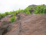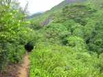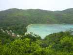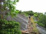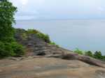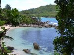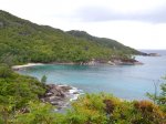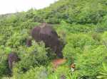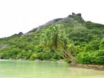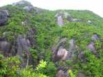 La randonnée sportive commence à la fin de la plage où un petit sentier, peu employé, demandera pas mal d'efforts pour le suivre tout comme pour le trouver à travers la végétation. Longer la mer pour atteindre l'autre extrémité de la plage et attaquer ce sentier. Les collines granitiques de bord de mer, recouvertes d'une végétation souffrant du manque de terre, finissent à l'océan (Photo 17). Suivre cet itinéraire, le plus souvent caché par la végétation. On peut aisément s'égarer si on ne prend pas garde à repérer les traces de peinture ou les chiffons discrets accrochés aux branches. Des parties rocheuses glissantes doivent même se franchir à quatre pattes. C'est un peu l'aventure qu'il ne faut surtout pas tenter de réaliser seul (Photo 18). C'est après plusieurs dents de scie assez fatigantes qu'on parvient au point de vue sur l'Anse Ternay ou se trouve l'horrible vestige de ce qui aurait pu être un hôtel ou des logements qui ont été pillés de tout leur contenu, ne laissant en place que les carcasses de béton (Photo 19). La baie se rejoint assez facilement malgré le passage dans de nouvelles zones rocheuses (Photo 20). Heureusement, la plage toute proche est très belle et fait oublier les alentours (Photo 21). C'est beaucoup plus beau si la météo est ensoleillée mais on ne peut garantir le soleil chaque jour sous ces latitudes. Après une baignade ou une séance de photos on peut quitter le lieu, passer devant le gardien qui occupe ses journées sur une chaise à surveiller des ruines et bavarde facilement avec les passants. Le sentier est terminé et oublié et c'est sur une route tranquille en bord de mer ou dans la mangrove qu'on retrouve la civilisation. Les portions boueuses de la mangrove abritent une faune variée constituée essentiellement de crabes de toutes les couleurs (Photo 22). Plus loin, la route longe la côte au plus près (Photo 23). Les petites plages se multiplient tout comme le nombre de baigneurs (Photo 24). On arrive assez rapidement à Port Launay puis à de grands hôtels. On rejoint l'église proche de Port Glaud, en face de la minuscule Islette située à quelques brasses de la côte. Prendre alors vers la gauche avant l'église et suivre sur environ 500 m la petite route puis le sentier qui débouche sur une belle cascade très fréquentée pour la baignade (Photo 27). Le cadre est enchanteur au milieu des rochers et des palmiers ou de la végétation luxuriante qui fait oublier les efforts de la traversée récente (Photo 28). La randonnée peut prendre fin à l'arrêt de bus près de l'église ou se prolonger vers le Mont d'Or par un des nombreux sentiers revenant à Bel Ombre. Dans ce cas, il faudra partir tôt et par beau temps car la distance est augmentée et la pente assez forte parfois jusqu'à 600 m, surtout avec les chaleurs de ces contrées humides.