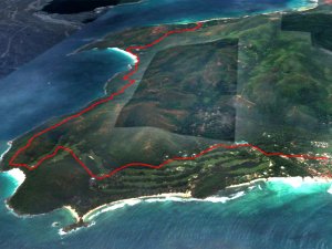Contrairement aux images ci-dessous, il vaut mieux effectuer cette randonnée par très beau temps, au moins pour rapporter des clichés où l'eau est turquoise plutôt que grise à cause de la pluie ou du manque de luminosité. Depuis la construction du golf et de l'Hôtel Lémuria il est de plus en plus difficile d'accéder à l'Anse Georgette à moins de passer par la plage et les rochers. En demandant gentiment et avec un peu de patience on peut franchir le portail de l'hôtel aussi bien gardé que Guantanamo, du moins sur cette face ! Après avoir traversé trois zones de golf on peut se baigner une première fois à l'Anse Georgette avant d'attaquer un sentier dans la brousse qui amènera après quelques péripéties à l'Anse Lazio. La chaleur est toujours là et l'eau est indispensable dans le sac. Plusieurs sentiers mènent à l'Anse Lazio dont un qui traverse un minuscule espace habité d'originaux individus qui ne manqueront pas d'inviter les passants à goûter leur alcool local issu des fleurs de palmiers et certainement fumer un peu d'herbe après avoir mieux fait connaissance. On peut admirer, plusieurs fois au cours de la traversée, de beaux panoramas sur l'océan ainsi que des roussettes ou frégates en vol. Afin d'éviter le barrage du début, l'idéal est d'effectuer le trajet à l'envers en partant de l'Anse Boudin car le sentier se termine au ras du golf. Une fois le périple terminé devant le portail, il sera beaucoup plus facile de sortir comme les clients de l'hôtel plutôt que de quémander un passage.