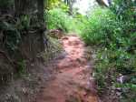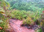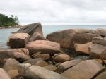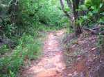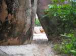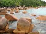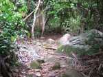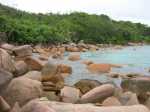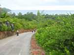 La randonnée débute à l'Hôtel Lémuria après avoir demandé l'autorisation de passer (Photo 1). On longe tout d'abord le golf jusqu'à l'étang totalement recouvert de laitues d'eau qui empêcheront de retrouver les balles qui y atterriront (Photo 2). Bifurquer à droite pour longer le green en restant sur la petite route (Photo 3). On rejoint plus loin une autre partie du terrain et on marche en direction de la Plage de l'Anse Georgette (Photo 5). Après une baignade ou une séance de photos on revient sur le terrain de golf pour retrouver le troisième green. Ralentir le pas pour être certain de repérer le très discret sentier bouché par la végétation qui débute à gauche en longeant la petite route suivie par les caddies. Quelques mètres plus loin le sentier devient normal, comme si les jardiniers faisaient tout pour rendre discret le départ de ce sentier (Photo 7). Par temps de pluie, les portions terreuses peuvent être très glissantes et surtout salissantes (Photo 8). La végétation ne bouche jamais le passage même si elle est touffue dans certaines zones (Photo 10). On retrouve comme partout des endroits où les roches dépassent du sol (Photo 11) ou d'autres dans les plantes de bord de mer lorsqu'on se rapproche de la côte (Photo 12). Plusieurs croisements ne posent guère de questionnement puis le sentier principal est mieux marqué. Au plus gros croisement, on peut prendre à gauche pour passer chez des marginaux accueillants ou tout droit pour grimper la colline. Le sentier de gauche est très touffu, celui de droite est mieux dégagé. Tous les deux finissent par se rencontrer pour retrouver plus loin l'Anse Lazio et ses gros rochers qu'on a déjà rencontrés en sous-bois (Photo 14). On arrive à Lazio près d'une minuscule plage utilisée par les pêcheurs pour laisser leur barque (Photo 16). Toute la côte est jonchée de ces blocs si classiques des Seychelles (Photo 17 et Photo 18). On aperçoit la grande plage et les baigneurs derrière les derniers blocs (Photo 19). Le sentier passe sous de gros blocs qui créent une porte originale (Photo 20). Frôler l'estuaire d'une petite rivière qui a créé un étang d'eau calme (Photo 24) puis suivre la longue plage très fréquentée par beau temps (Photo 25). On se retrouve ensuite sur une piste de terre puis sur une étroite route bétonnée en très forte pente pour rejoindre l'Anse Boudin (Photo 26). Si aucun bus n'est en vue il est agréable de poursuivre sur la route pour voir l'anse suivante ou simplement profiter de la longe plage de l'Anse Boudin avec vue sur l'île Curieuse juste en face.
