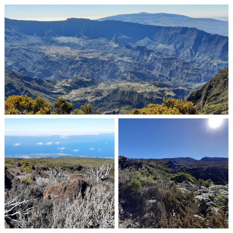 Cette montée au Grand Bénare varie des autres propositions du site qui peuvent débuter à la Fenêtre des Makes ou s'effectuer lors de la boucle de la Glacière. Elle permet de monter de plus de 1200 m sur une pente régulière qui demande peu d'efforts véritables mais impose hélas de marcher longuement sur des portions caillouteuses assez fatigantes pour les articulations. Il est conseillé de partir par le Sentier du Gol et de revenir par le Sentier Mario pour varier un peu les paysages (ou inversement). On peut aussi, comme sur cette fiche, emprunter la piste qui repose les jambes et permet de poursuivre la découverte des landes et brandes du Haut Tévelave. A partir du Petit Bénare, les panoramas sont grandioses sur le Cirque de Cilaos. Même en partant tôt, les nuages sont souvent présents et peuvent boucher les points de vue.