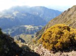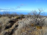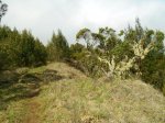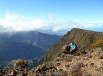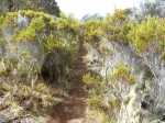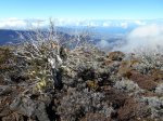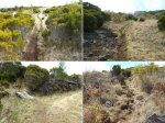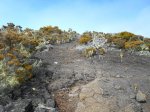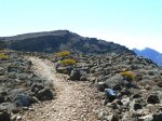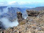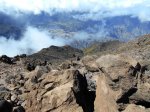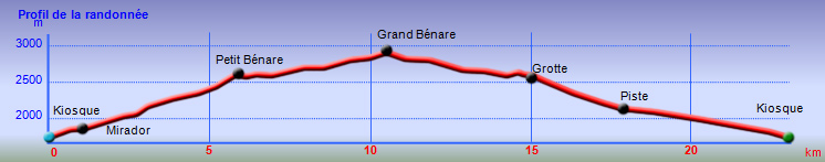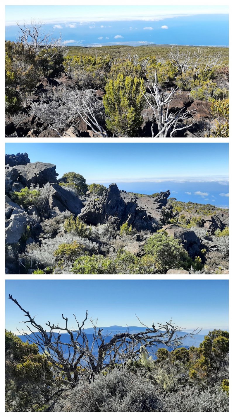 La randonnée débute à une grande aire de pique-nique comportant kiosques et tables réparties sous les tamarins. Le sentier monte agréablement entre les tamarins des Hauts, fougères, vignes marronnes en empruntant des parties herbeuses (Photo 1) ou terreuses un peu glissantes au petit matin. On coupe plusieurs fois la route forestière par des raccourcis très faciles à trouver si on prend la peine de monter par la piste lorsque le sentier n'est pas immédiatement visible. Plus haut, c'est le Sentier des Tamarins qui est indiqué et permet de rejoindre le mirador instable (Photo 2). La piste est très facile à repérer à partir de ce poste de gué qui ne sert plus depuis longtemps. Constituée de longs lacets qui s'évitent par des raccourcis de très bonne qualité, on remonte assez vite en direction du départ du sentier du Petit Bénare. Les sentiers de raccourcis sont étroits mais très fréquentés, d'où leur très bonne qualité (Photo 5). La dernière portion passe près d'une ravine et des petites barres rocheuses qui le rendent un peu plus difficile, plus caillouteux et plus pentu mais constituent un excellent échauffement. La piste s'élargit à l'approche de la ravine de Bellevue et des pancartes annoncent la direction du Petit Bénare à 2,8 km. Une barrière peut fermer cette piste qui descend vers la Makes. L'ascension se poursuit donc vers la gauche par un sentier caillouteux bordé de fougères, fleurs jaunes mais surtout des premiers cadavres de tamarins morts sous les incendies (Photo 8). Les bords découpés et rocheux de la Ravine Bellevue donnent l'occasion de beaux clichés sur le fond de la ravine. On poursuit, toujours sur les cailloux mais sur une pente assez faible. Les fougères semblent avoir péri sur place ; la fin de l'hiver verra reverdir les prochaines qui surgiront du sol (Photo 10). Les herbes sont très présentes et on remarque déjà la raréfaction de la végétation qui va diminuer proportionnellement à l'altitude (Photo 11). A mi-parcours, la pente devient plus raide et le sentier fait quelques lacets pierreux avec de très hautes marches parfois. D'autres parties s'effectuent sur des anciennes plaques de lave inculte (Photo 12). On aperçoit plus haut un gros rocher avec des inscriptions blanches donnant des directions. On parvient ainsi au croisement du sentier du Piton Rouge et il faut prendre à droite, passer devant une grotte et parvenir à la pancarte indiquant le Petit Bénare. Sans cette pancarte, peu de gens pourraient affirmer avec certitude se trouver au sommet de ce piton quasiment plat (Photo 14). On se régale des panoramas sur le cirque si les nuages ne sont pas trop installés (Photo 13). La remontée se poursuit en franchissant quelques zones très rocheuses comportant de hautes marches. Le sentier passe désormais à quelques mètres du rempart (Photo 15) et rejoindre le bord pour profiter de nouveaux panoramas ne prend que quelques secondes. On descend quelques fois pour passer des ravines, on marche à plat sur des parties sableuses ou de longues plaques de lave remplies de cailloux qui dépassent mais la plupart du trajet s'effectue en montée légère et sans trop de difficultés. On remarque avec plaisir la renaissance de quelques tamarins et les branles verts se couvrent de barbe de Jupiter (Photo 16). Mais dans l'ensemble, la planèze est presque vierge (Photo 17). Les amateurs de natures morte ne seront pas déçus par quelques roches dépassant de la végétation, surtout si elle est fleurie (Photo 18). Comme souvent, les nuages apparaissent avant la fin de la matinée et invitent souvent à presser le pas (Photo 19). Il faut donc profiter de ce court répit pour se gaver de paysages sur le Cirque de Cilaos (Photo 20). A l'approche du Grand Bénare, c'est le désert pierreux qui borde le sentier (Photo 21). Attention de ne pas trop s'approcher du bord pour éviter une chute qui pourrait se terminer 500 m plus bas (Photo 23). Certaines nouvelles portions plates et sableuses avec magnifiques points de vue sur la Piton des Neiges permettent de se reposer (Photo 24). La pente reste faible mais les cailloux demeurent, la végétation disparaît presque totalement par moments. Les bords déchiquetés offrent de nouveau des natures mortes dangereuses si on tente de trop s'en approcher (Photo 25). On parvient, par une dernière montée chaotique au sommet de la région (Photo 26). Du Grand Bénare, on a de belles vues supplémentaires sur le Cirque de Mafate. La Crête des Salazes sépare les deux cirques. Sur la droite, on devine encore la ville de Cilaos entre les nuages (Photo 27). Le vent, très présent à cette altitude, peut être frais toute l'année et principalement en période hivernale ; ne pas oublier les vêtements, surtout en cas de halte casse-croûte. Après avoir contemplé les alentours, reprendre le chemin en sens inverse mais ne pas trop accélérer le pas car les cailloux s'avèrent plus dangereux que dans la montée. A la Piste forestière du Haut Tévelave, choisir de reprendre le sentier de raccourci ou la piste elle-même (Photo 28). On peut également, à partir de la tour de gué, choisir de filer vers le Gol mais à cette heure, les nuages cachent certainement le point de vue sur les Makes.