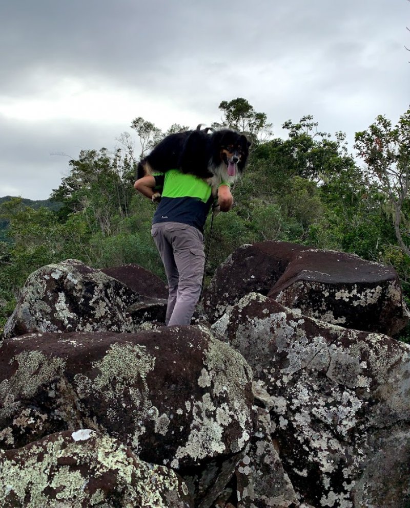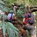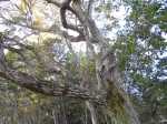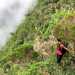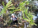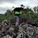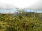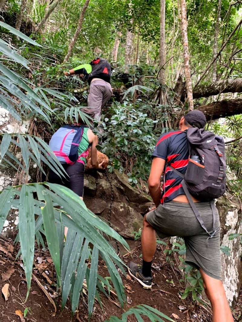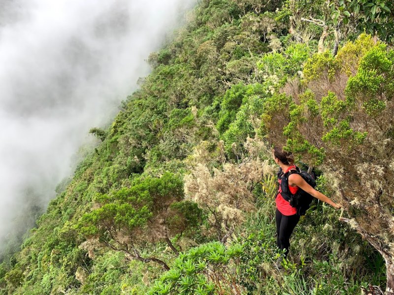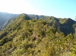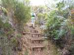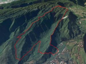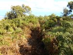 Nous voici aujourd'hui sur le circuit de Dominique qui s'entraîne ici régulièrement pour le plaisir des yeux et garder la forme extraordinaire qui l'anime. De la forme, il en faut pour cette première montée qui rejoint, 900 mètres plus haut le Sentier des Lataniers et débute par une grimpée d'anthologie de 200 mètres à travers d'anciens vergers privés (voir début du profil). A force de passages sur ce trajet de braconniers ou cueilleurs de toutes sortes et après quelques coups de machettes dans les fougères qui couvrent le sommet, Dominique nous donne ainsi la possibilité de varier nos itinéraires et de profiter des magnifiques panoramas sur l'océan depuis la crête. La boucle est d'une longueur raisonnable mais ne s'adresse pourtant pas à tous les randonneurs. Le fort dénivelé impose un entraînement correct et des passages de roches lisses constituant le sommet de la crête peuvent incommoder les personnes sujettes au vertige. Certaines portions du Sentier Joncourt, qu'on emprunte en descente, sont difficiles à suivre tant le sentier est discret mais heureusement, des rubalises et tâches de peinture, régulièrement espacées, empêchent de s'égarer.