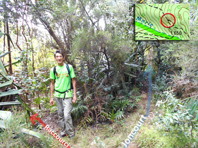 La randonnée débute sur une ancienne piste qui longe le minuscule terrain de sport de l'Îlet Lautret. Les plantes envahissent doucement ce parcours presque à plat (Photo 1a). On rejoint sans effort la Ravine à Marquet qu'on traverse sur les roches avant de poursuivre vers la crête. La montée est immédiate et peu instinctive. Il faut chercher les quelques coups de sabres donnés sur les écorces ou les marques de peinture pour monter sans hésitation. Le sol est très rocheux, la pente est de plus en plus forte, les feuilles tombées au sol sont glissantes. Il faut souvent s'aider des arbustes ou racines pour faciliter la montée (Photo 1). On passe près de fruitiers et de deux cases dont une en très bon état. Des pancartes précisent que le tout est privé et on se garde bien de sortir du sentier pour cueillir ou visiter les lieux. Il faut ainsi près de 30 minutes pour dénicher le parcours, grimper la forte pente et parvenir au sommet pour profiter des premiers points de vue sur la région (Photo 2). Les fougères sont hautes mais on voit très bien la grande ville du Port et les longues crêtes qui montent vers Dos d'Ane. La partie couverte de fougères est courte (Photo 3) et on parvient vite à une crête propre, couverte de plus en plus de rochers qui grossissent ou se multiplient avec l'altitude. Beaucoup de grands nattes, bois de perroquets et bois d'olive occupent le sommet. De nouveaux points de vue permettent de voir l'Îlet Solitude et le Chemin Ratinaud d'un côté, la vallée de la Ravine la Mare de l'autre (Photo 4). Le regard porte jusqu'à Pichette et la Plaine de l'autre côté de la Rivière des Galets. Devant soi, la crête monte doucement en direction de Dos d'Ane (Photo 5). Les orchidées apparaissent de tout côté. Elles sont très grandes et poussent sur d'interminables racines qui donnent à penser qu'elles sont là depuis de nombreuses années (Photo 6). Il faut parfois les enjamber pour ne pas les piétiner. Il serait totalement scandaleux d'en prélever surtout qu'elles n'ont aucune chance de repousser à la maison. Les rochers couvrent en partie le haut de la crête mais la passage reste visible ou instinctif (Photo 7 et 8). Parfois, les rochers diminuent et sont remplacés par des arbres qui parviennent à trouver suffisamment d'eau pour vivre (Photo 9). Certains atteignent même des tailles respectables pour l'endroit (Photo 10). On trouve également des fougères qui bouchent le sentier en quelques mois si les passages diminuent (Photo 12). Quelques passages techniques demandent un maximum d'attention car le vide est tout près (Photo 13). Un petit rocher permet un superbe point de vue sur les deux cascades de la Ravine la Mare, hélas souvent à sec (Photo 14). La montée se poursuit par une série de dents de scie, toujours dans la même végétation, les mêmes rochers et orchidées dont on dénombre vite une demi-douzaine d'espèces (Photo 16). Un superbe grand affouche sur la ligne domaniale a poussé sur les rochers mais est assez difficile à photographier (Photo 17). La montée se poursuit mais la végétation change rapidement. Les fougères aigle de 4 mètres de hauteur peuvent boucher le sentier en une saison et les sabres se multiplient avec l'altitude. On rencontre les premiers pièges à rats qui ont été installés par l'ONF pour lutter contre ce rongeur dont la population est presque le quintuple de celle des humains de la Réunion. Ne pas toucher les pièges (Photo 18) et moins encore les appâts ou plastiques les ayant contenus. Le sentier devient de plus en plus étroit et touffu avant de parvenir à un premier point de vue sur Dos d'Ane (Photo 19). Depuis le point de vue, le trajet jusqu'au Sentier des Lataniers est court et assez facile. Ce dernier serpente en longeant la ligne de crête durant plus de 1500 mètres dans les jouvences (Photo 20). Les rares pentes sont courtes et aménagées en quelques marches avant de trouver le départ du sentier Joncourt (Photo 21). Ce dernier, assez long et difficile en montée, devient presque agréable durant la descente. Il traverse successivement quatre types de végétation. Ce sont d'abord les fougères, aussi hautes que celles côtoyées durant la montée où le sentier est parfois très difficile à suivre (Photo 22). Heureusement, les passages de randonneurs ont créé un chemin de fougères qu'il faut régulièrement raccourcir pour faciliter le passage. Depuis les dernières fougères, le regard porte jusqu'au Port et on distingue très bien la crête qu'on vient de monter (Photo 23). Les panoramas disparaîtront plus bas dans la forêt touffue. Puis ce sont les sous-bois sombres de bois de perroquets où il faut constamment chercher le sentier des yeux mais les balises ou taches de peinture aident grandement (Photo 24). On arrive à un arbre brûlé et on bifurque sur la droite pour traverser longuement des goyaviers. Ce sont enfin les jamrosats, tous aussi beaux et tortueux les uns que les autres (Photo 25). Le sentier Joncourt se termine par une ancienne piste recouverte en partie de végétation. Lorsqu'elle se termine brusquement, se préparer à bifurquer sur la gauche (Voir § ci-dessous) et emprunter les vestiges d'une autre piste jusqu'au fond rocheux de la Ravine de la Mare (Photo 27). Le sentier, difficile à suivre peut inquiéter les moins habitués de ce genre de parcours. Un conseil : tenter de le suivre sans jamais s'en éloigner de plus de 30 mètres et toujours en rive droite sur les racines (Photo 28). En respectant cette consigne, on se retrouve, 15 minutes plus tard, sur la boucle de la Kalla à un endroit presque impossible à remarquer quand on effectue cette boucle classique des environs de la Possession. Longer ce parcours qui effectue un long détour pour franchir la Ravine la Mare et remonter en direction de la grotte. La montée est très forte dans les rochers empilés mais heureusement de courte durée. Au col, profiter des panoramas sur la Mare,