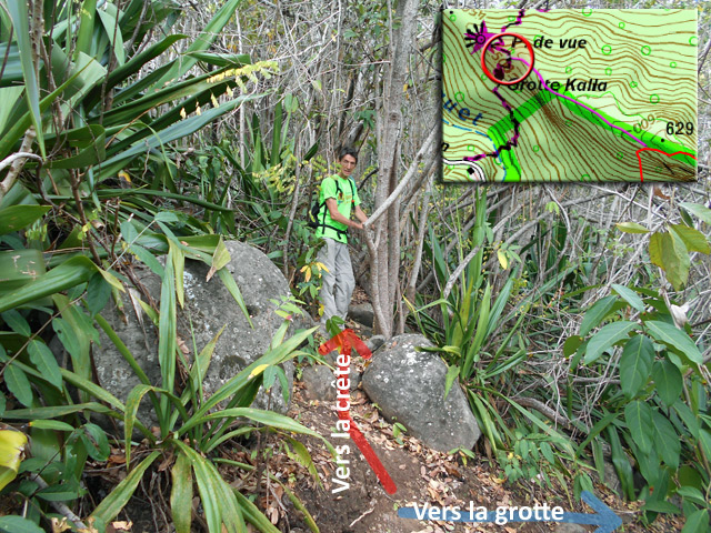 Depuis le sentier de la Kalla, quelques mètres après le col et avant de redescendre vers la grotte, repérer ce sentier discret qui débute entre deux roches et quelques arbustes. Difficile à discerner car la région est totalement couverte de chocas, de faux poivriers et roches. La distance entre le col et la grotte est tellement minime que le doute est peu permis; il suffit d'ouvrir l'oeil.