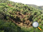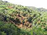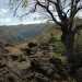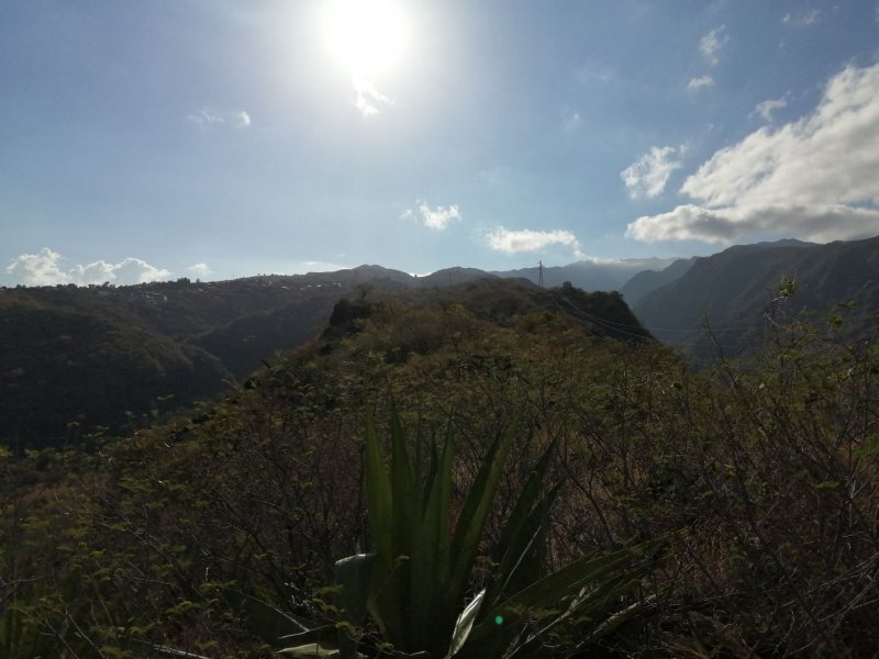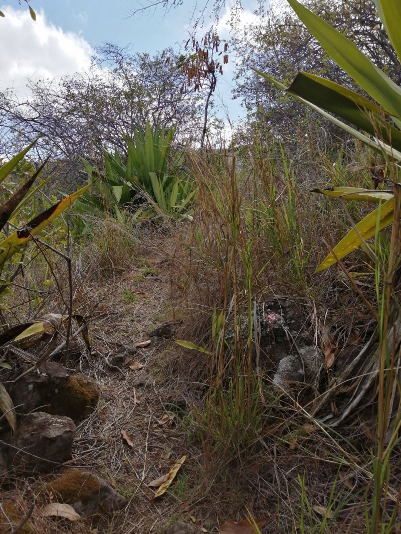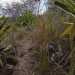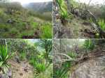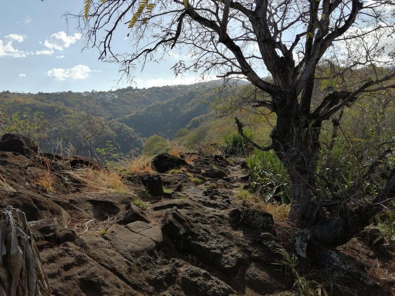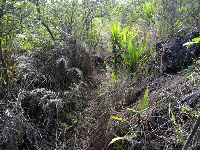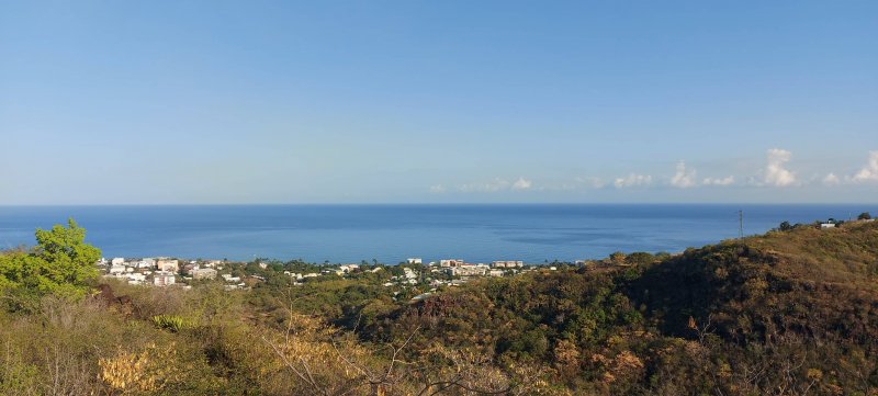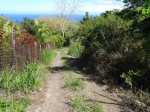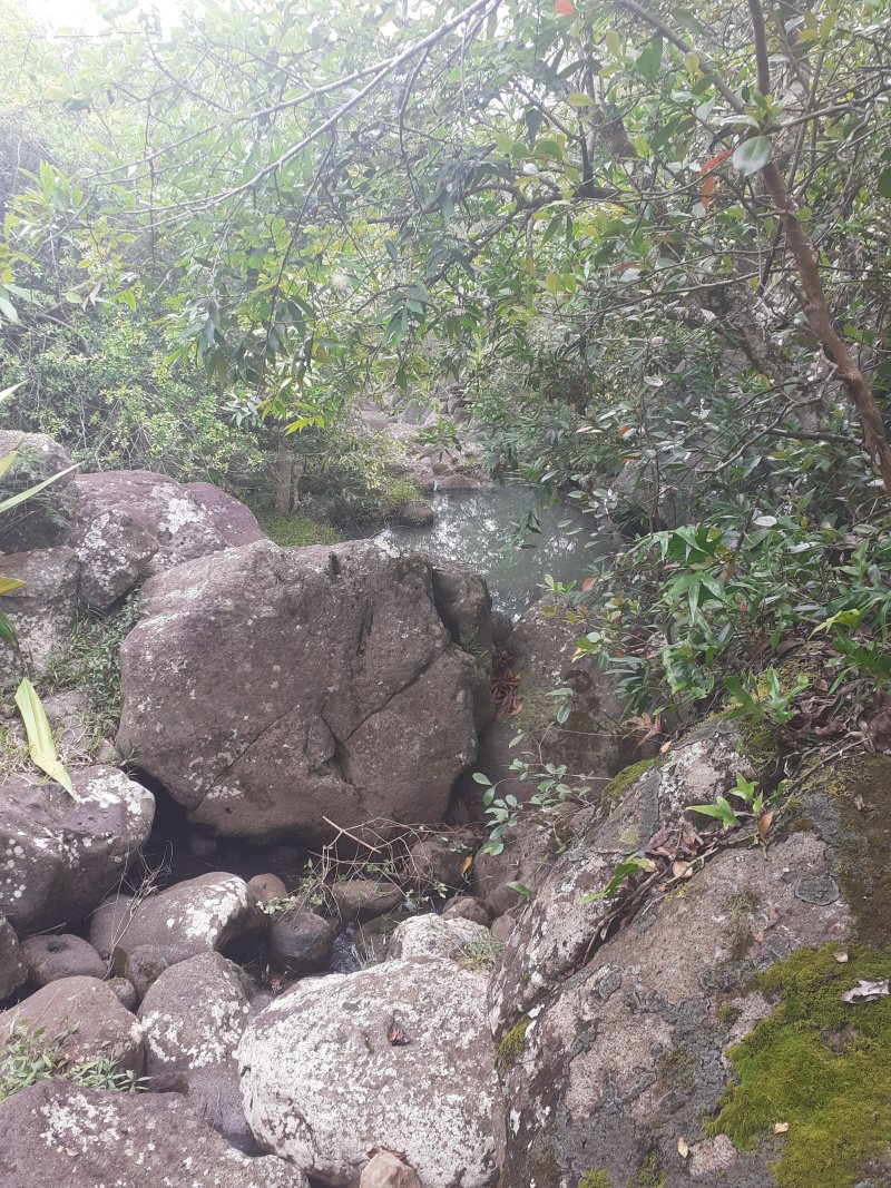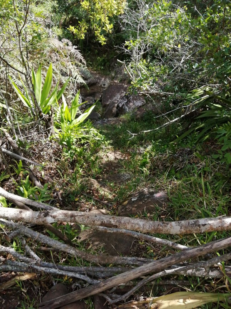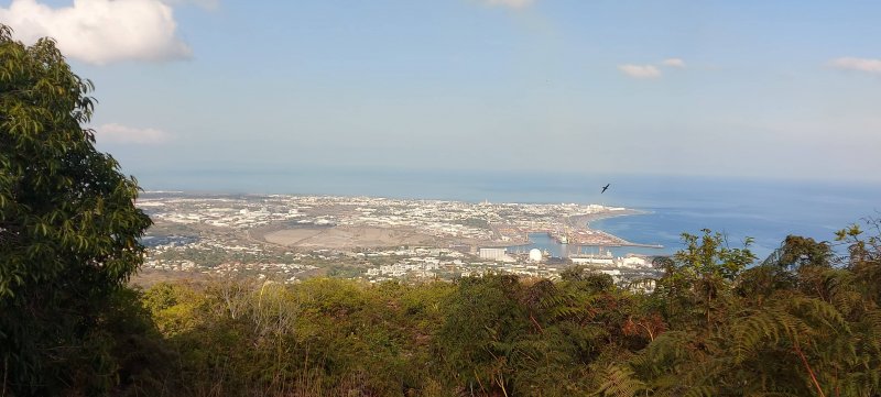 La randonnée débute à ce verger lontan appelé Rostonne et affiché un peu partout Rosthon (Photo 1). Cheminement à plat le long de la ravine, traversée de celle-ci, arrivée dans le verger ombragé sont déjà décrits dans la Randonnée familiale ou dans la Boucle un peu plus longue. Suivre la belle allée qui débute au panneau facile à trouver près du pont de la Grande Ravine des Lataniers à la fin de la Rue Evariste de Parny. Traverser à ravine au fond caillouteux et rejoindre les premiers manguiers qui envahissent le parc Rosthon (Photo 2). Prendre à droite et traverser le verger pour longer la Petite Ravine des Lataniers sur une piste herbeuse et agréable. Laisser à droite celle menant aux Lataniers (panneau) car elle a été défoncée après la construction de logements. Poursuivre jusqu'à la première piste à droite menant aux carrières. Traverser la totalité de l'ancien chantier (Photo 3), ne pas prendre la crête au pylône électrique mais bifurquer à gauche, suivre le bord du rempart artificiel et redescendre vers la Petite Ravine des Lataniers. Ne pas franchir le gué mais tourner à droite à un arbre aux branches écartées semblant donner la direction. Une forte pente très caillouteuse débute rapidement (Photo 4), suivie d'une autre encore plus forte (Photo 5) où il est très difficile de trouver de la terre entre les hautes marches constituées de roches. Après ces difficultés, on parvient à la crête à la rencontre du sentier venant des carrières. Prendre vers la gauche et poursuivre cette belle montée en pente douce qui rejoint plus haut les pylônes de la ligne haute tension. De beaux rochers à travers les tamarins décorent la crête. On retrouve à gauche le croisement du sentier de la boucle venant de la Petite Ravine. Poursuivre tout droit. Moins utilisé que les précédents, il devient plus étroit, plus herbeux et se rapproche de la vallée de la Grande Ravine des Lataniers (Photo 6). Les paysages sont très agréables, tant sur les pitons que vers la mer malgré le caractère très industrialisé du Port. Un sentier part sur la droite en direction du village qu'on aperçoit au fond de la vallée (Photo 7). Les randonneurs tentés par la descente se retrouveront assez vite devant une cabane rustique (Photo 8) en employant un sentier assez facile malgré la descente caillouteuse et les racines (Photo 9). Inutile de chercher à poursuivre sans danger car ce sentier engorgé ne sert plus et impose un demi-tour vers la crête. A partir du précédent croisement, c'est de l'aventure sans l'être vraiment car on ne perd jamais la trace de quelques chasseurs de guêpes passant toujours au même endroit (Photo 11). Suivre ce sentier sans jamais réfléchir car la crête ne dépasse pas les 10 mètres de largeur et on chemine toujours au sommet, bénéficiant ainsi de quelques vues sur la vallée de la Grande Ravine des Lataniers (Photo 12). La végétation est surtout composée de grandes herbes, d'arbustes rachitiques ou de chocas traversés par l'étroit sentier (Photo 13). Le sentier reste cependant visible dans ces zones plus touffues qui dominent la crête (Photo 14). Il frôle quelques roches plus grosses que les autres pour de nouvelles vues du la vallée (Photo 15) et se poursuit toujours sans difficulté (Photo 16). Il ne faut commencer à se poser des questions qu'à partir d'un gros manguier cancéreux couvert de fougères (Photo 18). Partir vers la gauche, écraser quelques fougères qui envahissent vite la trace et se retrouver dans un bois de goyaviers où les chocas ont presque envahi tout le sol (Photo 19). C'est la seule difficulté de la boucle de 10 km car il faut traverser une centaine de mètres, presque à plat, dans la végétation touffue. Suivre pour plus de sérénité les traces de coupe-coupe données aux chocas barrant le passage. On se retrouve ainsi sur un beau sentier dans le bois de filaos aperçu depuis le début de la crête (Photo 21). Ne prendre à droite sous aucun prétexte et bifurquer à gauche sur les aiguilles de filaos (Photo 20). Descendre vers la ravine, passer une rudimentaire barrière de branches posée là par la personne vivant plus haut, franchir le gué et poursuivre sur le sentier jusqu'à une ancienne piste bordée de fougères (Photo 23). A partir de ce point, c'en est fini de toutes les difficultés car il suffit de suivre les pistes étroites car envahies (Photo 24), larges avec beaux point de vue sur la Port (Photo 25), petites routes proches de propriétés agricoles ou maraîchères (Photo 26), route principale de la RD 41 (Photo 27) ou les raccourcis entre ses lacets bordés de superbes villas entourées de non moins jolis jardins. On parvient, après une douzaine de lacets en descente, à l'aire de loisirs de la Corniche. A partir de ce point dominant la vallée, plusieurs manières de rejoindre le point de départ sont possibles (voir les deux autres randonnées). L'itinéraire proposé descend par les citernes rouillées, la piste longeant la Petite Ravine, le gué (Photo 28) et le trajet pris à l'aller mais bien d'autres solutions sont possibles pour raccourcir ou rallonger ce retour au parking.