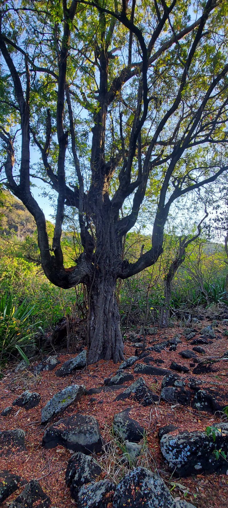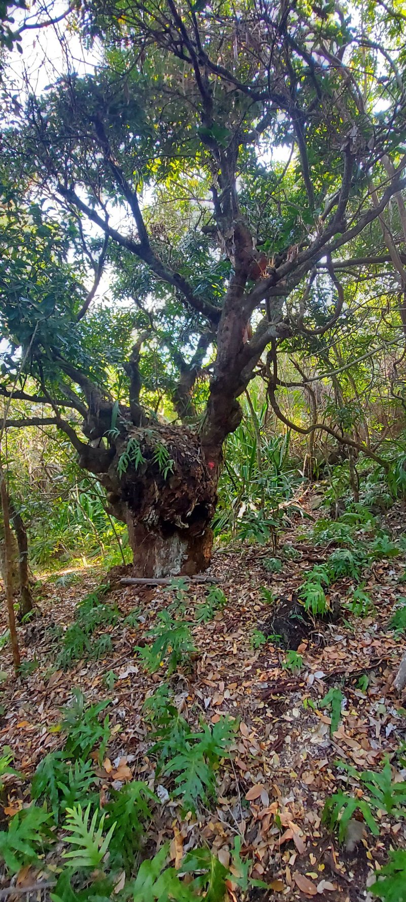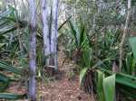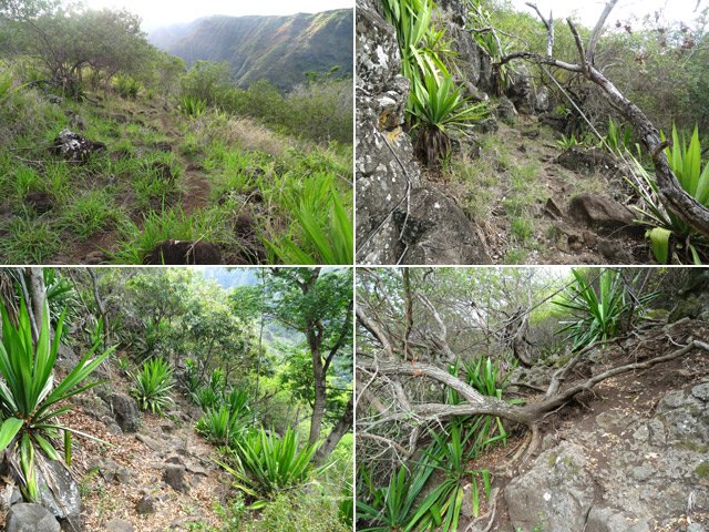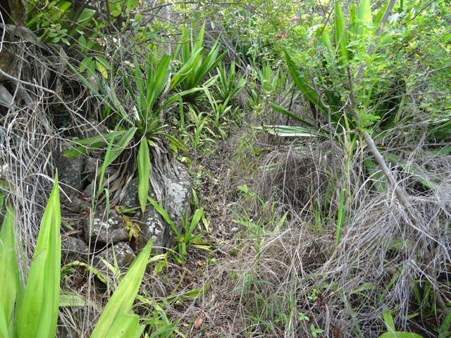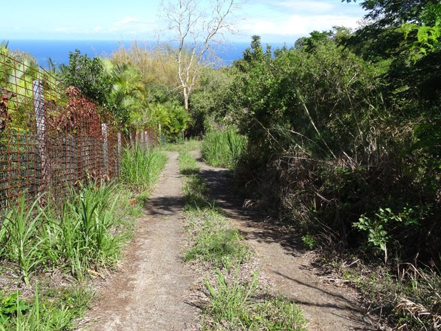 Une trace remarquée lors de la boucle utilisant une partie de la Crête des Lataniers a été le facteur déclenchant de recherche de cette nouvelle sortie dans la région du Verger Rosthon. L'équipe d'entretien des sentiers de la région, interrogée au sujet de cet itinéraire a précisé qu'il est prévu de le réhabiliter au même titre que ceux présentés sur d'autres circuits partant du verger. Le problème actuel semblerait provenir d'une personne vivant dans les hauts de la Petite Ravine des Lataniers. L'intéressé, rencontré lors de cette boucle semble un peu singulier, parle seul, très fort, et donne de loin l'impression que trois ou quatre personnes dialoguent en même temps dans sa case en tôle où il vaut mieux ne pas le rencontrer. Il faut absolument l'éviter car ses réactions semblent totalement imprévisibles et la meilleure solution consiste à passer son chemin sans chercher seulement à l'apercevoir. Pour cela, tourner immédiatement à gauche sous les filaos (voir § suivant) et ne remonter vers la droite sous aucun prétexte. Les randonneurs à l'esprit un peu aventurier effectueront cette boucle avec plaisir. Les autres attendront le nettoyage complet du sentier qui donne l'occasion de magnifiques panoramas sur les hauts des Ravines des Lataniers, sur le Port et la région de Saint-Paul. Le retour emprunte une assez longue portion de route mais traverse de très agréables lotissements par de longues descentes reposantes.
