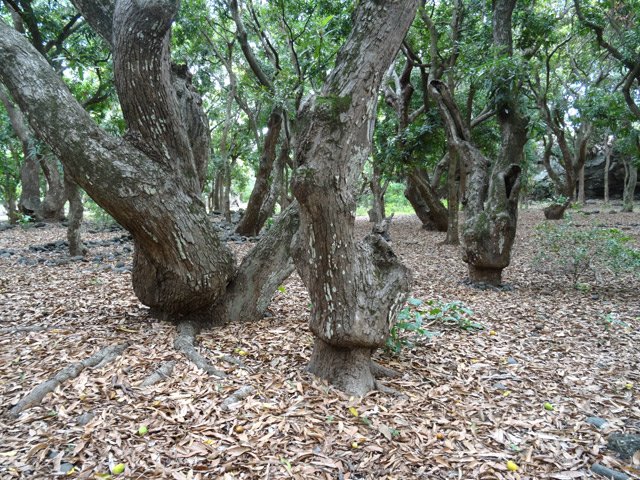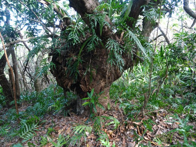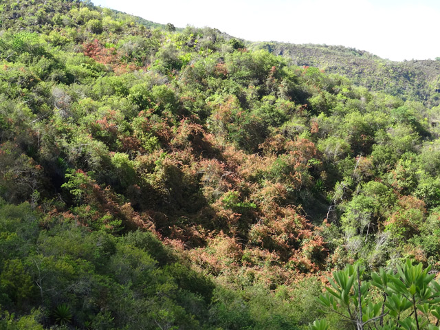 J'ai déjà parlé sur d'autres fiches de cette liane très envahissante présente dans le Nord et l'Ouest de l'île. La liane papillon ou liane de cerf (Hiptage benghalensis (L.) Kurz.) envahit des pans de remparts au point de les envahir totalement. En fin d'année, ses nouvelles feuilles tendant vers le rouge, permettent de la voir de loin et ainsi de se rendre compte du danger qu'elle représente pour toute la végétation qu'elle recouvre avant de l'étouffer et de la remplacer. Sachant qu'il en est de même de la vigne marronne, des bringeliers, goyaviers ou galaberts dans les autres régions, on peut facilement imaginer ce que seront nos forêts de bois de couleurs dans quelques décennies. Considérons-nous comme chanceux d'avoir pu arpenter les sentiers réunionnais avant que toutes ces nouvelles plantes ne fassent partie de notre univers. Sachant que c'est le plus souvent l'homme qui est à l'origine de ces colonisations végétales, espérons que les quelques sentiers botaniques encore en bon état le demeureront pour longtemps encore à titre de mémoire du passé.